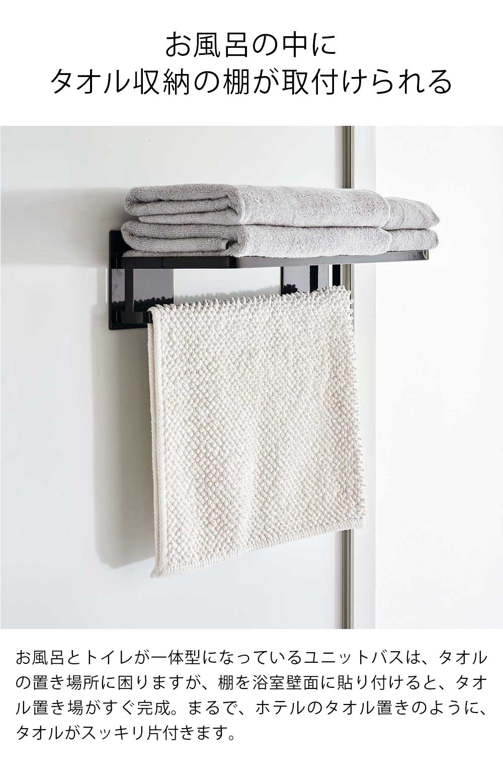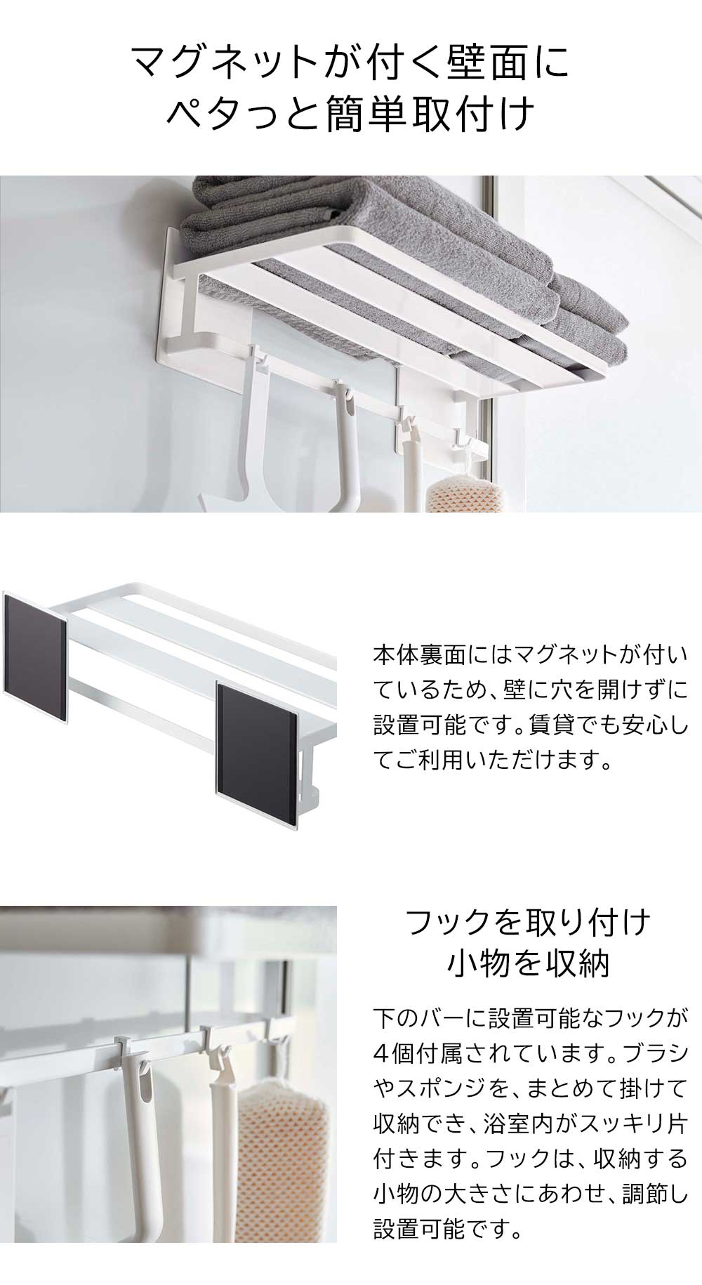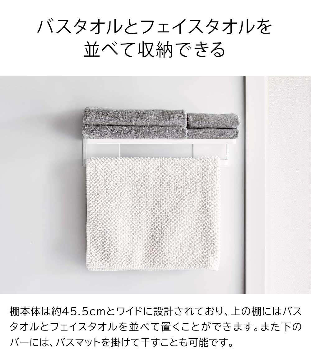 タオル類をスッキリ収納 お風呂とトイレが一緒になっているユニットバスは、タオルの置き場所に困りますが、マグネットバスルームバスタオル棚は、バスタオルとフェイスタオルが一緒に置け、ホテルのタオル置きのようにスッキリ片付きます。また、お風呂の外に出ずに身体を拭くことができるので、冬場は寒い思いをしなくてすむ、嬉しいアイテムです。約45.5cmと幅が広いので、下のバーにバスマットをかけて干すことも可能です。下のバーには、付属のフックも取り付けられ、バス小物をまとめて吊り下げ収納することもできます。また取り付けも簡単で、本体にマグネットがついており、マグネットのつく平らな面・スチール壁面にペタッと付けて取り付け完了、すぐにご利用いただけます。 ![]() ![]() ![]() ![]() ![]() ![]() ![]() ![]() ![]() ![]() |