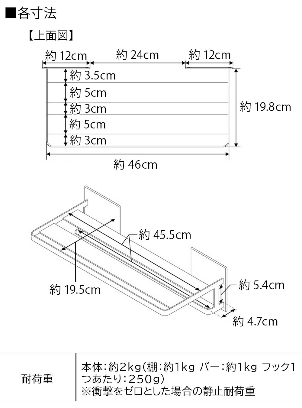 約2kg (棚:約1kg バー:約1kg フック1つあたり:約250g)