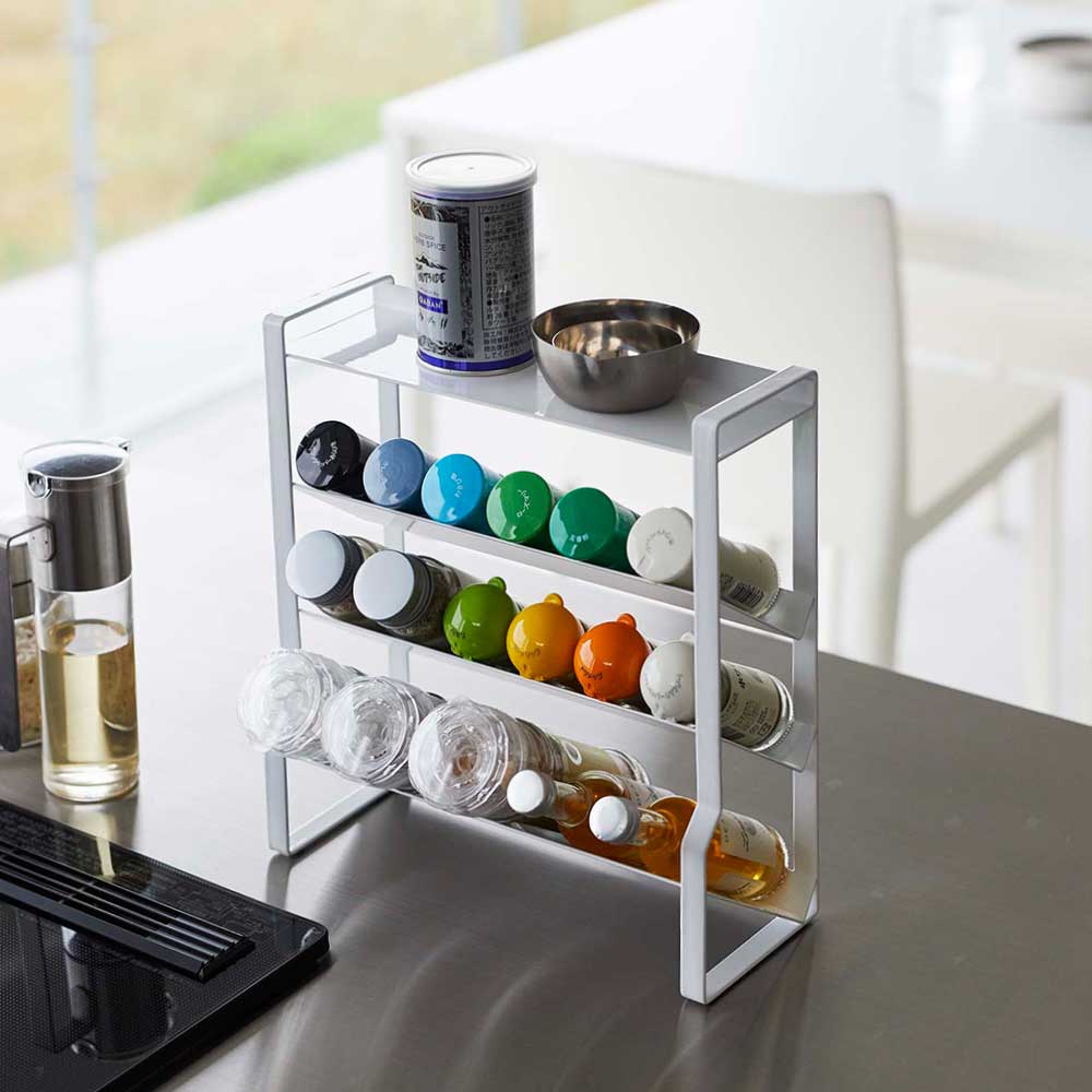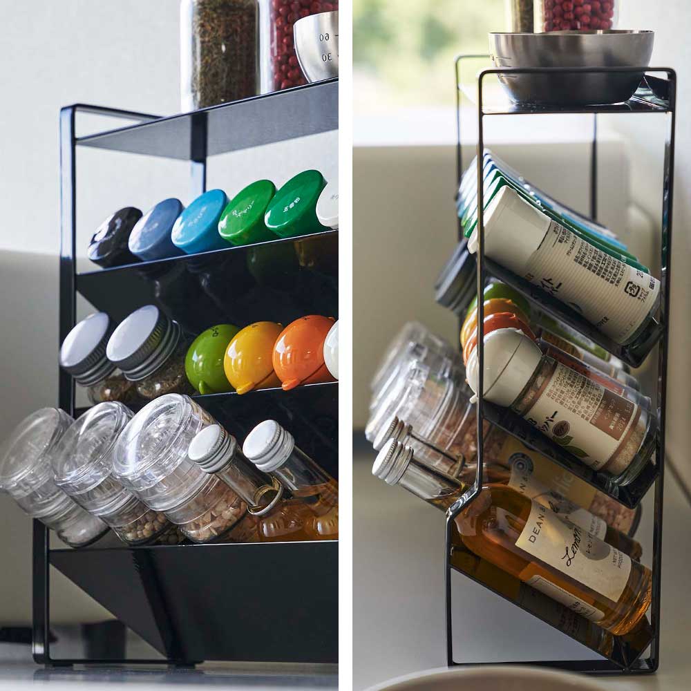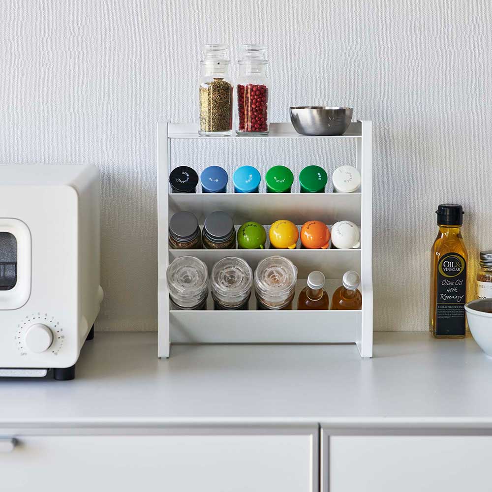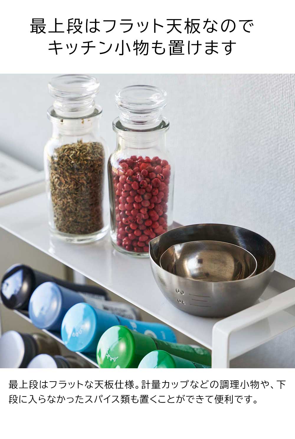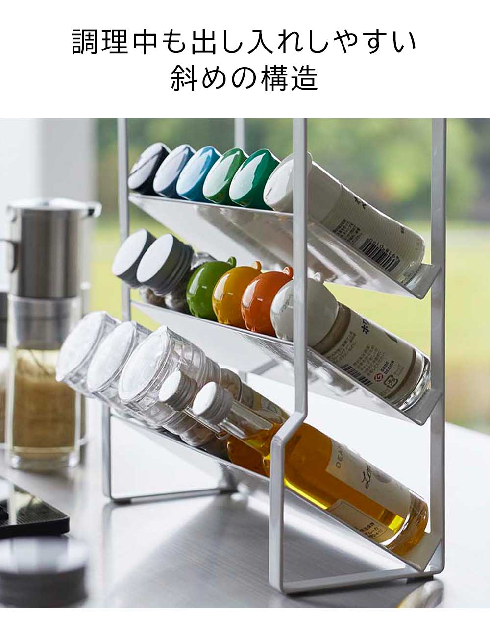 キッチンをスッキリ綺麗に 気づくと増えているスパイス類をスッキリとまとめて、しかもスリムに収納できる4段のスパイスラック。奥行約9.5cmと、とてもスリム。コンロ横・奥やキッチンカウンターなど様々な場所に置いて使えます。また、斜め構造になっているので調理中も取り出しやすくお料理もスムーズに。2,3段目は小瓶タイプのスパイス類を、一番下の段は少し大きめのミル付きスパイス類など、様々な種類のスパイス、調味料を収納できます。一番上はフラットな天板なので、下段に入りきらないスパイス類や調理小物を置いたりも◎ スッキリと使いやすいキッチンにオススメのアイテムです! ![]() ![]() ![]() ![]() ![]() ![]() ![]() ![]() ![]() ![]() |