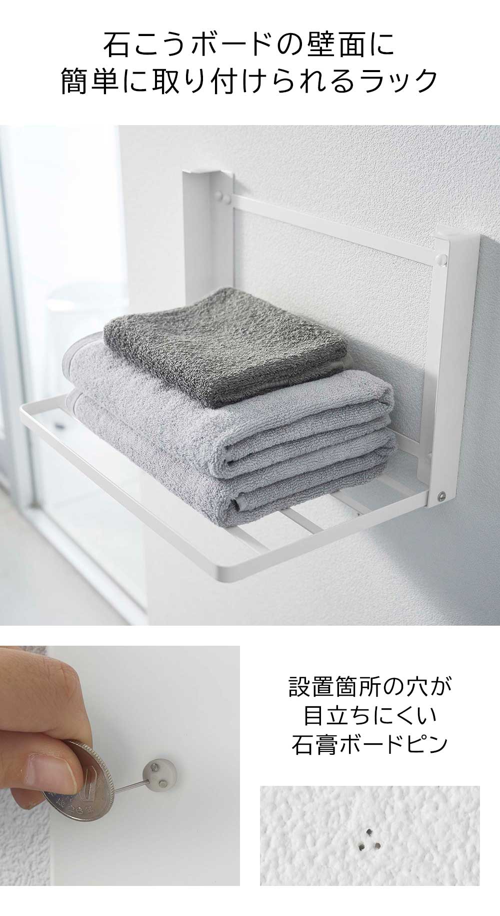 石膏ボードピンで簡単取付け 石膏ボードへ設置できる壁面収納ラック。石膏ボードピンで設置ができるので、ラックを外した後の穴が目立ちにくいです。脱衣所に取り付ければ、お風呂あがりに使いたいバスタオルやパジャマの一時置き場として使え便利です。また、ラックを使わない時は折り畳んで収納できるので、狭い脱衣所でも場所を取りません。ラック以外にも、タオルハンガーとしても使用可能な折り畳み棚です。 ![]() ![]() ![]() ![]() ![]() ![]() ![]() ![]() ![]() ![]() ![]() |