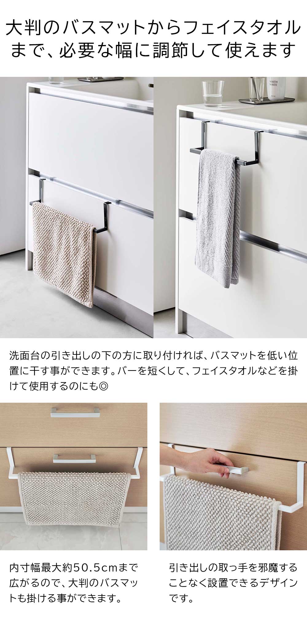 バスマットの収納場所を バスマットの収納場所はお決まりですか? バスマットを掛ける場所は、タオルバーのように住宅に標準で付いている事も少ないですので、バスマット使用後の収納場所に困っている方も多いのではないでしょうか? こちらの「バスマット&タオルハンガー タワー」があれば、ご自宅の洗面台の扉や引き出しに引っ掛けるだけでバスマットの収納場所を作る事ができます。 バーが伸縮できるので、洗面台のサイズや、掛ける物の大きさに合わせて長さを調整し、設置する事ができます。 フェイスタオルを掛けるために使用するのも◎ とてもスリムなデザインですので、狭い脱衣所でも場所を取ることなく使用する事ができます。 ![]() ![]() ![]() ![]() ![]() ![]() ![]() ![]() ![]() ![]() |