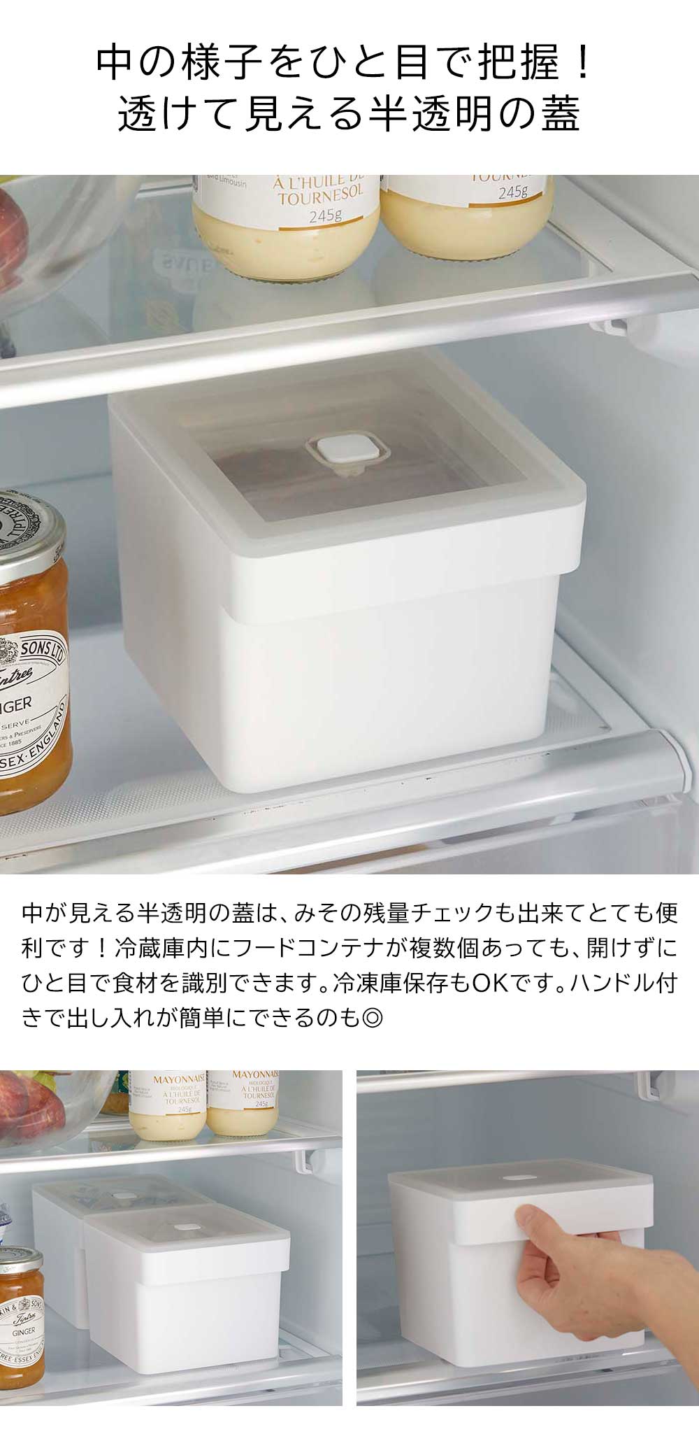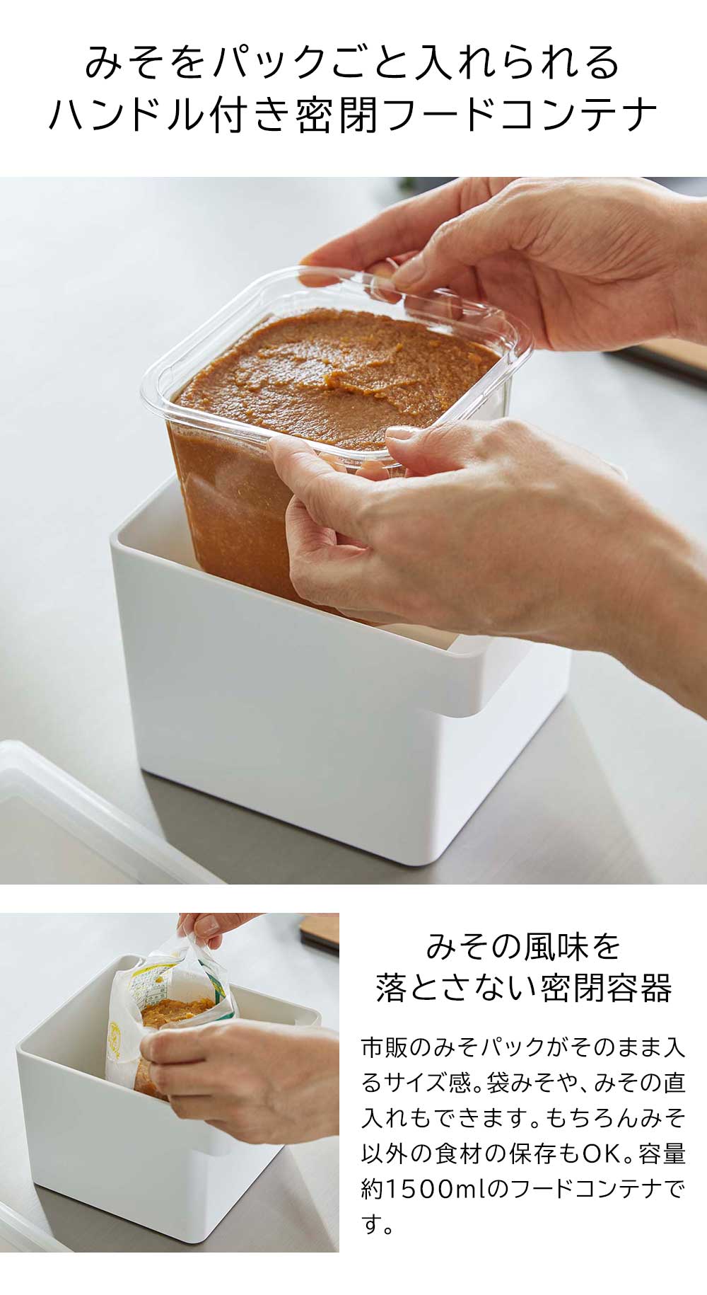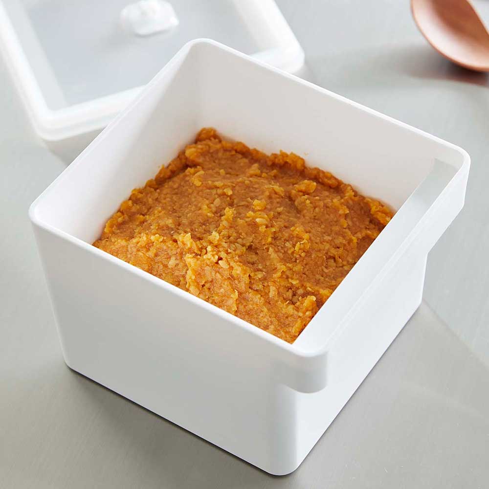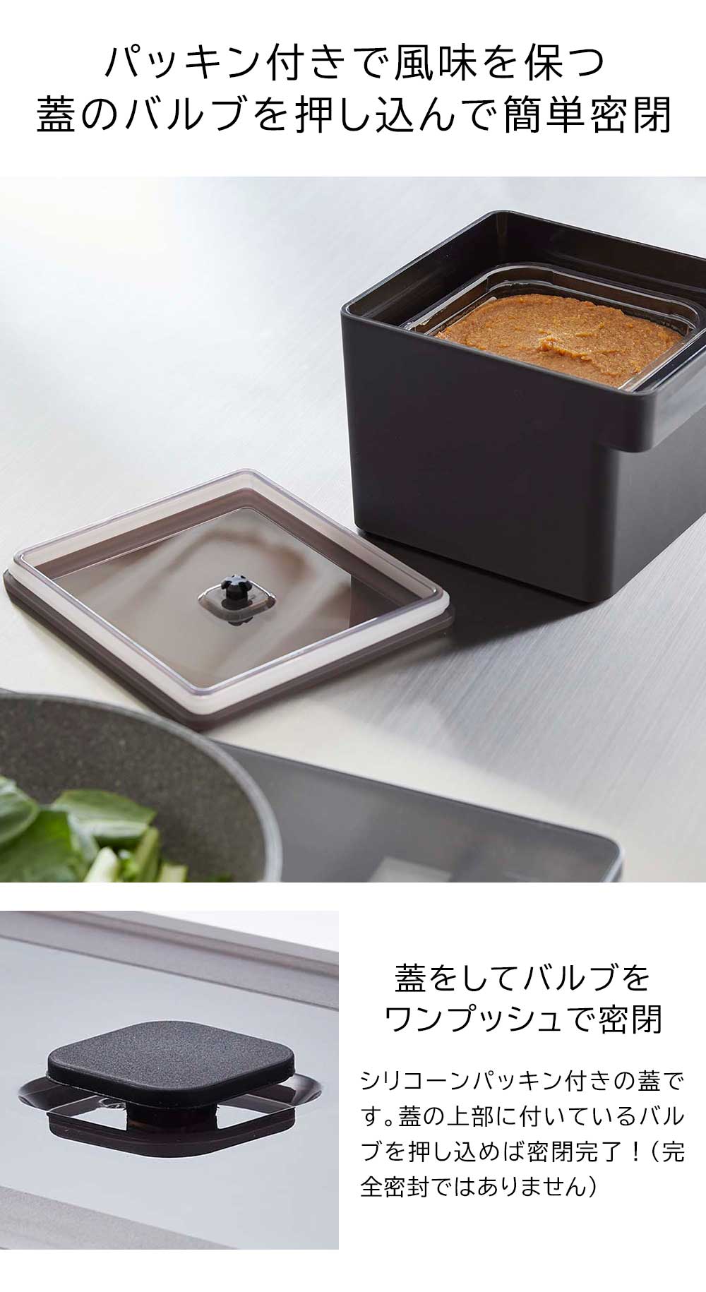市販のみそを密閉保存! 市販のみそパックや袋みそを、そのまま収納できる、内寸W13×D13cmのフードコンテナです。 シリコーンパッキン付きの蓋の上部にはバルブがあり、それをワンプッシュするだけで簡単に密閉ができ、みその風味を落とさずに保存できます。 手前には取っ手がついており、冷蔵庫から出し入れする際に大変便利!半透明の蓋で中が透けて見えるので、中身の把握も簡単です。 もちろん、みそ以外の食品の保存にも使えますので、作り置き用の保存容器としても大活躍!約1500ml容量でたっぷりと入ります。 こちらのフードコンテナは、食洗機・電子レンジ・冷凍OKで、パーツもすべて分解して洗えます。食品保存容器に欲しい機能がギュッと盛り込まれたフードコンテナです。 ![]() ![]() ![]() ![]() ![]() ![]() ![]() ![]() ![]() ![]() ![]() |