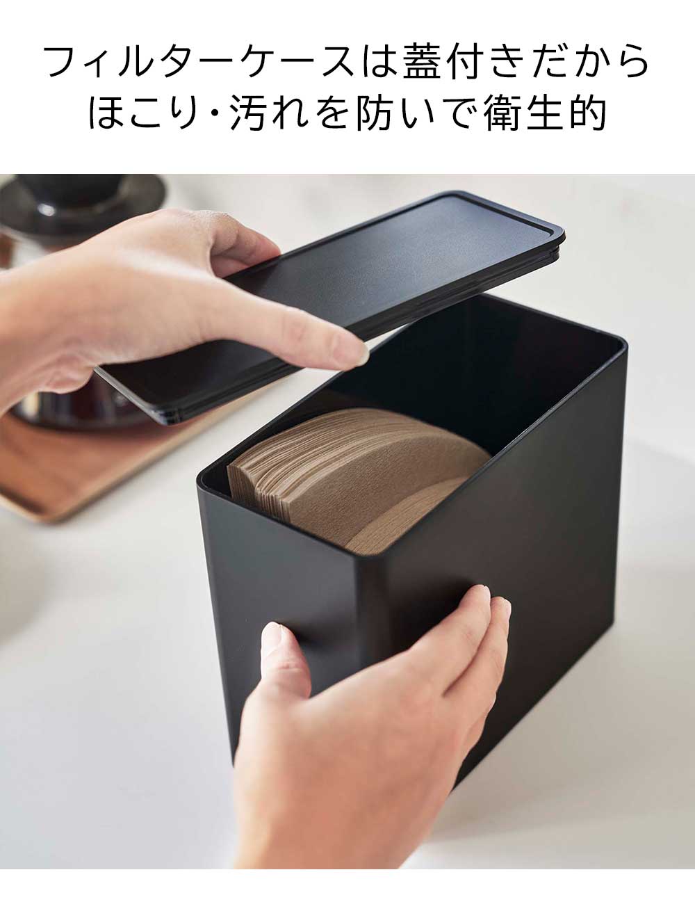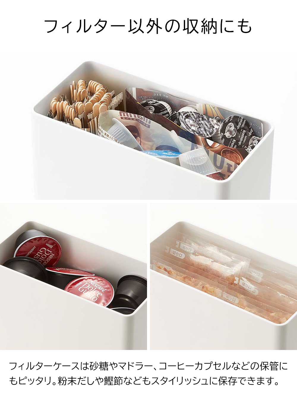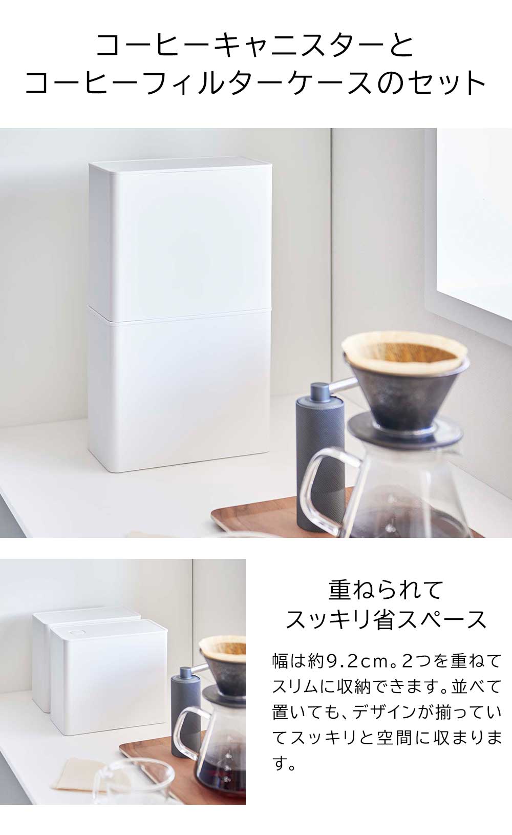 コーヒー用品をスッキリ収納 コーヒー粉を保存するキャニスターとコーヒーフィルターケースを重ねて省スペースに収納できます。おそろいのデザインなので、横に並べて置いてもスッキリ。キャニスターは底にひと工夫あり、粉が最後まできれいにすくえます。付属のメジャースプーンも角度がついていて簡単にすりきり1杯(約10g)が量れて便利です。バルブを押すだけで簡単に密閉でき、コーヒーの劣化を防ぎます。フィルターケースは扇型・円すい形どちらの形も収納でき、海外の大きなサイズにも対応。収納枚数は約200枚と大容量です。蓋付きなのでほこりやゴミを防いで衛生的に保存できます。コーヒーカプセルや砂糖、マドラーなどの収納にもぴったりです。 ![]() ![]() ![]() ![]() ![]() ![]() ![]() ![]() ![]() ![]() ![]() ![]() ![]() ![]() |