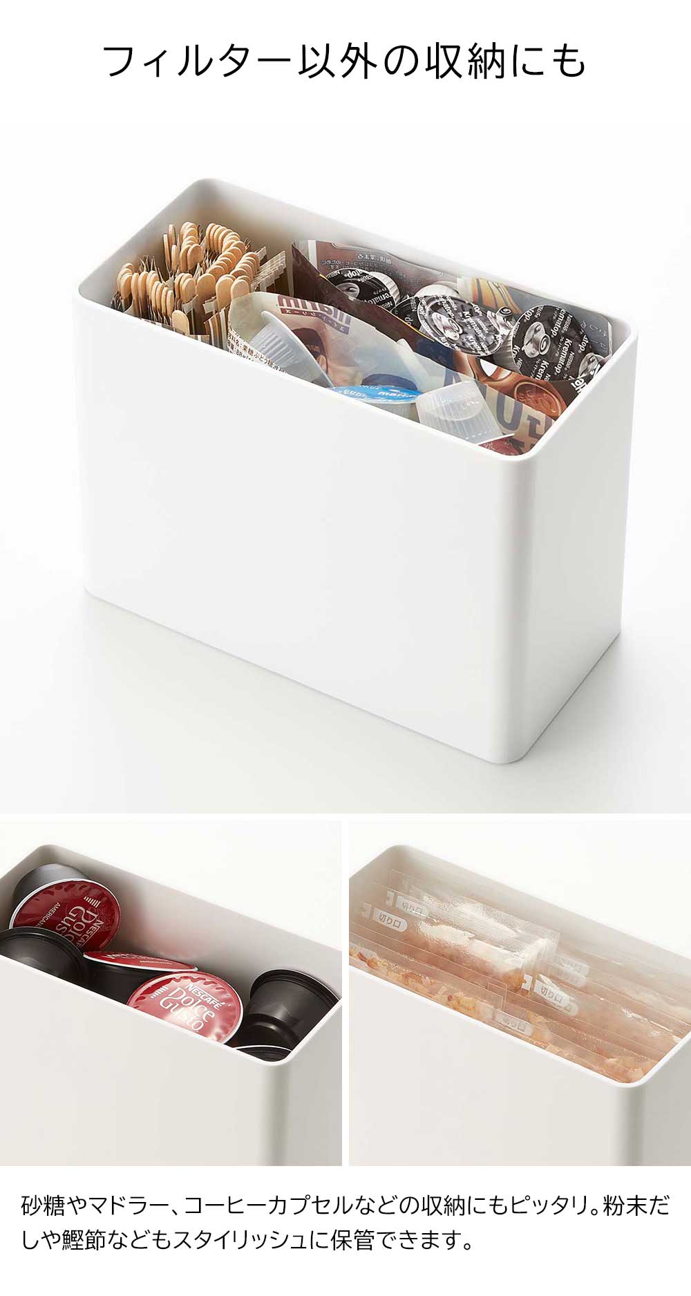 コーヒーフィルターを コーヒーフィルターは買った時に入っていた袋や箱に入れたまま使われる方も多いのでは? でも、専用のコーヒーフィルターケースに入れておくと1枚づつが取り出しやすく、ほこりやゴミを防いで衛生的にお使いいただけます。こちらのケースは扇型・円すい形どちらの形も収納でき、海外の大きなサイズにも対応。容量も約200枚とたっぷりなのでたくさん収納ができて、頻繁に補充する手間が省けます。コーヒーフィルターだけではなく、コーヒーカプセルや砂糖、マドラーなどを入れておくのにもぴったり。出しっぱなしでもサマになるスタイリッシュなデザインです。 ![]() ![]() ![]() ![]() ![]() ![]() ![]() ![]() ![]() ![]() |