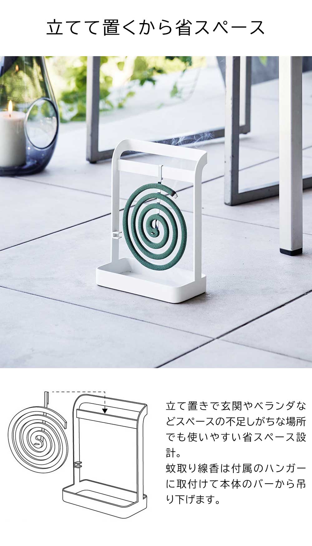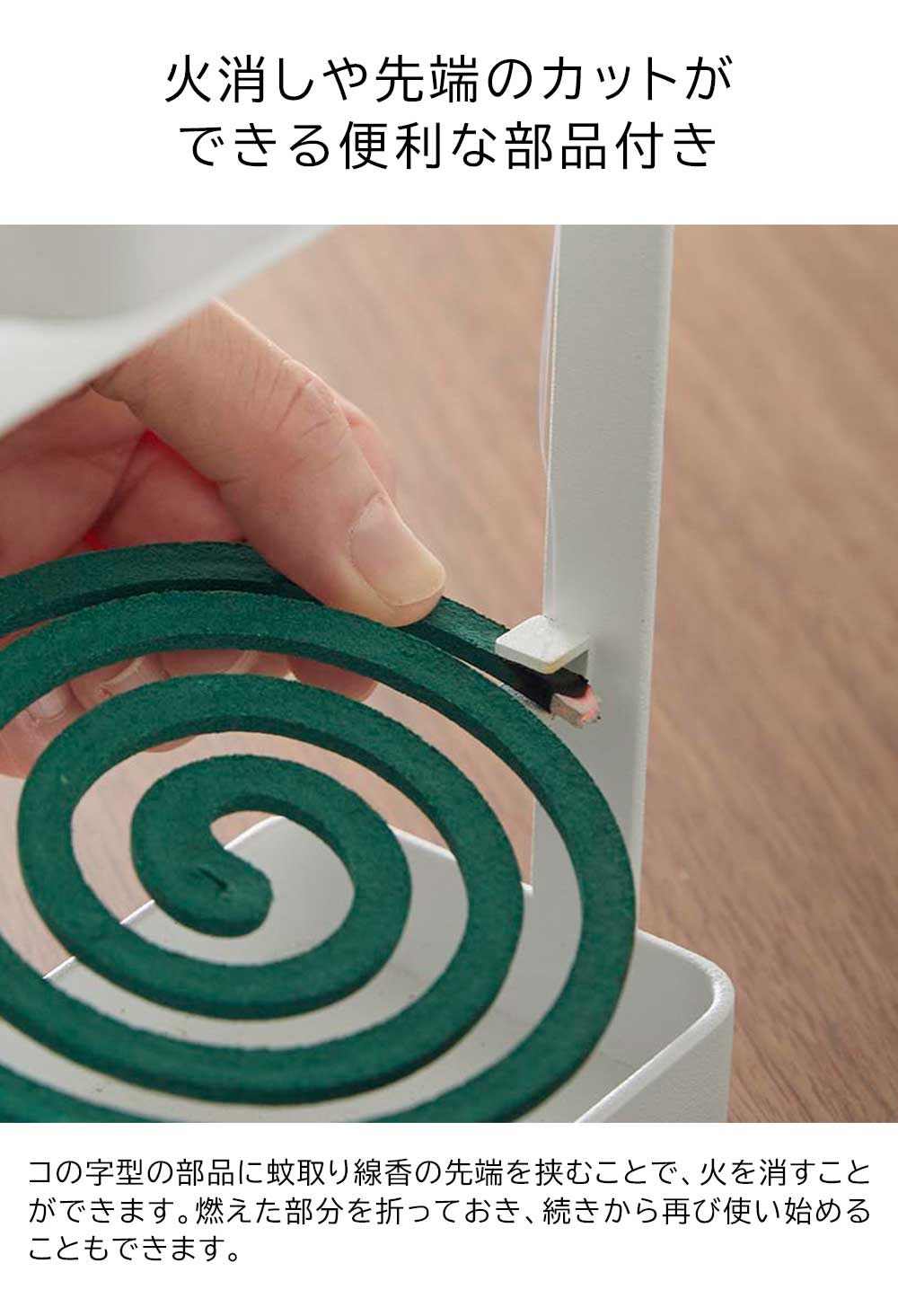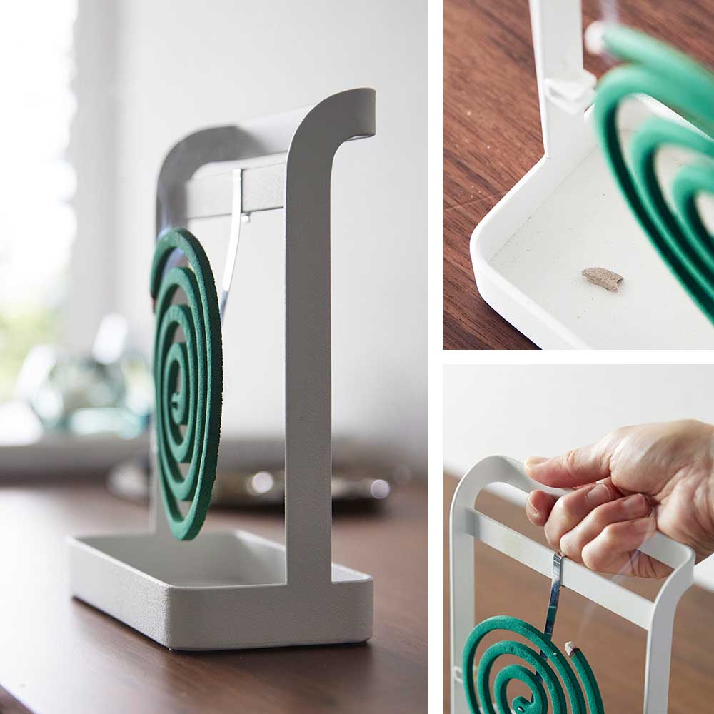 夏の必須アイテム「蚊取り線香」を吊るして使える、蚊取り線香ハンガー。立て置きなので省スペースで玄関やベランダなどでの使用にもおすすめです。サイドにあるコの字部分で火を消したり、燃えた先端部分を折り、続きから使えるようにしておくことができます。持ち運んでも色々な空間になじみやすいシンプルなデザインでお香立てとしてもお使いいただけます。