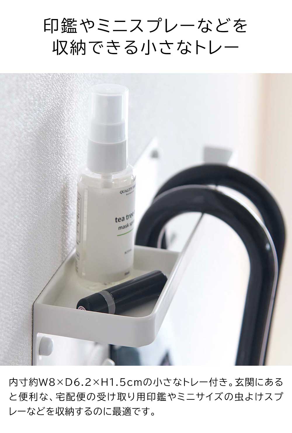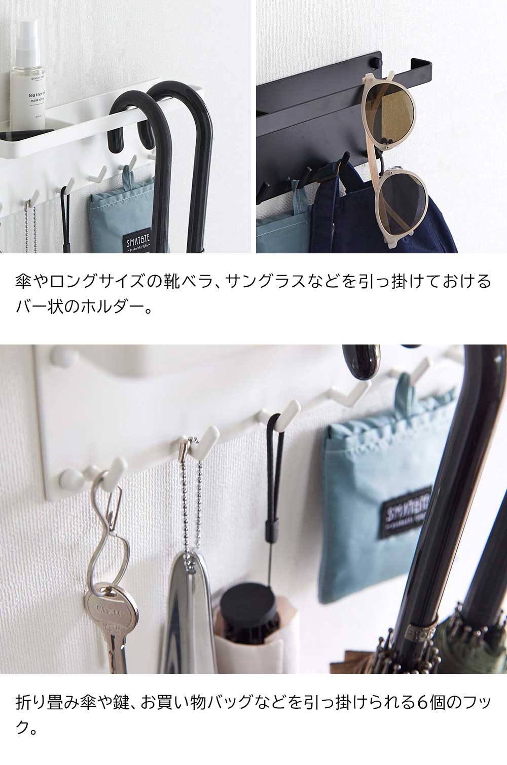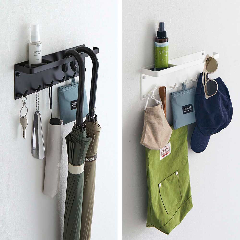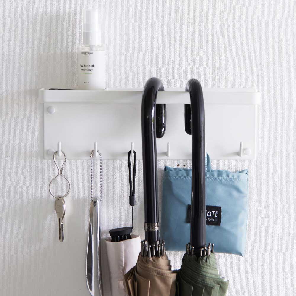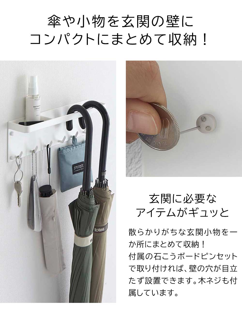 傘や玄関小物をまとめて収納 玄関まわりには置きたいアイテムが意外とたくさんあり、雑然としているように見えることもしばしば。 毎日のお出かけ時に必要な物が一か所に整然とまとまっていると、見た目もスッキリ、忘れ物もなくスムーズに出かけることができます。 このアンブレラホルダーには、傘が掛けられるバーと6個のフックがついており、大小さまざまなアイテムを引っ掛け収納できます。印鑑などが収納できる小さなトレーも付いており、宅配便の受け取り時にも大変便利です。 こちらの商品は壁面設置タイプ。四隅をしっかりと固定するので、使用時も安定感抜群です!付属の石こうボードピンを使用すれば、壁の穴が目立ちにくく、賃貸住宅の方も安心して取り付けることができます。 ![]() ![]() ![]() ![]() ![]() ![]() ![]() ![]() ![]() ![]() |