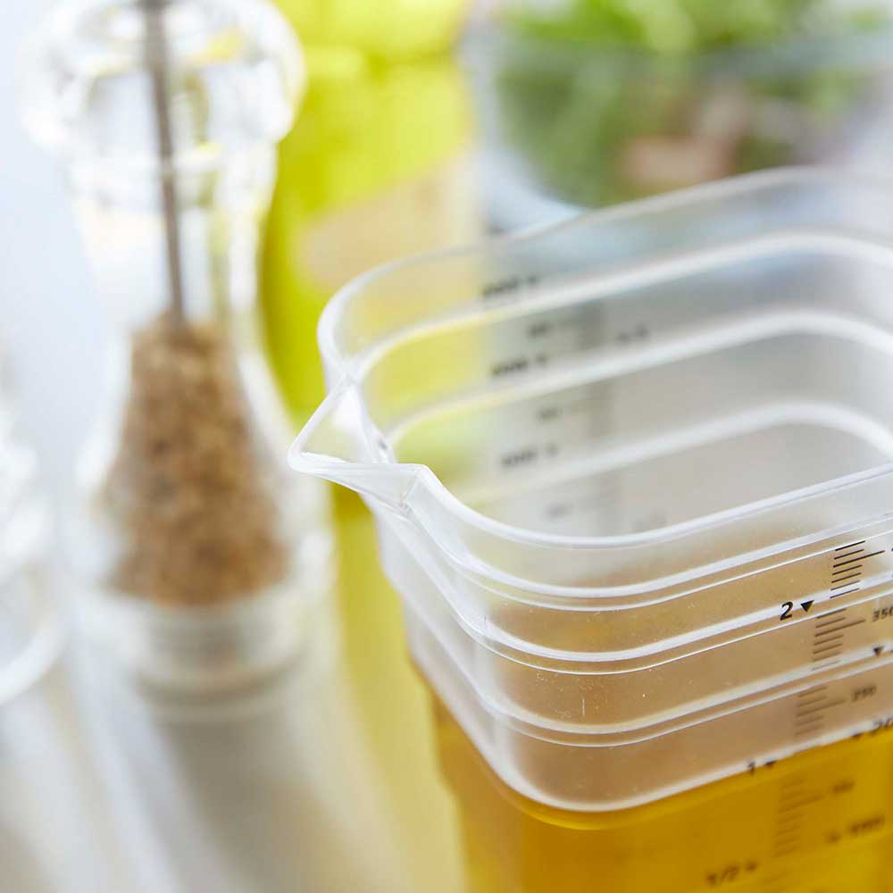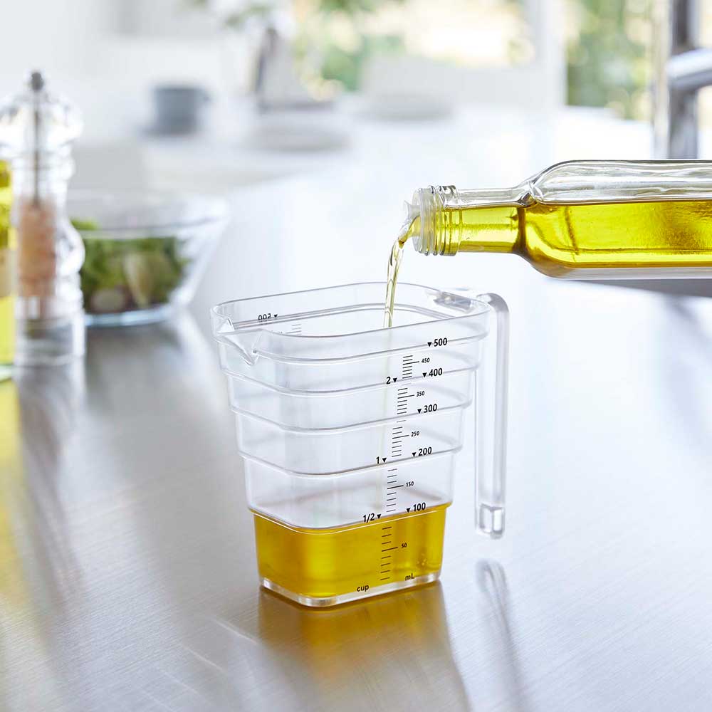 壁に浮かせて収納できるマグネット内蔵の計量カップ500ml。浮かせる収納で水切れも良く衛生面も安心です。上から見て一目で計量できる段々の形状だから、調理中でもサッと使える便利な設計。耐熱性もあるので食洗機にも対応している点も嬉しいポイントです。