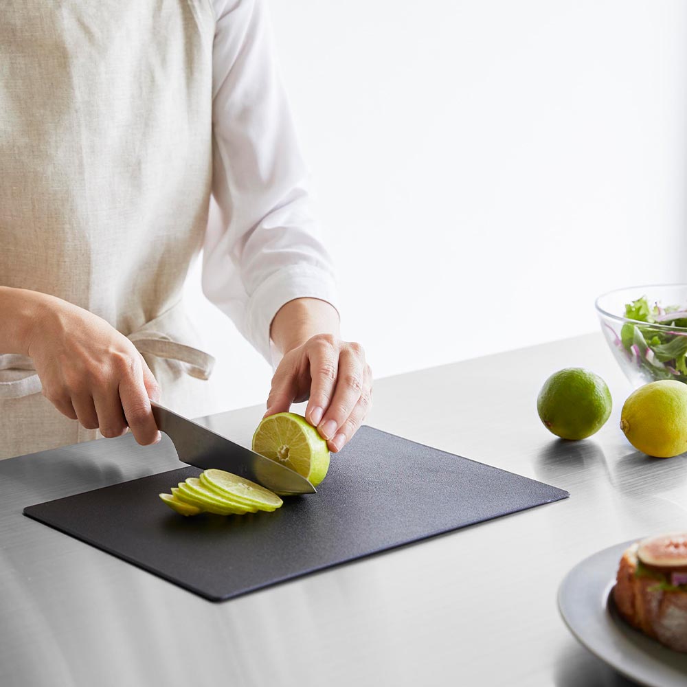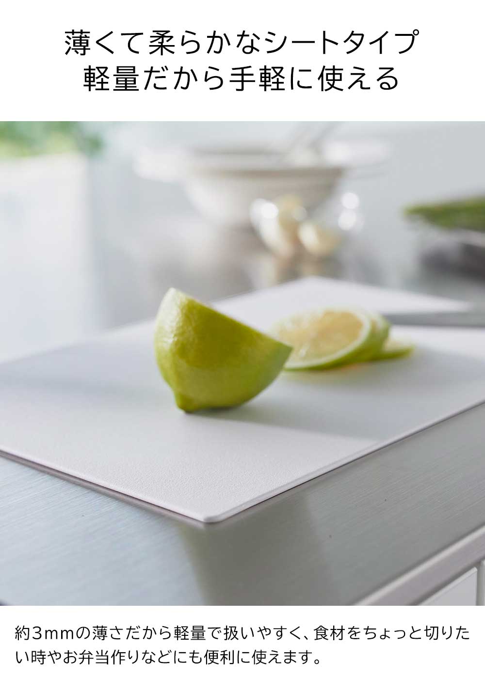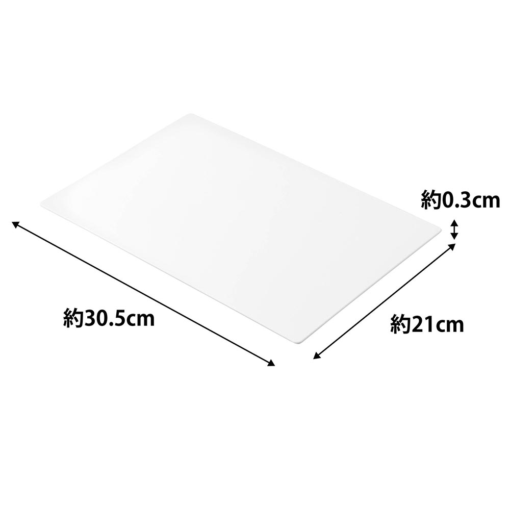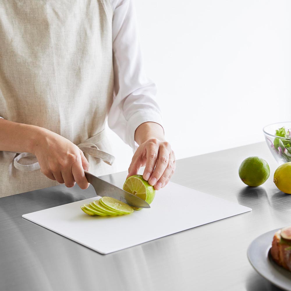 薄さ約3mmの手軽に使えるシートタイプのまな板です。表面は細かなエンボス加工が施され食材が滑りにくく、作業が捗ります。また、柔軟性があり、軽く曲げれば切った食材をまな板からお鍋やフライパンに投入しやすい設計です。SIAAの基準を満たした抗菌加工が施され、更にキッチン漂白剤対応だから清潔にお使いいただけます。