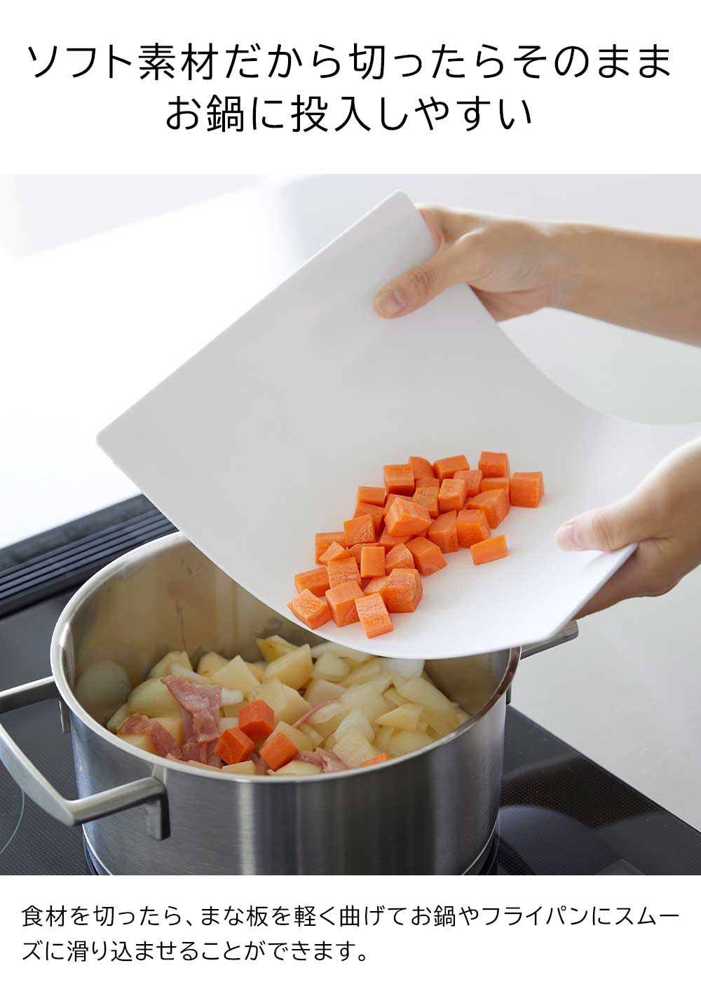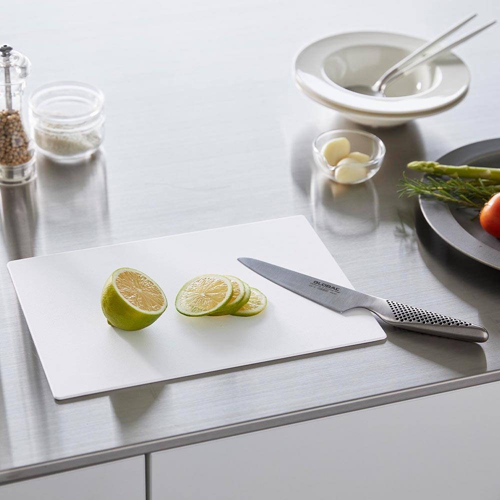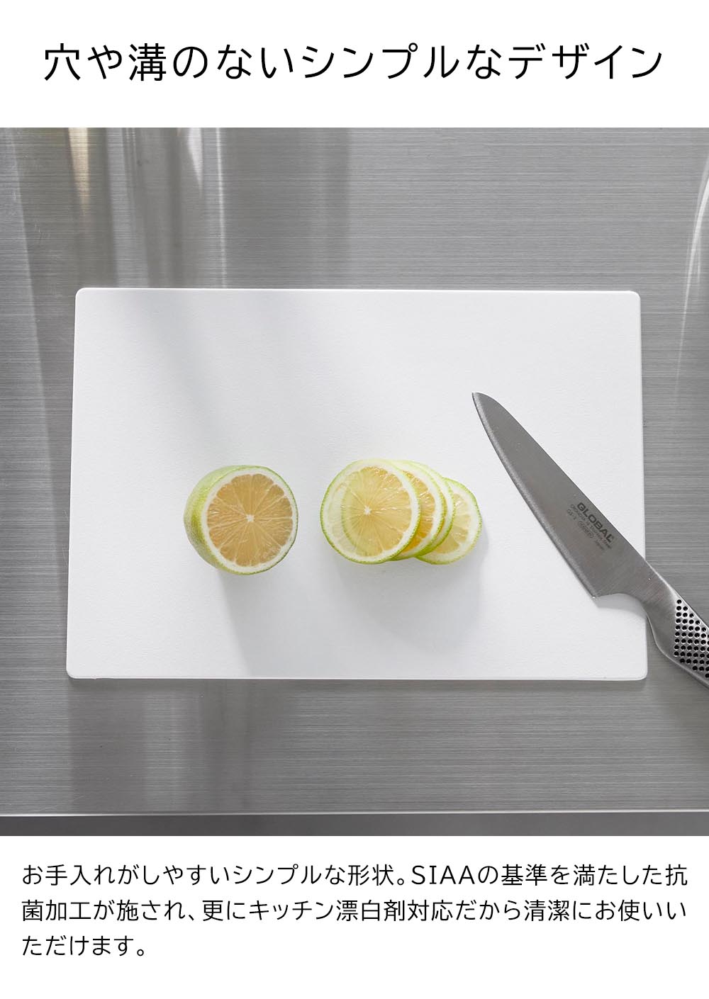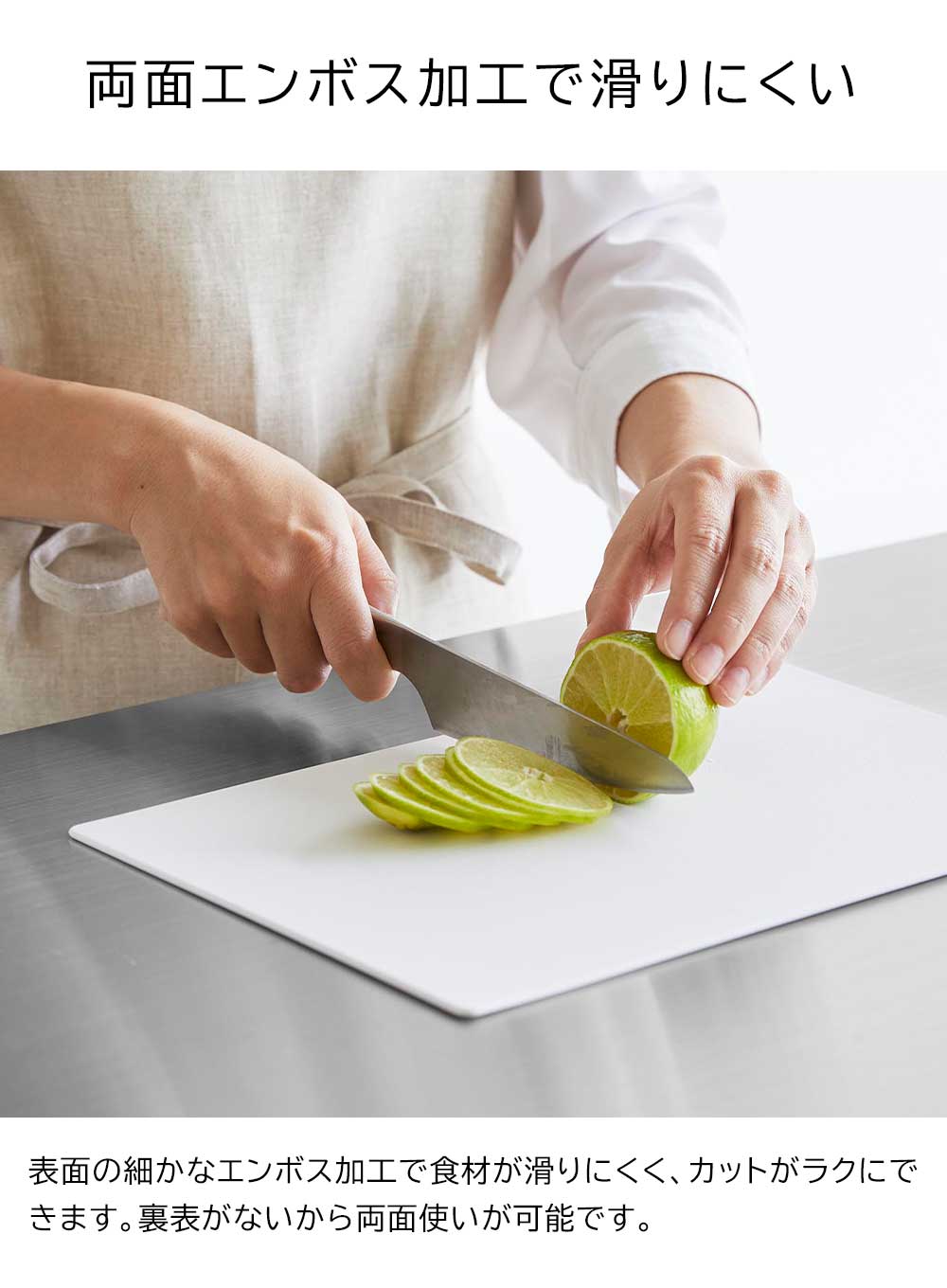 薄さ約3mmの手軽に使えるシートタイプのまな板です。表面は細かなエンボス加工が施され食材が滑りにくく、作業が捗ります。また、柔軟性があり、軽く曲げれば切った食材をまな板からお鍋やフライパンに投入しやすい設計です。SIAAの基準を満たした抗菌加工が施され、更にキッチン漂白剤対応だから清潔にお使いいただけます。
