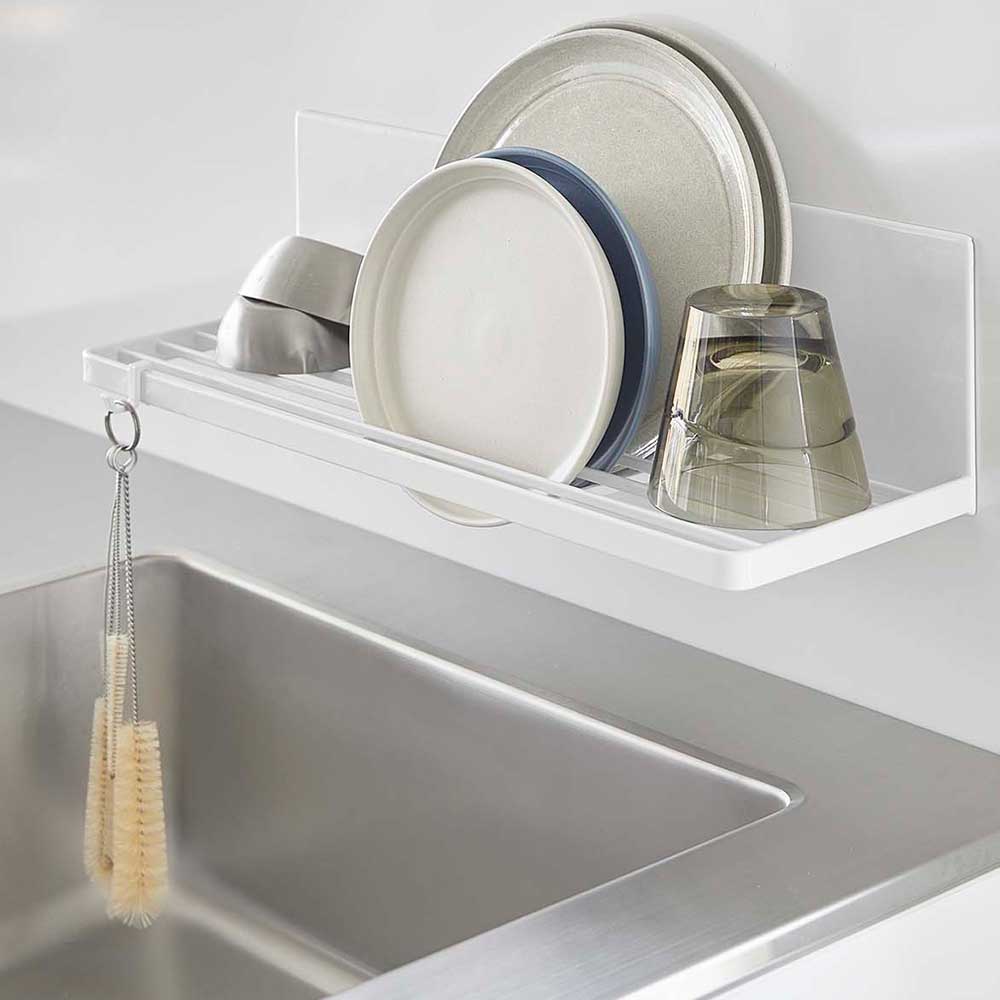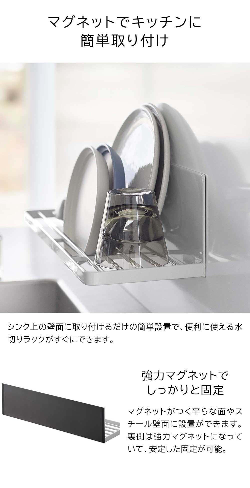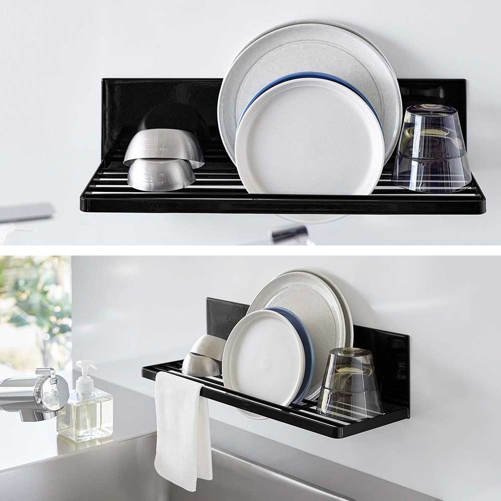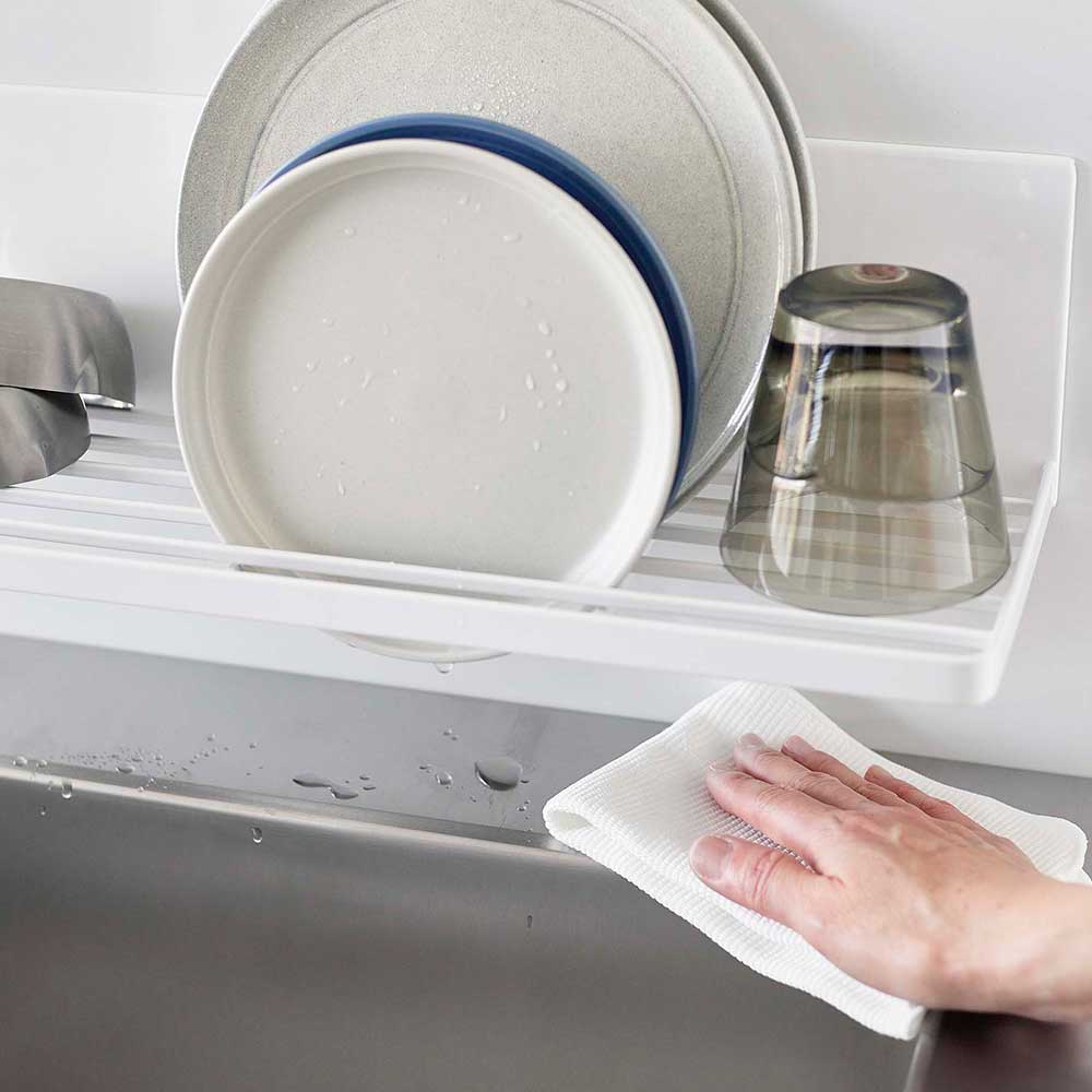 強力マグネットで簡単設置! キッチンパネルにピタッと簡単に取り付けられる水切りラックです。省スペースを利用して浮かせる収納が可能。少量の食器や調理中の洗いものを乾かせるラックがあるとキッチンを広く使えるから、普段は食洗機を使う方にもおすすめです。スリットの入った棚のような形状なので、お皿は立てて、ジャグやボトルは逆さにして、乾かすことができます。またスリットを活かして布巾を掛けて干したり、付属のフックを使って小物を引っ掛けられて便利です。 調理スペースに設置してちょい置きの棚として使えば下のスペースを有効活用できます。 ![]() ![]() ![]() ![]() ![]() ![]() ![]() ![]() ![]() ![]() |