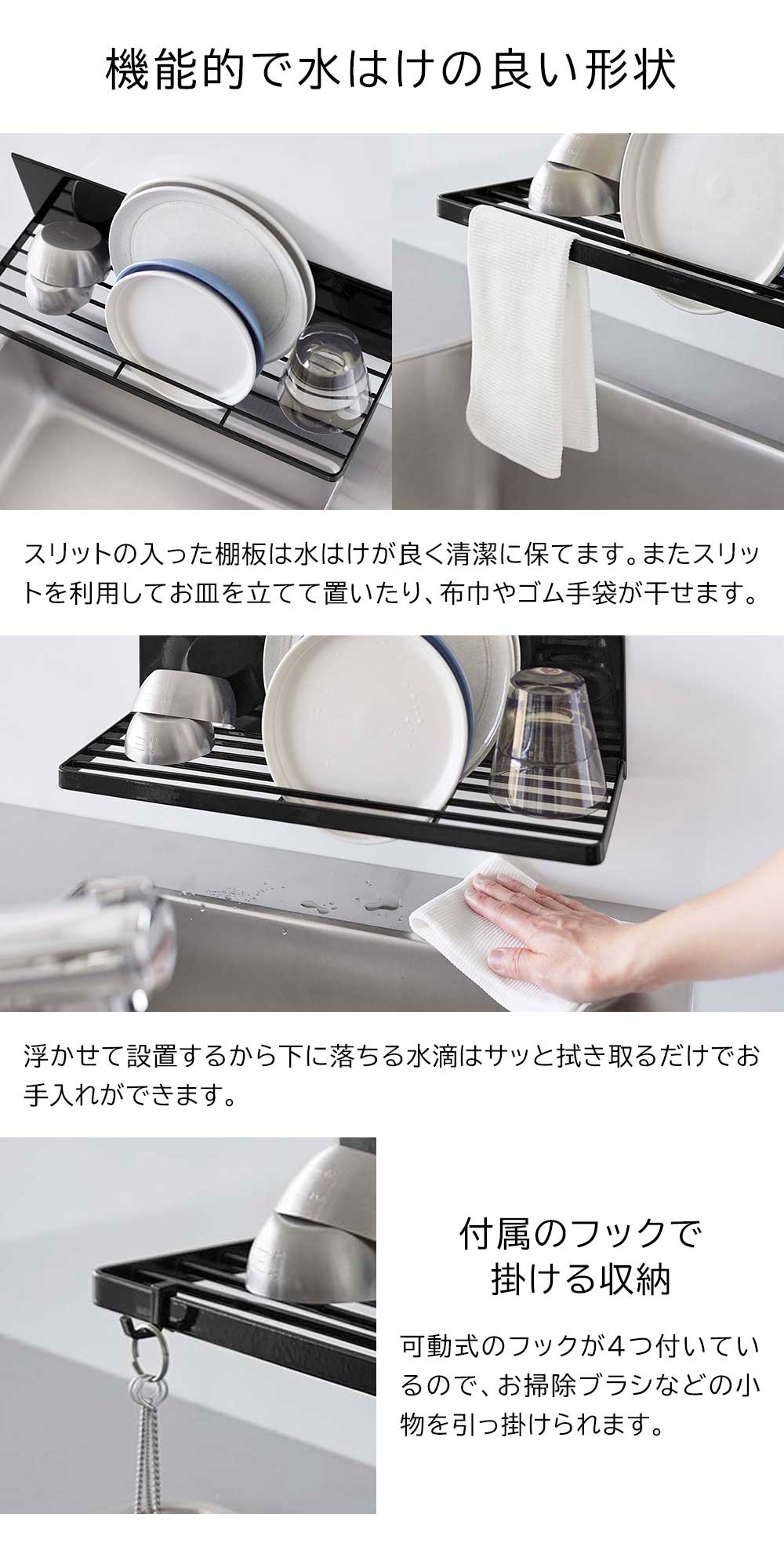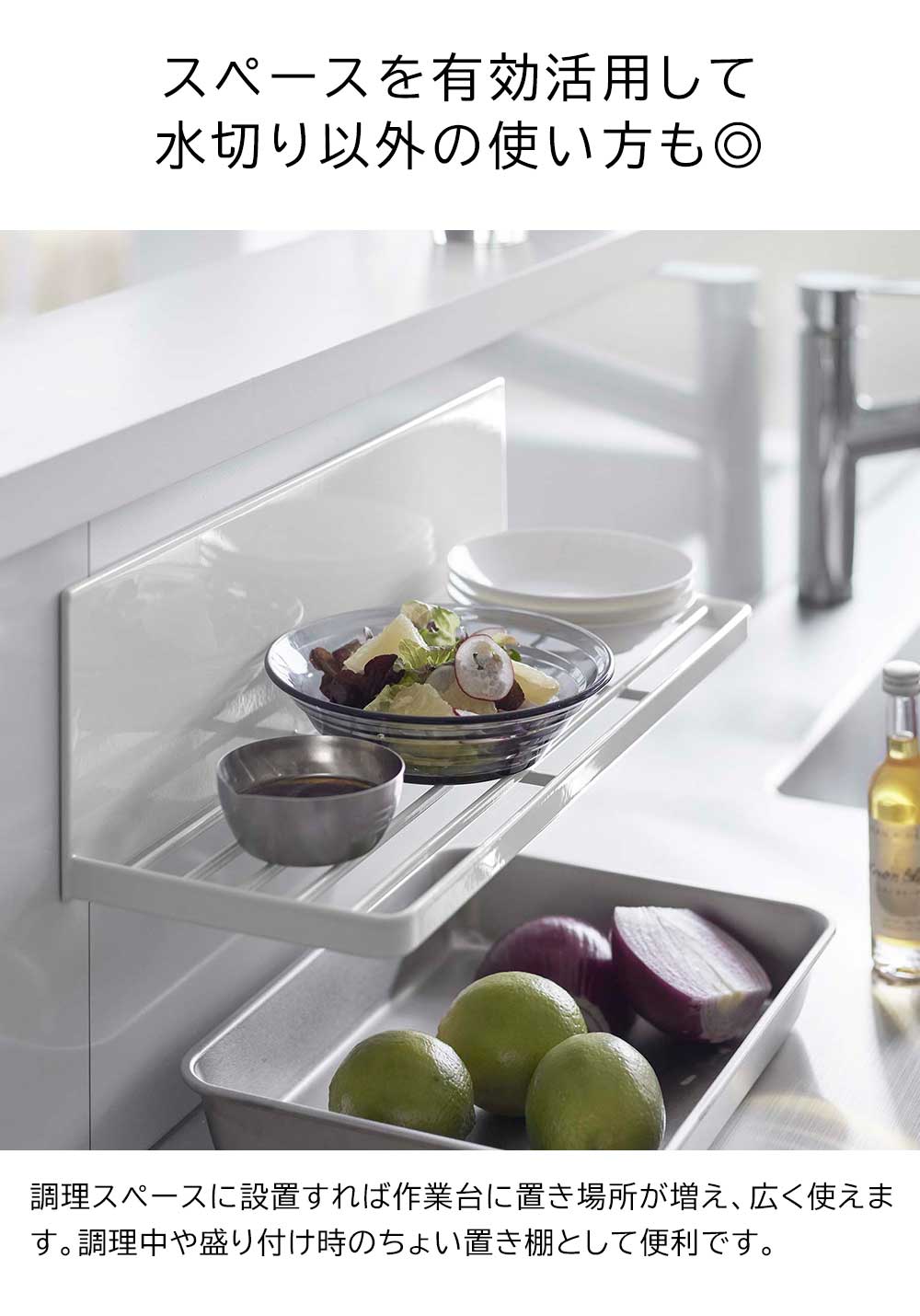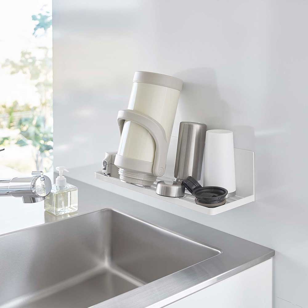 強力マグネットで簡単設置! キッチンパネルにピタッと簡単に取り付けられる水切りラックです。省スペースを利用して浮かせる収納が可能。少量の食器や調理中の洗いものを乾かせるラックがあるとキッチンを広く使えるから、普段は食洗機を使う方にもおすすめです。スリットの入った棚のような形状なので、お皿は立てて、ジャグやボトルは逆さにして、乾かすことができます。またスリットを活かして布巾を掛けて干したり、付属のフックを使って小物を引っ掛けられて便利です。 調理スペースに設置してちょい置きの棚として使えば下のスペースを有効活用できます。 ![]() ![]() ![]() ![]() ![]() ![]() ![]() ![]() ![]() ![]() |