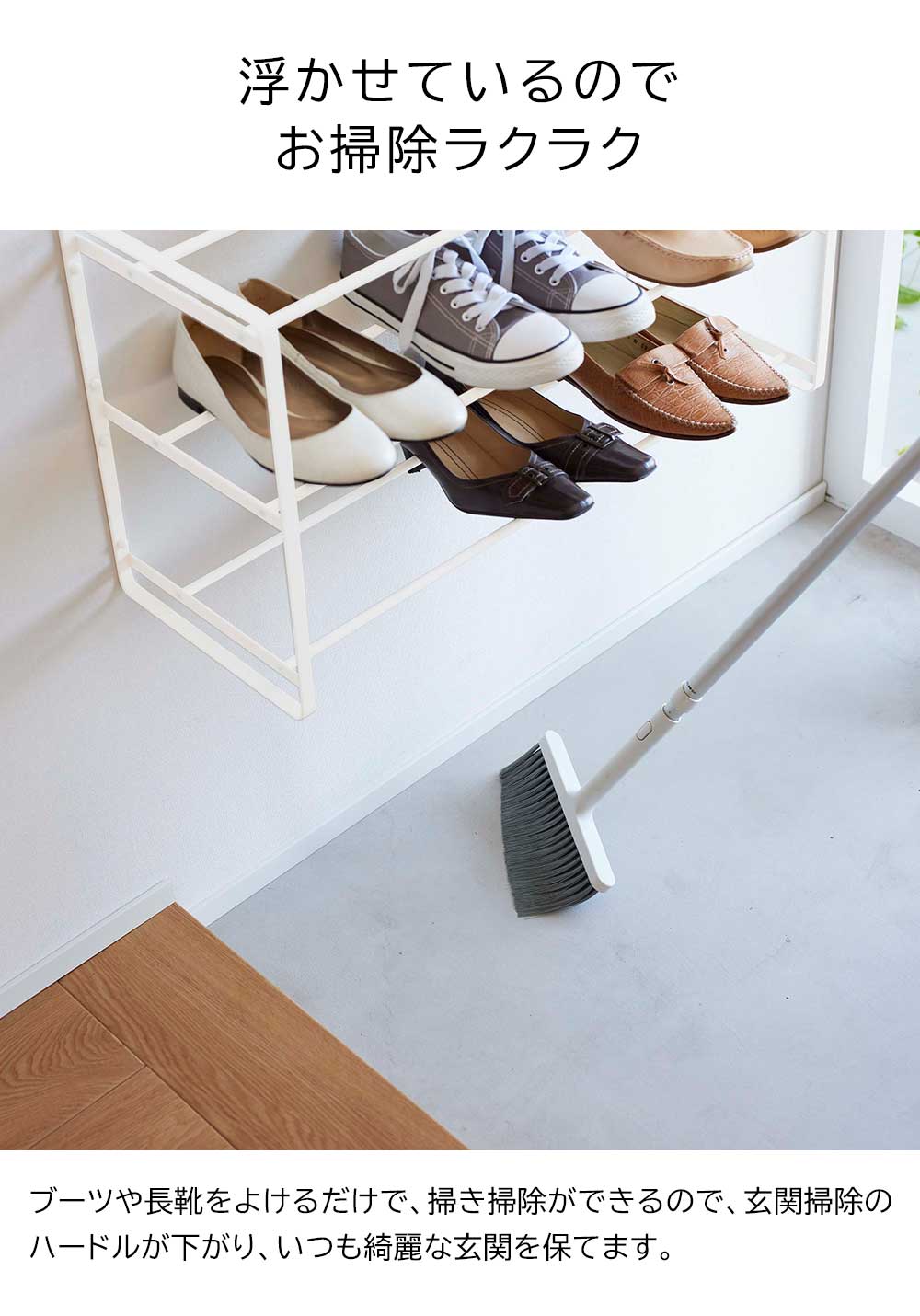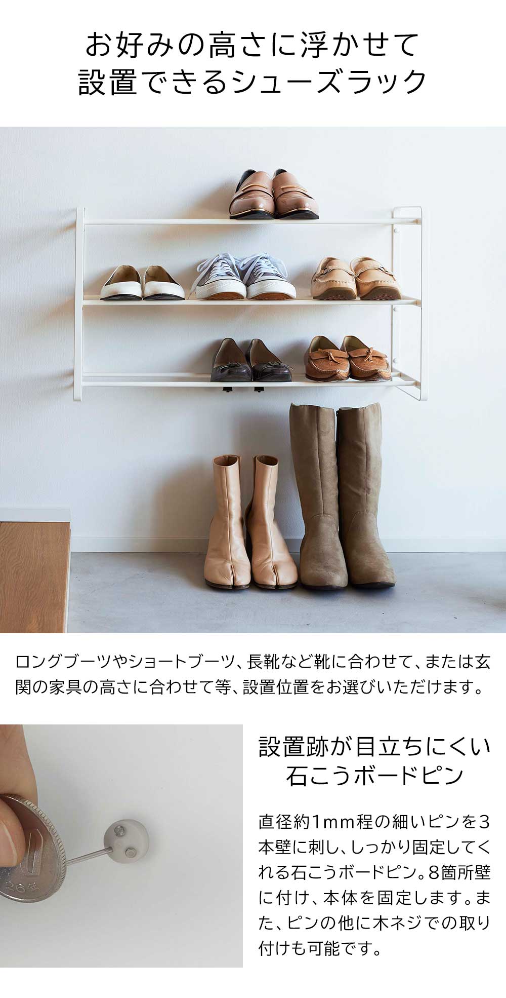 壁に浮かせて設置 直径約1mm程の細い石こうボードピンで、壁にしっかり固定できるシューズラック。ロングブーツやショートブーツ、長靴など靴の高さに合わせ取り付け可能です。浮かせて設置できるのでラックを移動する手間が省け、玄関掃除がラクに行えます。また、小物を掛けられるフックが2個付属されているので、靴ベラなどを掛けておけば、サッと取り出せて便利です。 ![]() ![]() ![]() ![]() ![]() ![]() ![]() ![]() ![]() ![]() |