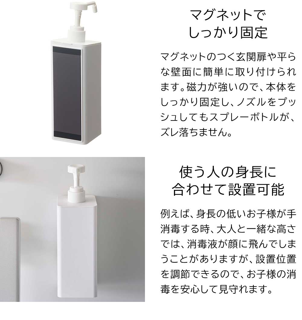 マグネットでペタっ! 玄関ドアや冷蔵庫など、マグネットがつく壁面に浮かせて設置できるアルコール・塩素系対応のスプレーボトル。ボトルを浮かせて設置できるので、下駄箱やカウンターなどの掃除の際に、ボトルを持ち上げる必要がなく、ラクに拭き掃除できます。また詰め替える際は、ボトル上部のポンプと蓋がパカッと外せ、間口が広いので詰め替え作業がとても簡単に行えます。シンプルなデザインは生活感を消せるだけでなく、どのようなインテリアとも相性がいいので、ご自宅やオフィスなど場所を選ばずご利用いただけます。 ![]() ![]() ![]() ![]() ![]() ![]() ![]() ![]() ![]() ![]() |