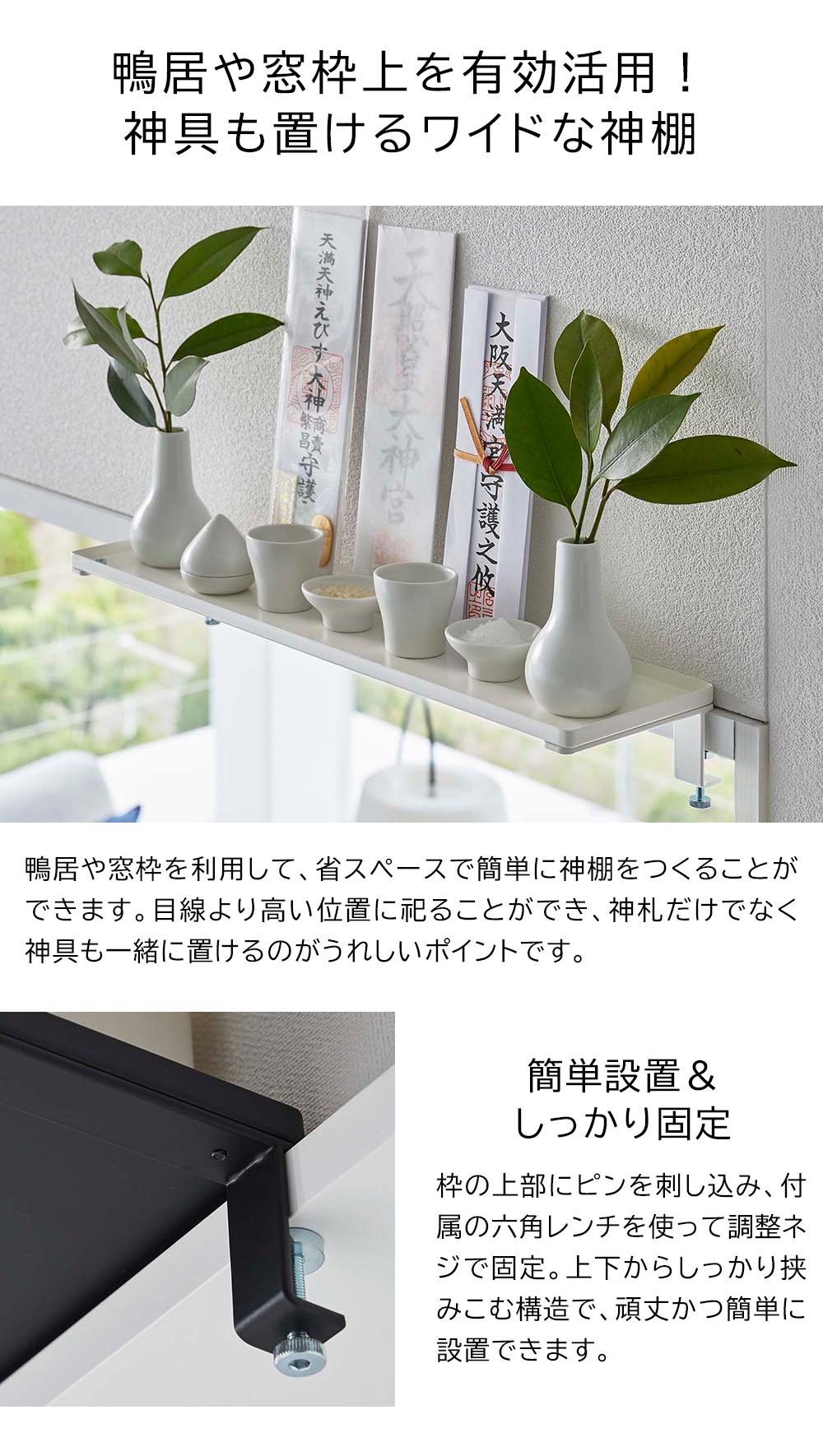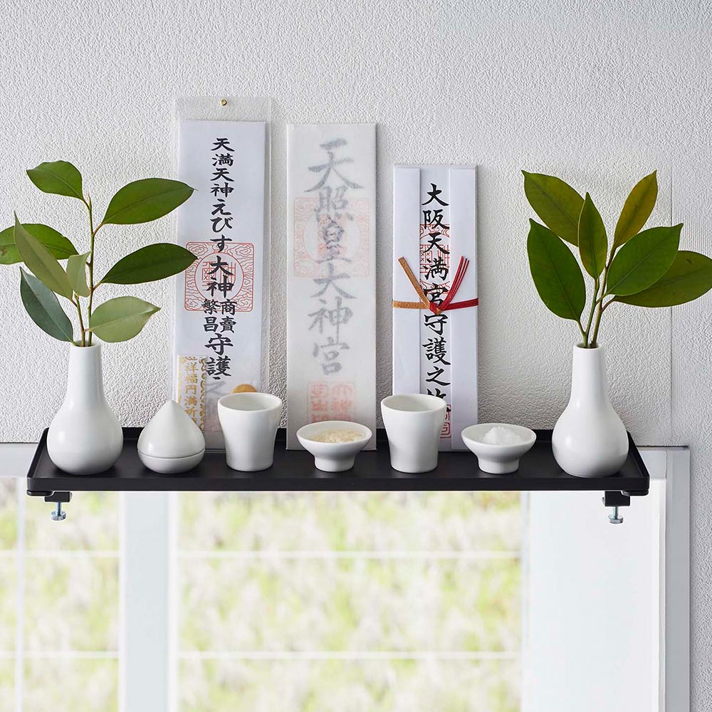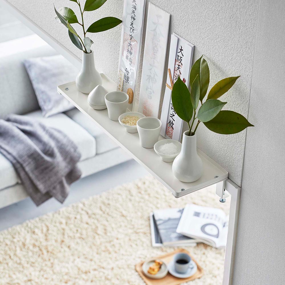 鴨居や窓枠に簡単設置できる 鴨居や窓枠を利用して、省スペースで簡単に取り付けられるスチール製の神棚。空間を有効活用しながら、目線より高い位置に気持ちよく祀ることができ、神具も一緒に置くことができます。シンプルなデザインながらも上下からしっかり挟みこんで設置する構造なので、ディスプレイを楽しむ飾り棚や日用品のストックなどの収納棚、高い場所に置きたい室内防犯カメラの設置場所としてのご使用もオススメです。リビングや洗面所やトイレなど、家の中のいろいろな場所で用途に応じて活躍の場は広がります。 ![]() ![]() ![]() ![]() ![]() ![]() ![]() ![]() ![]() ![]() |
