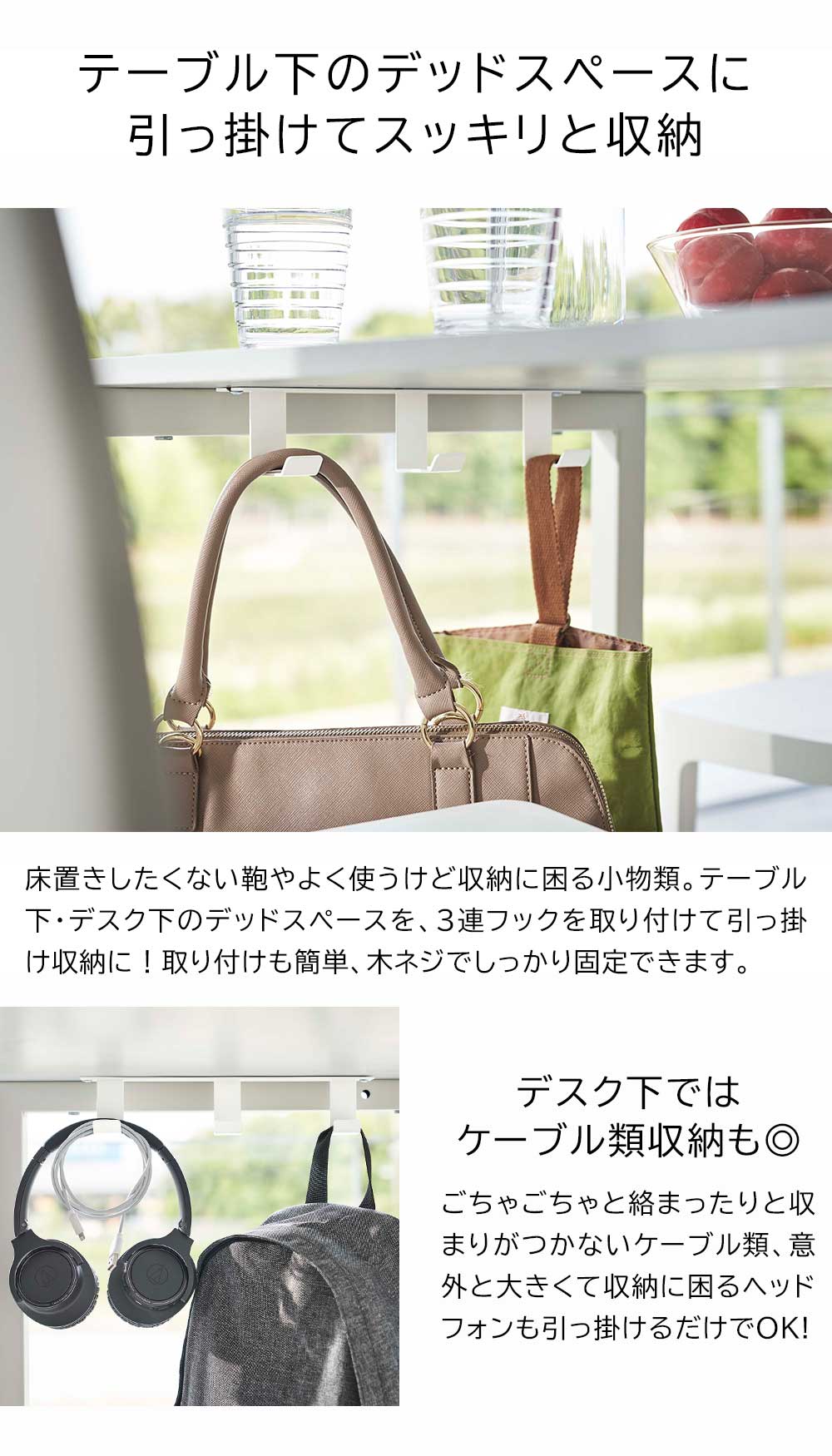 鞄や小物を引っ掛け収納 床置きしたくない鞄や、よく使うけれど置き場所に困る小物類。テーブル下・デスク下に引っ掛けて収納ができる3連のフックを取り付けて、デッドスペースを有効に活用しましょう!毎日よく使う鞄や、充電用のケーブル、意外と収納に困るヘッドフォンも、引っ掛けてすっきりと収納。フックの取り付けは簡単、木ネジでしっかりと固定できます。また、フックの幅も広めに作られているので、引っ掛けたものを傷めにくい親切設計。シンプルなデザインなので、どんなインテリアにもスッとなじみます。 ![]() ![]() ![]() ![]() ![]() ![]() ![]() ![]() |