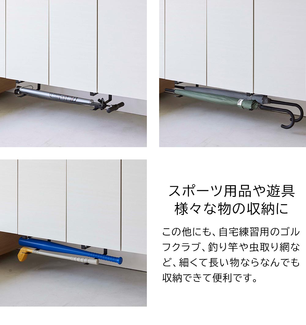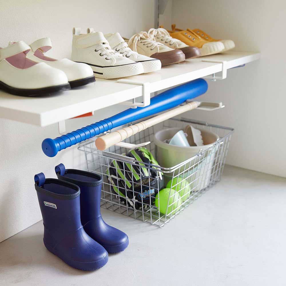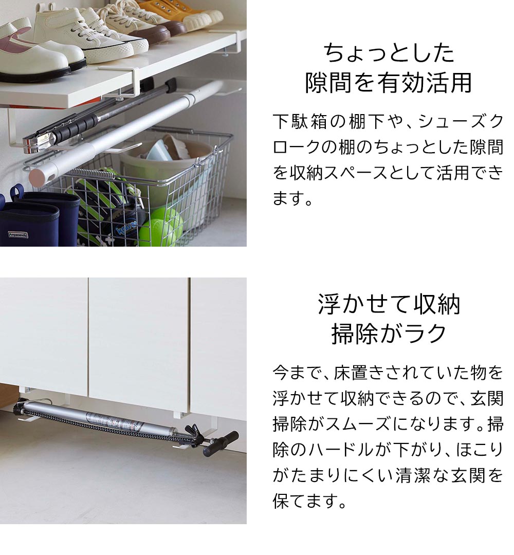 置き場所に困る 玄関やシューズクロークに立てかけられている、ほうきや野球バッドなど置き場所に困る物を浮かせて収納できるハンガー。下駄箱の棚下や、シューズクロークの棚のちょっとした隙間を収納スペースとして活用できます。取り付けはとても簡単で、2つのハンガーをお好みの間隔に調整し、ハンガーを棚板に差し込むだけ。調整ネジを締めてハンガーを固定するので、長さのある物をしっかり支えてくれます。今まで床置きしていた自転車の空気入れなども浮かせて収納できるので、お掃除しやすい玄関になります。 ![]() ![]() ![]() ![]() ![]() ![]() ![]() ![]() ![]() ![]() ![]() |