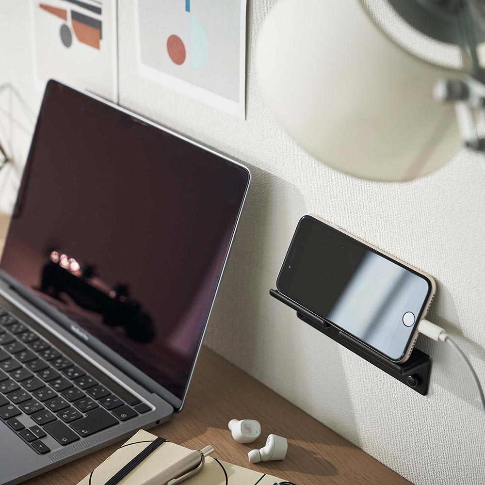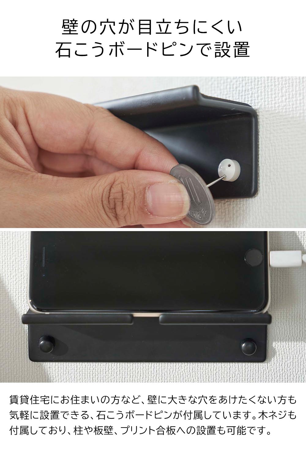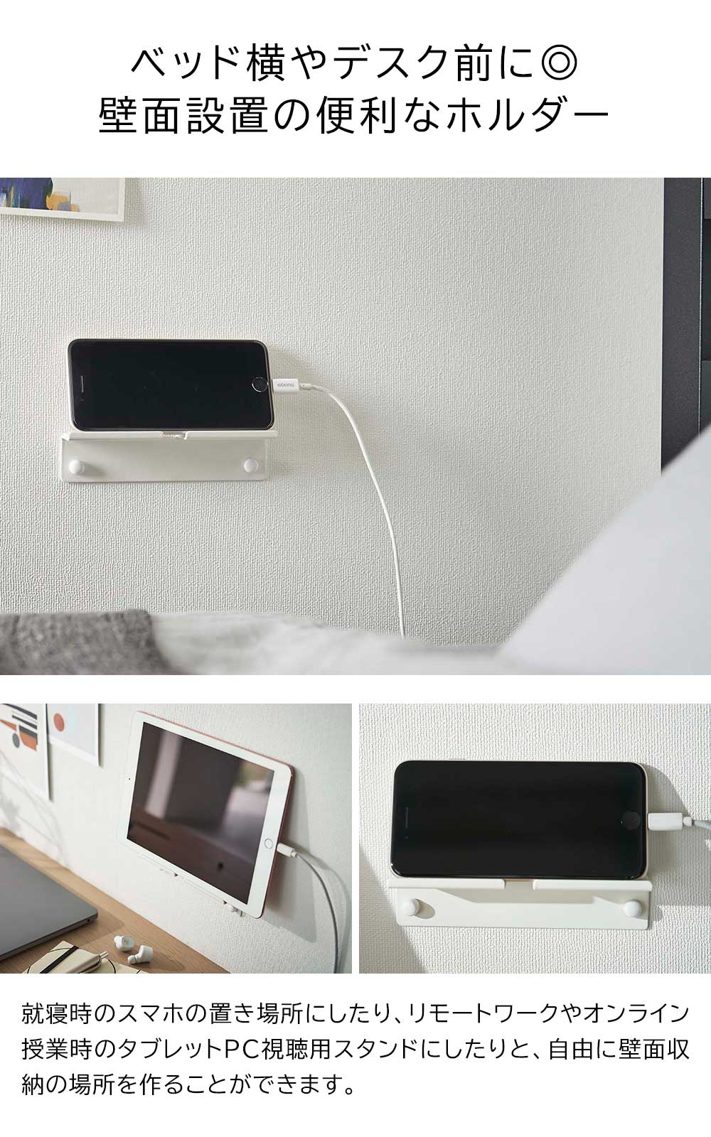 スマホやタブレットPCを リモートワークやオンライン授業、就寝時などに大活躍! スマートフォンやタブレットPCを、デスク前やベッド横の壁面に自由に設置できる便利なホルダーです。ホルダー中央には充電コードが入るスリットがあり、充電しながらスマホやタブレットを立てて収納することができます。 見やすい位置に取り付ければ、リモートワークやオンライン授業の為のセッティングも簡単!デスクの場所を占有することなく、快適な視聴環境を作ることができます。 付属の石こうボードピンで取り付けるので、壁の穴が目立ちにくく、賃貸住宅にお住まいの場合など、壁に大きな穴をあけたくない方も気軽にご使用いただけます。また、付属の木ネジでの取り付けも可能です。 ![]() ![]() ![]() ![]() ![]() ![]() ![]() ![]() ![]() |
