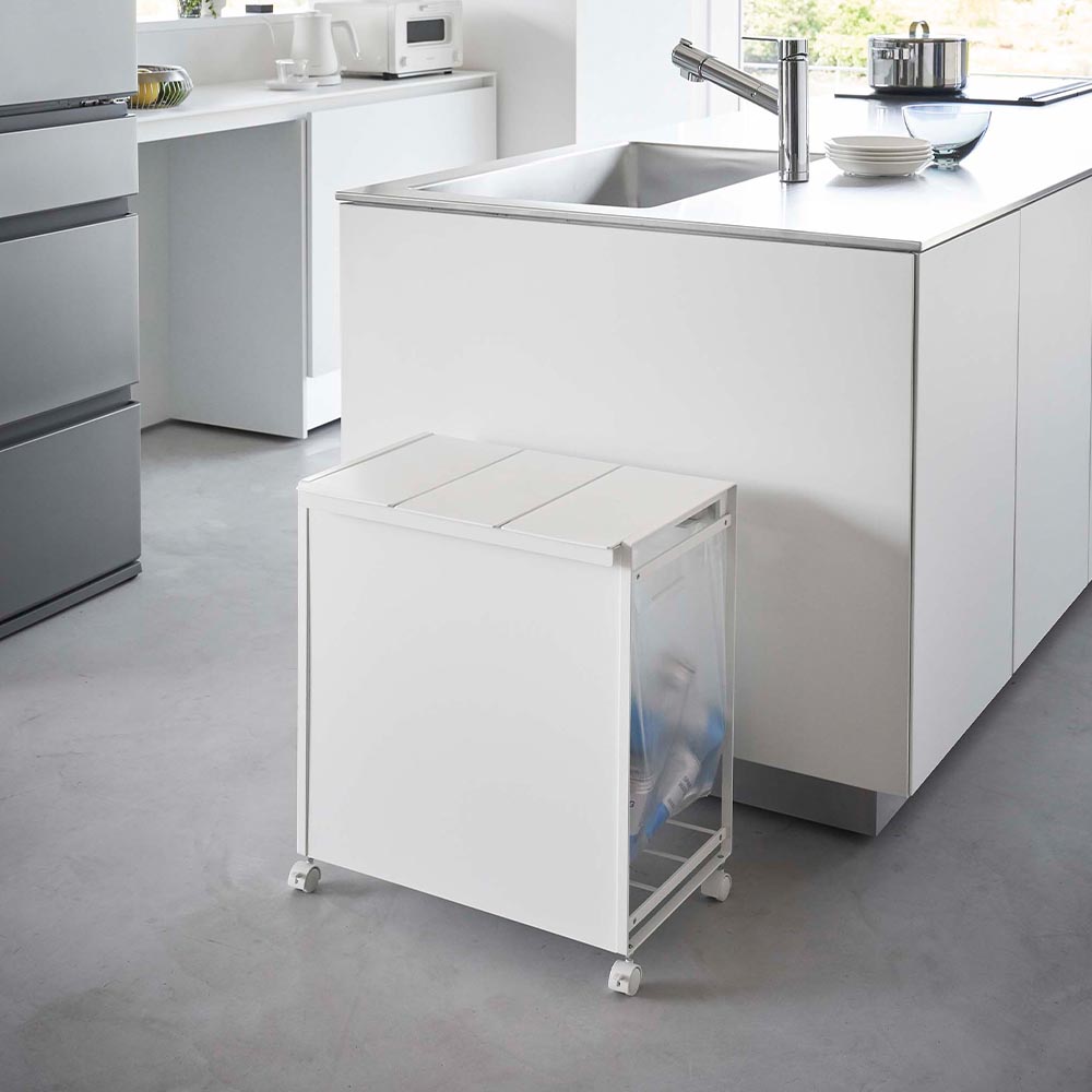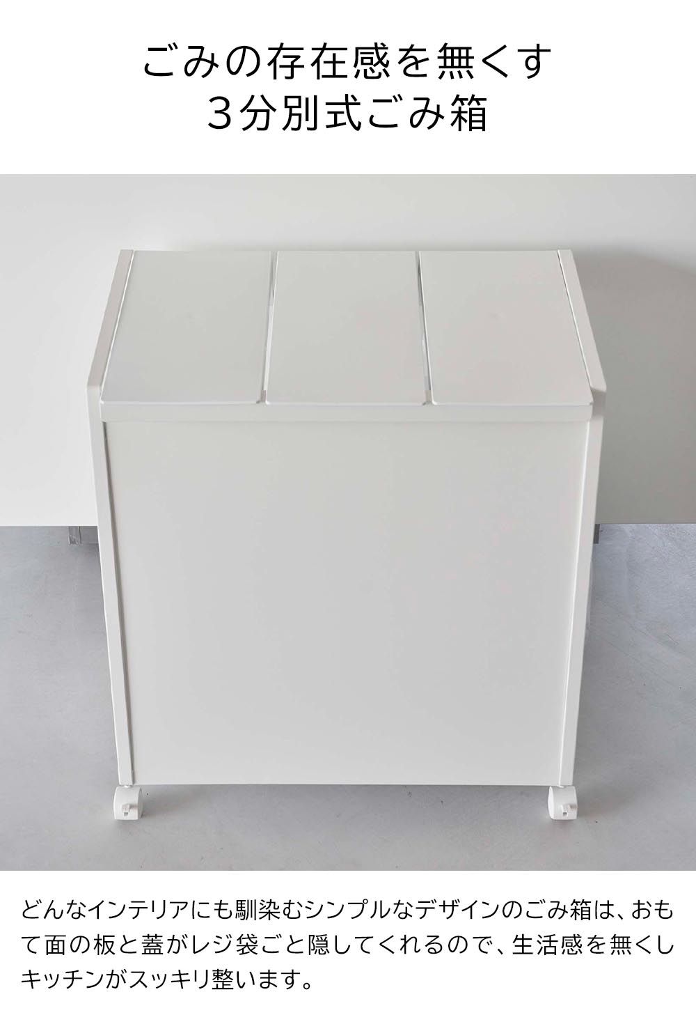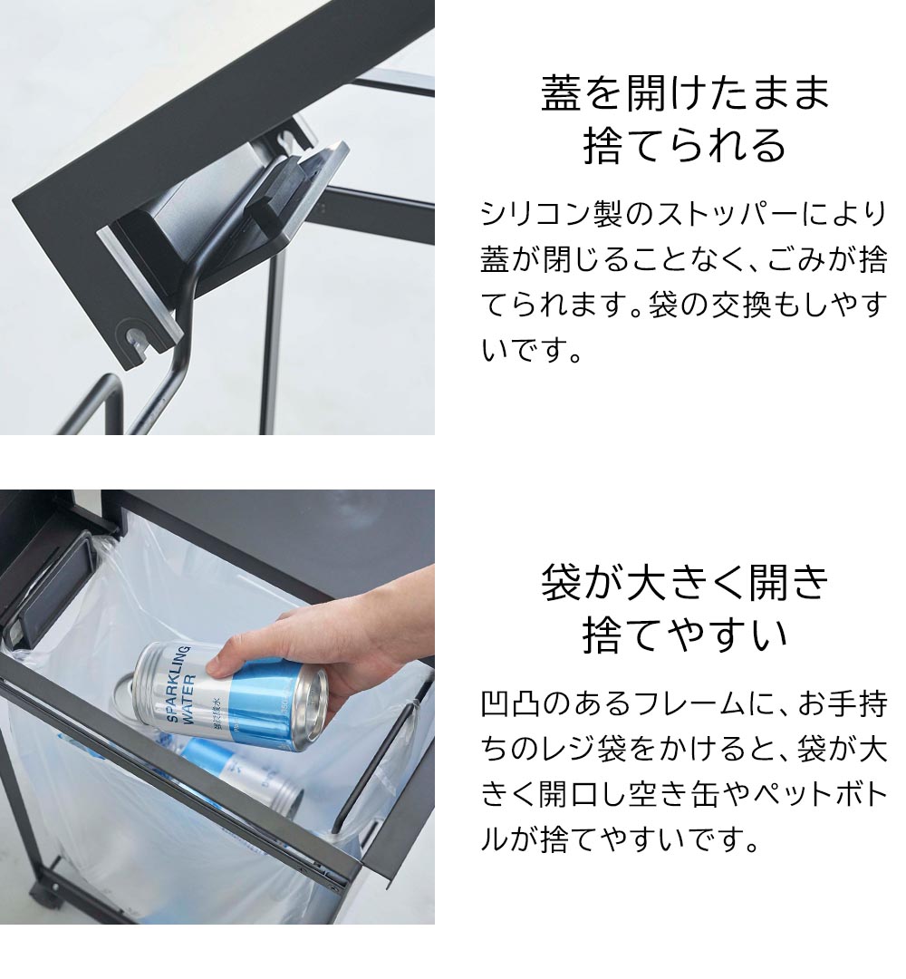 見た目スッキリ! レジ袋ごと隠して資源ごみを分別できるスタイリッシュな蓋付き3分別ダストワゴン。どんなインテリアにも馴染むシンプルなデザインのごみ箱は、おもて面の板と蓋が中のごみを隠し、キッチンがスッキリ整います。蓋は片手で開閉が可能で、蓋を開けたままにできるストッパーが付いており、ごみ捨てや袋の交換がしやすく便利です。また、レジ袋の持ち手を凹凸のあるフレームに掛けてセット。袋が大きく開口し、空き缶やペットボトルが捨てやすくなります。底には、セットしたレジ袋が床に付かないように支えるフレームがあり、レジ袋のストックを置く場所としてもおすすめです。移動やお掃除の際に便利なキャスターと持ち手が付いており、家事がスムーズにはかどるダストワゴンです。 ![]() ![]() ![]() ![]() ![]() ![]() ![]() ![]() ![]() ![]() |