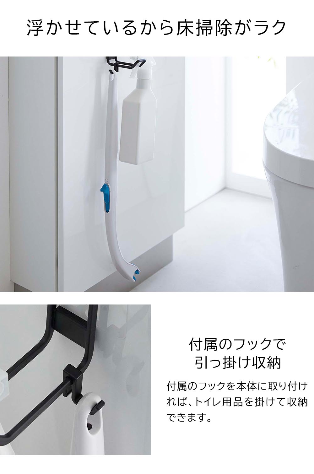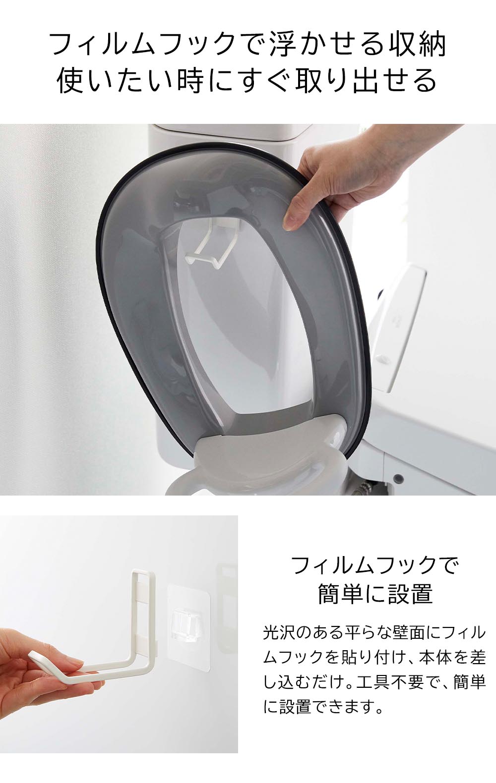 すぐに取り出せて便利! トイレタンクやタイルに、フィルムフックで簡単に設置できるトイレ用品収納フック。トイレブラシやスプレーボトルなど、すぐに使いたい物を掛けて収納できます。また置き場所に困るお子様用の補助便座も掛けて収納でき、直置きしないので補助便座を清潔に保てます。トイレ用品を浮かせているので、床掃除も簡単にできます。 ![]() ![]() ![]() ![]() ![]() ![]() ![]() ![]() |
