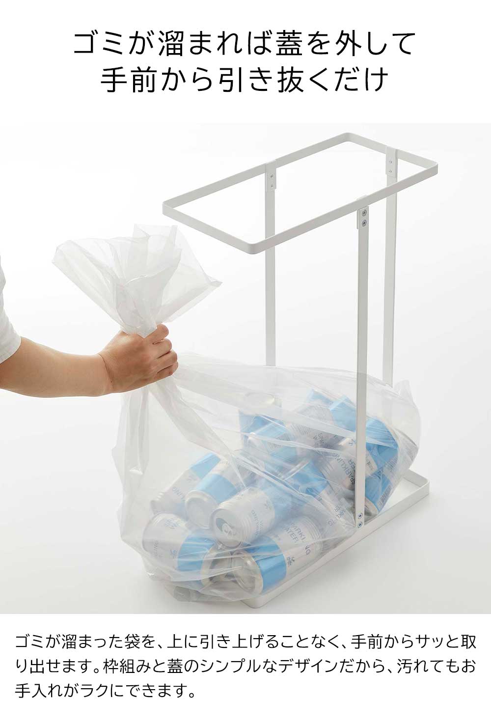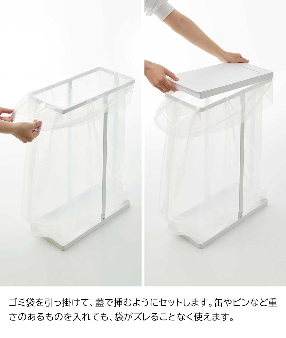 キッチンの隙間に収まるスリムなゴミ箱です。45Lサイズのゴミ袋がぴったりセットできるから、ゴミ袋の取り付けがスムーズ。ペットボトルや空き缶や資源ゴミの分別に便利に使えます。ボックスタイプだと中が重いとき、上に引き出しづらく取り替えが大変ですが、蓋を外して前からサッと引き抜くだけで中を取り出せるので、ゴミ捨て時の負担が減らせます。蓋を閉めておけば、中身が直接見えず衛生的です。また、枠組みと蓋のシンプルな設計だから、汚れる箇所が少ないためお手入れがラクにできます。