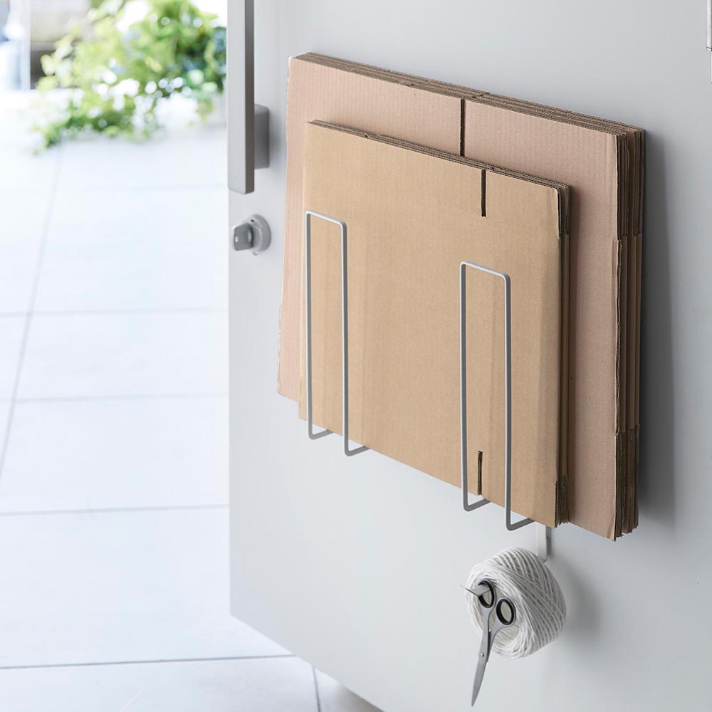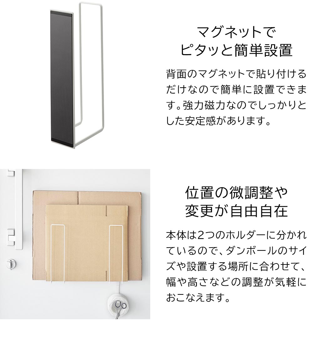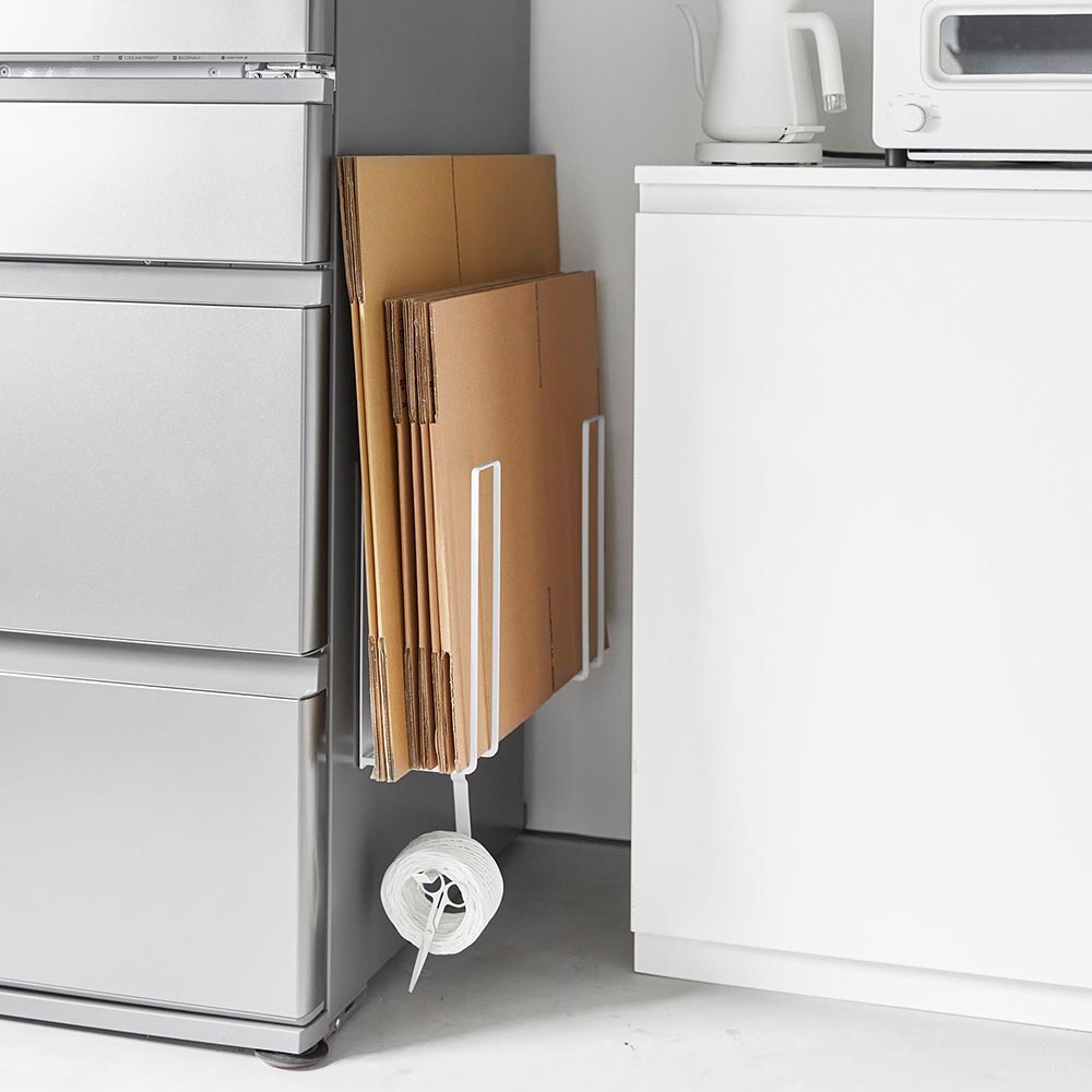 ダンボールを浮かせて収納! 置き場所に困るダンボールをすっきり収納できる、ダンボールストッカー。 マグネット式なので簡単に取り付けることができ、 ダンボールのサイズや設置する場所に合わせて、幅や高さなどの調整が気軽におこなえます。 冷蔵庫横の隙間や玄関扉などに、設置しやすく邪魔にならないスリム設計なのもうれしいポイント。 荷物を受けとる場所の近くに、ダンボール置き場をつくることで、 開梱してすぐに収納でき、散らかり防止になります。 ストッカーに収納したまま束ねられるので、サイズや形状がバラバラでもスムーズにまとめられます。 付属の大小のフックには、紐やハサミを引っ掛けて収納しておくことができるので便利です。 ![]() ![]() ![]() ![]() ![]() ![]() ![]() ![]() ![]() ![]() |
