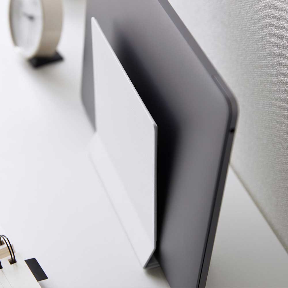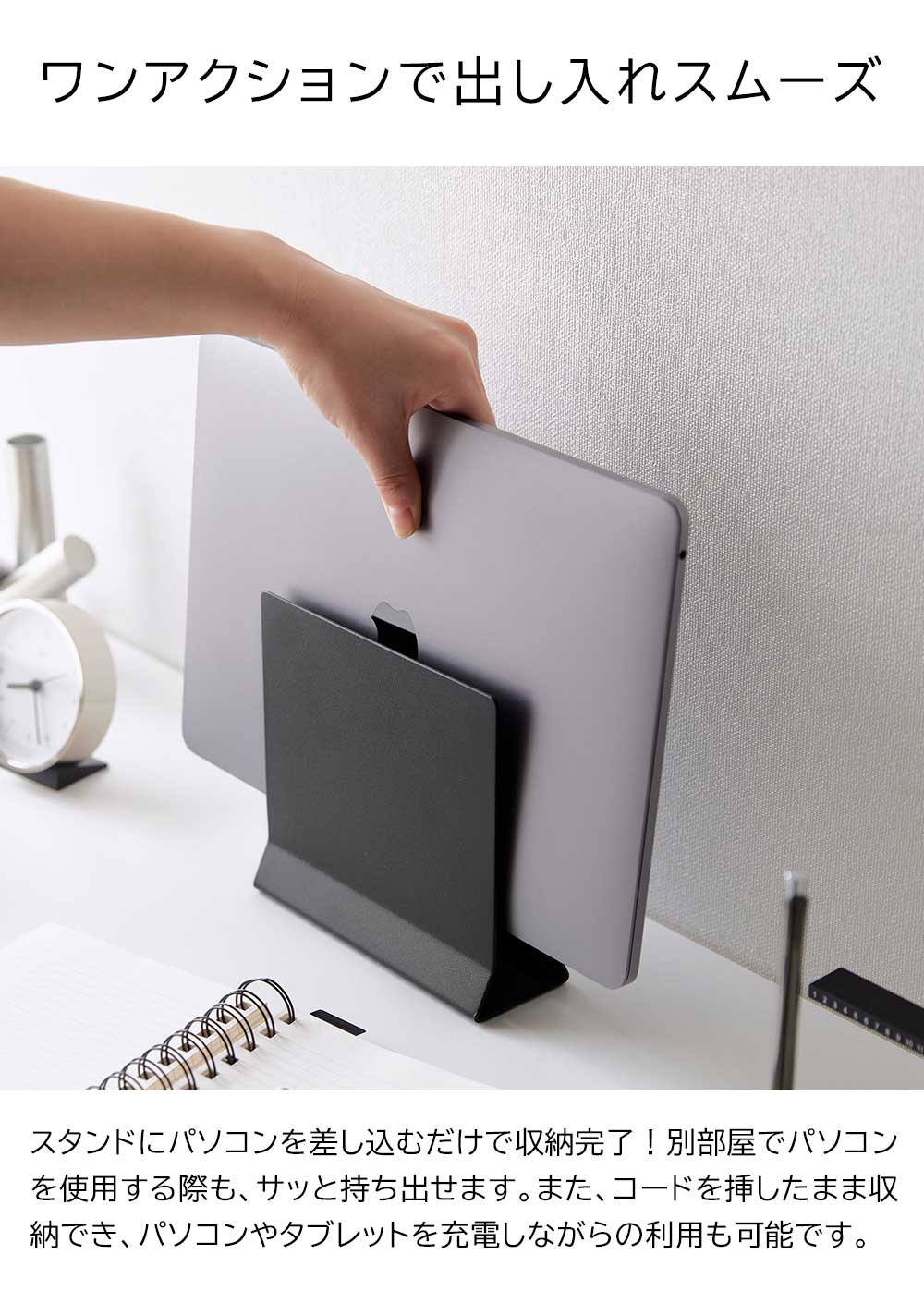 ノートパソコンを縦置き収納 ノートパソコンやタブレットを縦置き収納できるスタンド。ノートパソコンをスリムに収納し、書類や参考書を広げて仕事や勉強ができるので、デスク上を有効活用できます。パソコンの出し入れは抜き差しするだけなので、とても簡単。別部屋でノートパソコンを使用する時もサッと持ち出せ便利です。また、収納棚に本の様に立てて収納すれば、お部屋にノートパソコンが出しっぱなしにならず、スッキリ整った空間に。パソコンやタブレットにコードを挿したままスタンドを利用できるので、充電しながらの収納が可能です。スタンド内側には緩衝材が、スタンド底面には滑り止めのシリコーンがついており、大切なパソコンやデスクに傷がつかないよう保護してくれます。 ![]() ![]() ![]() ![]() ![]() ![]() ![]() ![]() ![]() ![]() |