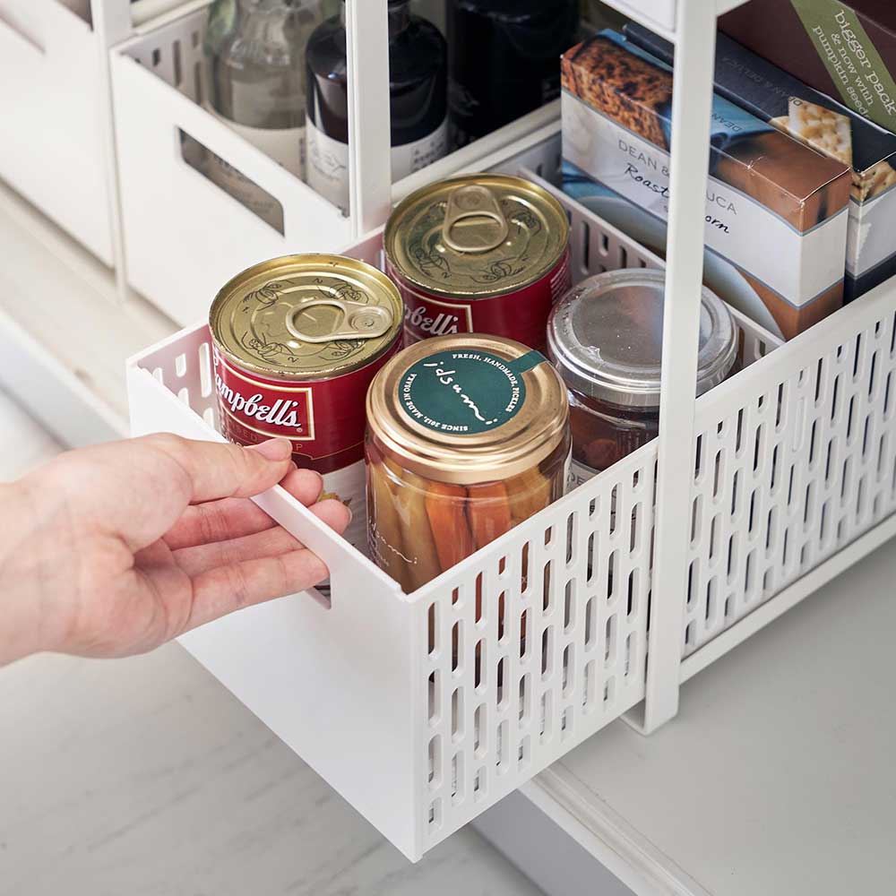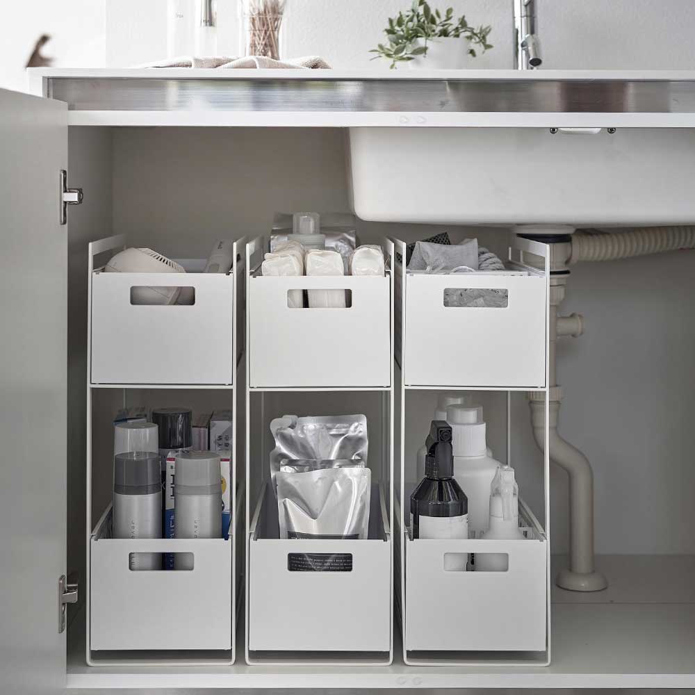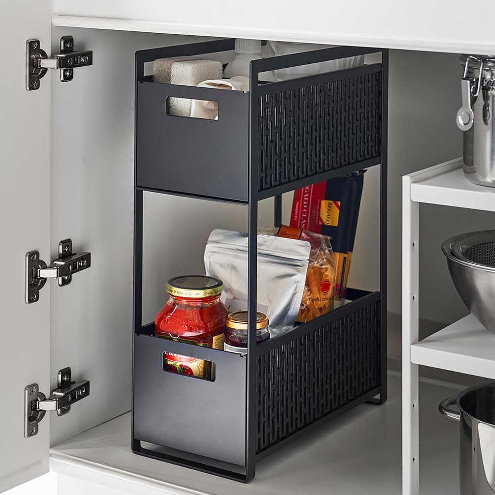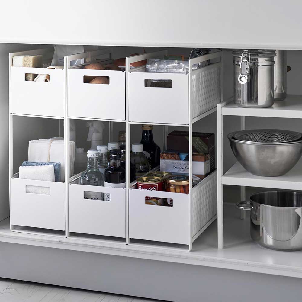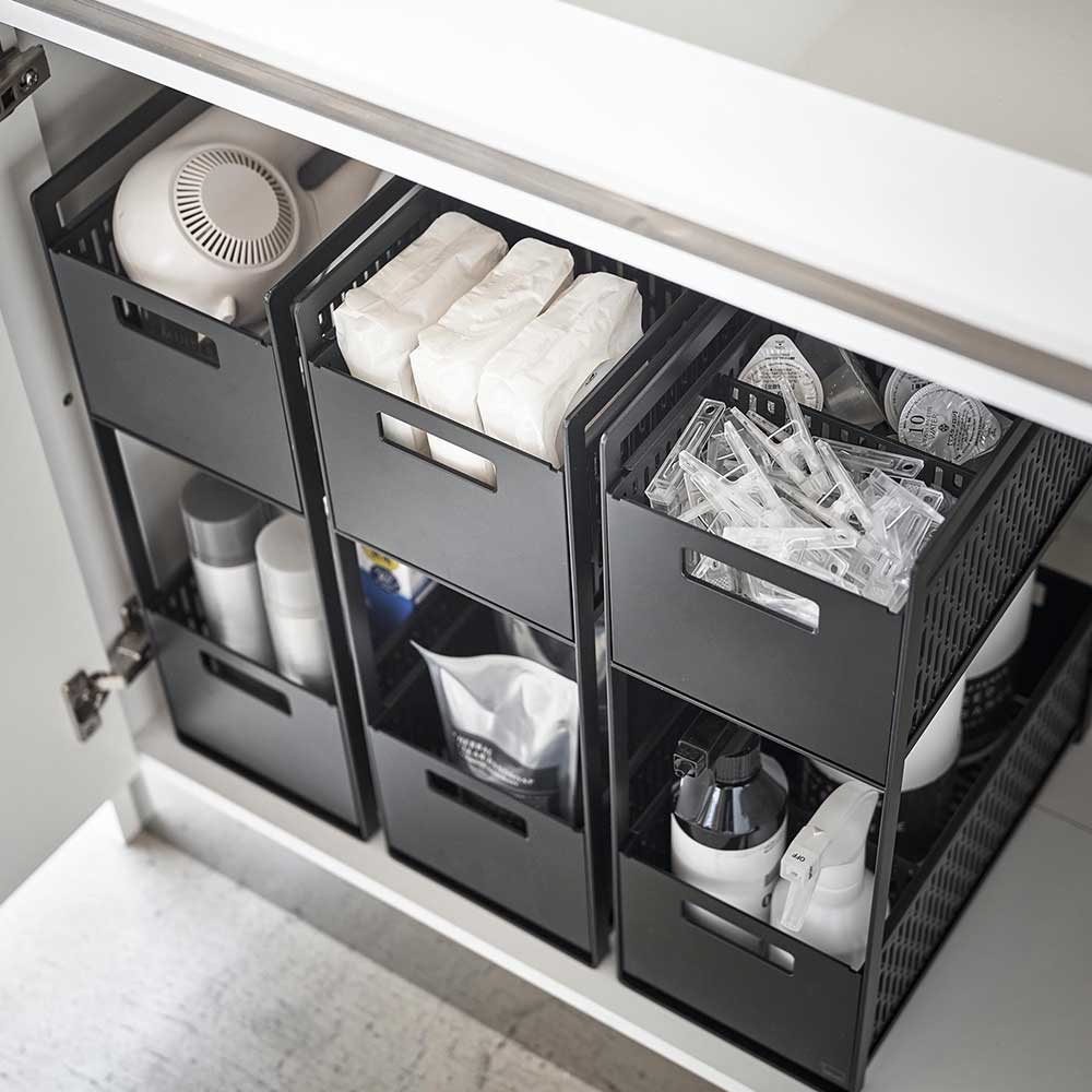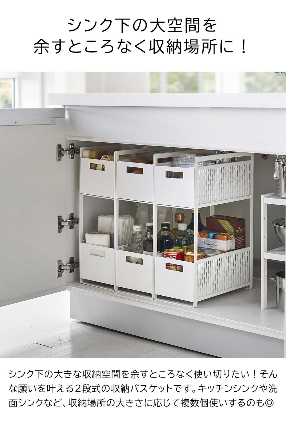 キッチン下や洗面台下の収納空間を最大限に活用できるスライド式の2段バスケットです。