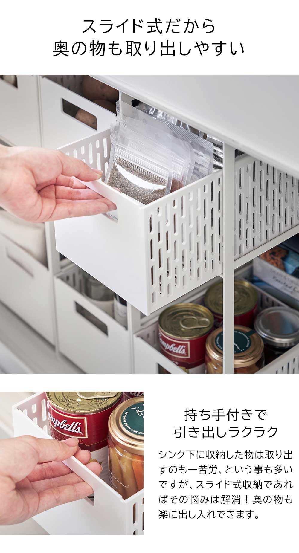 バスケットはスライド式で、奥の物を出したりしまったりする動作がラクに行えます。細かなスリットが入ったデザインで通気性も抜群です。