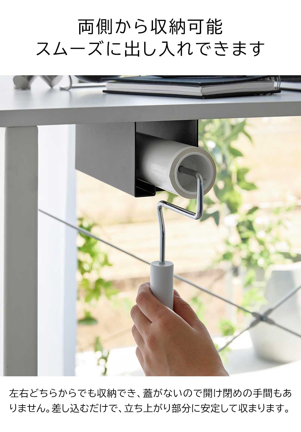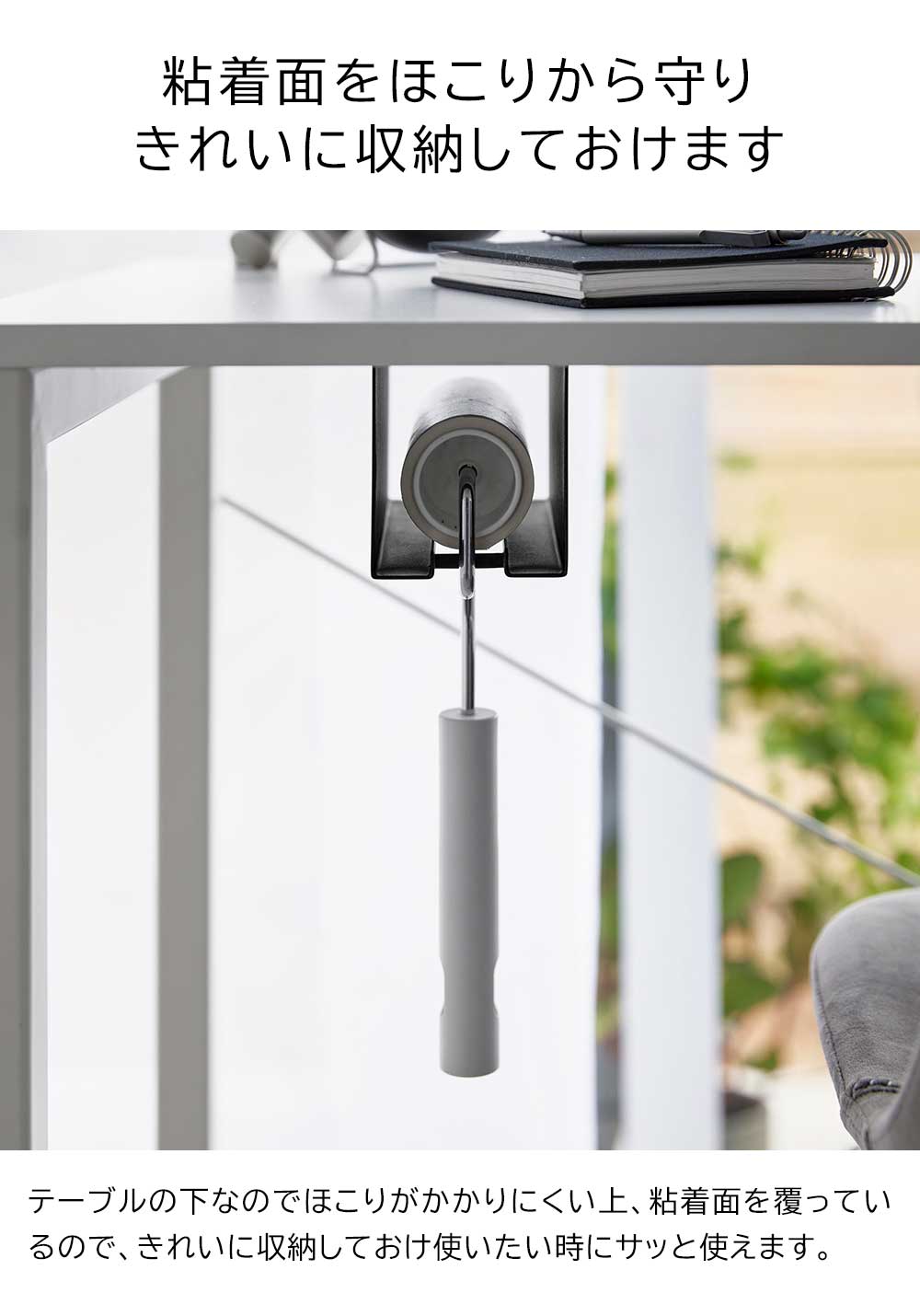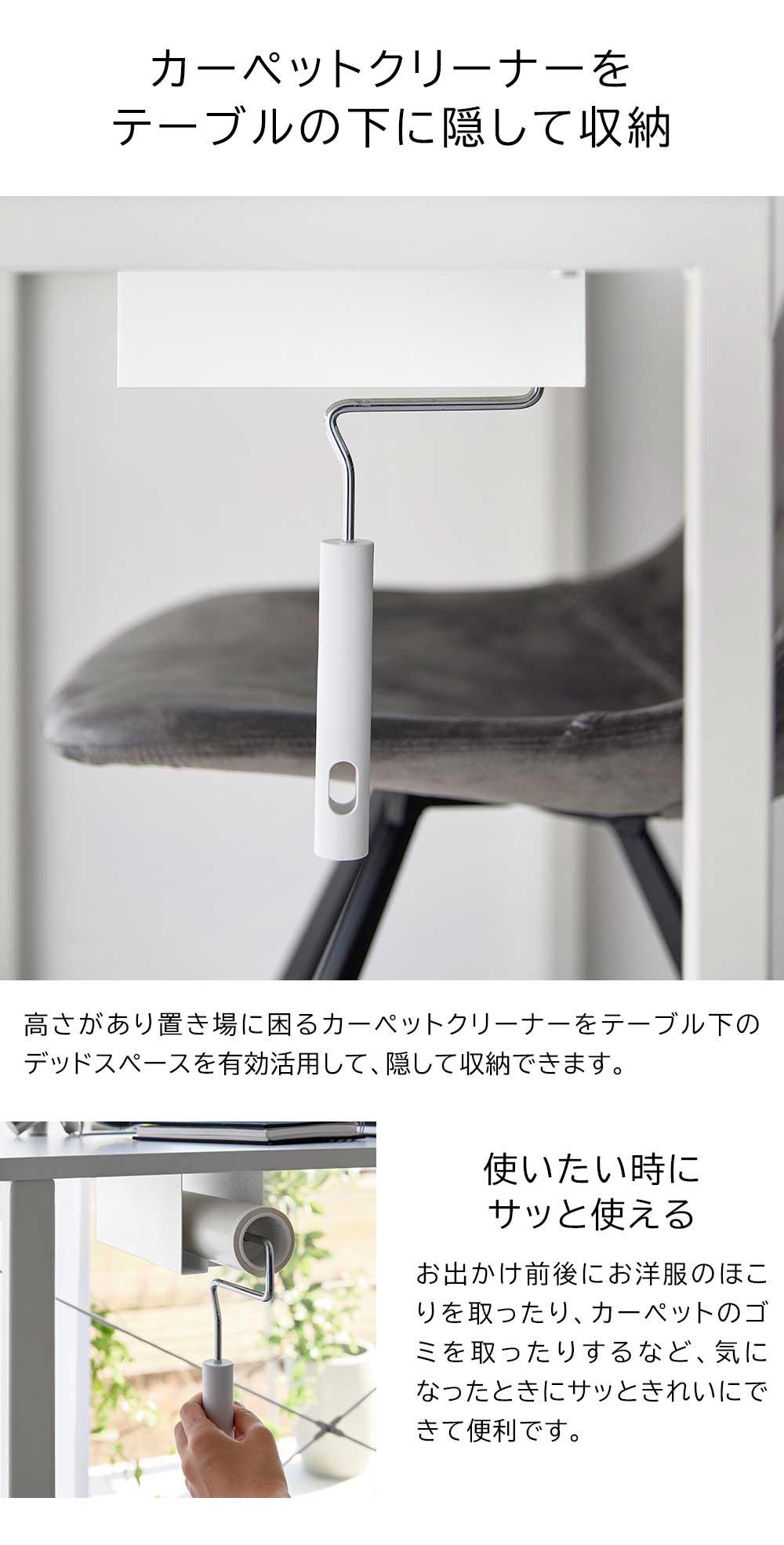 転がすだけでゴミが取れてとっても便利なカーペットクリーナーですが、収納場所は決まっていますか?こちらのホルダーを使えばテーブル下のデッドスペースがカーペットクリーナーの定位置に。テーブル下は、ほこりもかかりにくく、生活感も隠せるので収納場所にぴったり!左右どちらからも収納でき、出し入れもスムーズなので使いたい時にサッと手に取れてとっても便利です。