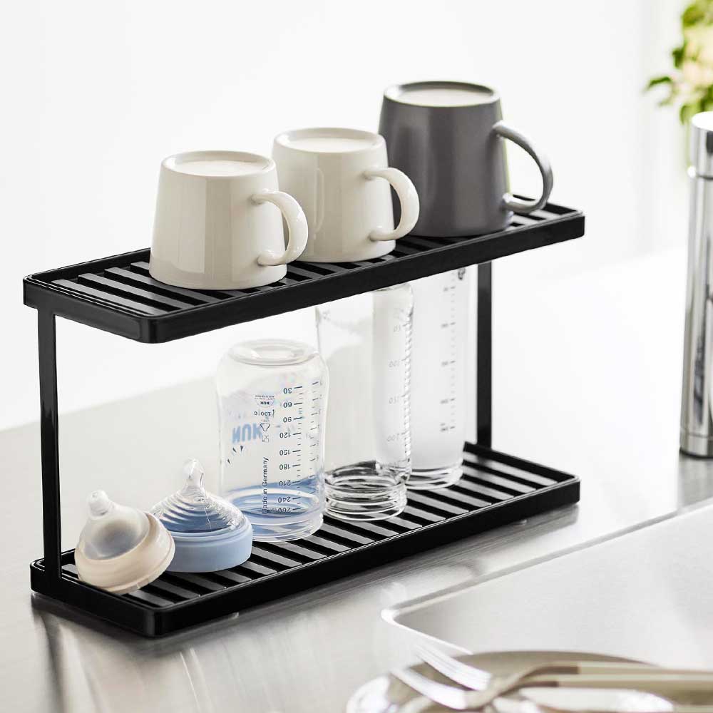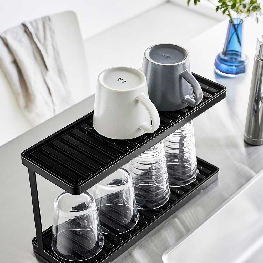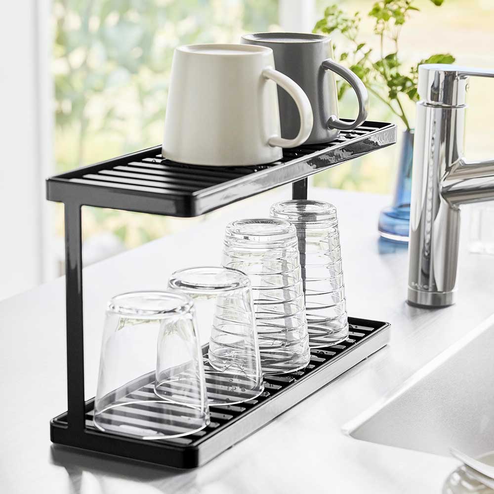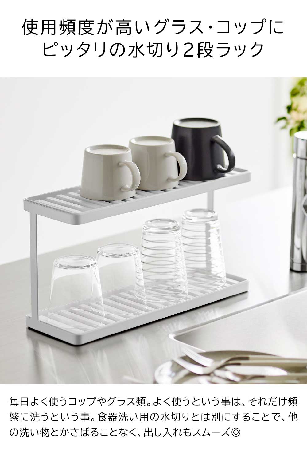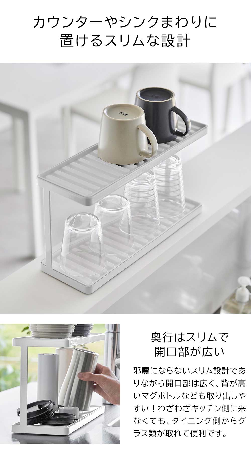 よく使うグラスなどに最適 食器よりも使用頻度が高い、グラスやコップ、タンブラーやマグボトル。よく使うという事は、よく洗うという事。いつもの水切りラックにプラスすることでコップやグラスの出し入れがしやすくなります。また洗った後に場所をとるジャグボトルの一時置きにも◎ 奥行がスリムなのでカウンターキッチン上やシンクまわりのわずかなスペースにも置きやすいのも嬉しいポイント。よく使うコップやグラスをわざわざキッチン側に来て取らなくても、ダイニング側から取り出して使うこともできて便利。背の高いタンブラーやボトルなども開口部が広いことで取り出しやすくなっています。また、上下段とも水受けトレー部分は凹凸形状で水切れと風通しも良好。水切りラック本体とトレーが分解でき丸洗いできるのでいつも清潔に保てます。 ![]() ![]() ![]() ![]() ![]() ![]() ![]() ![]() ![]() ![]() ![]() ![]() ![]() |