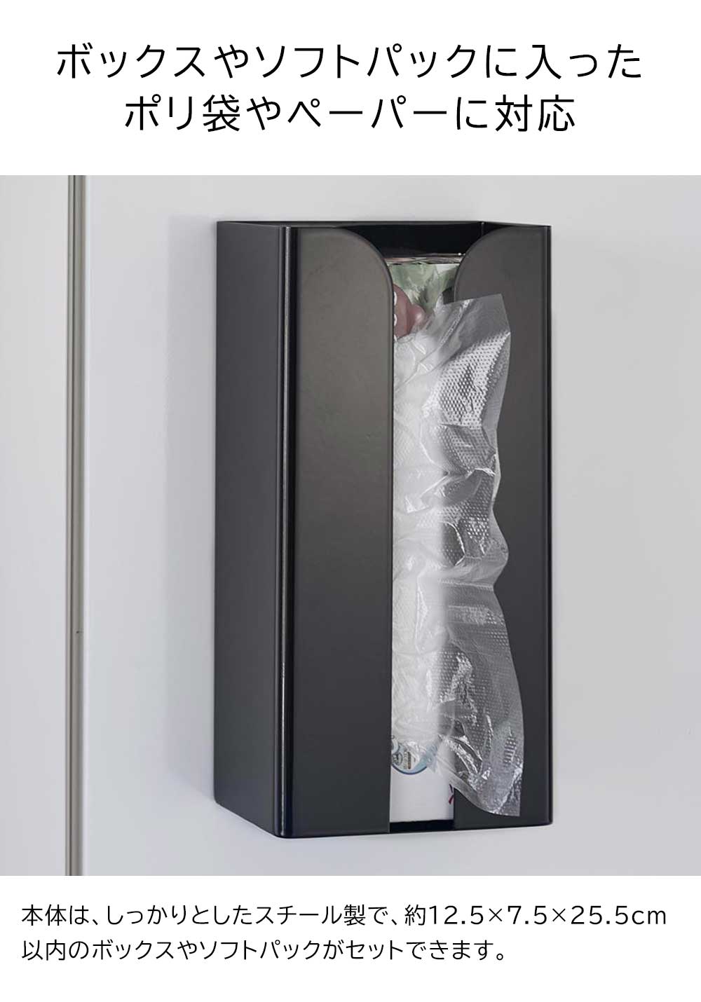 約W12.5×D7.5×H25.5cm以内のボックスタイプやソフトパックのポリ袋・キッチンペーパー・ペーパータオル・ティッシュペーパー