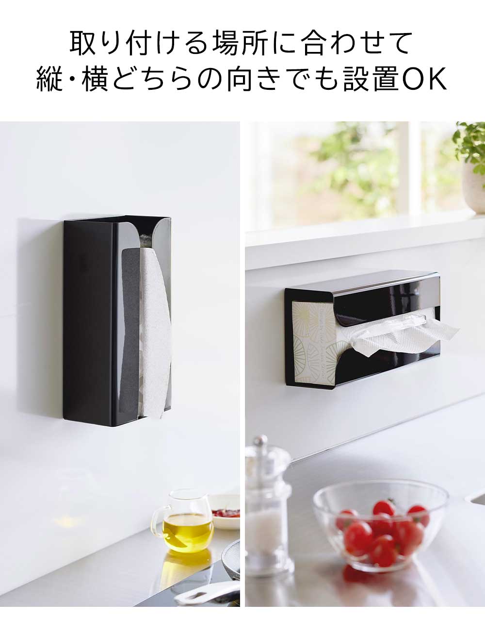 冷蔵庫や洗濯機にも ボックスタイプとソフトパックタイプどちらにも対応するホルダーです。キッチンや洗面まわりのよく使う所に、マグネットで浮かせて収納することで、水はねや油とびを軽減。壁面設置だから引き出しもスムーズにできます。キッチンペーパーやペーパータオルをセットして、冷蔵庫や洗濯機に貼り付けておけば、汚れが気になったときにサッと取り出して拭き掃除ができて便利です。使用頻度が高い、水まわりのお手入れに役立ちます。ポリ袋や使い捨て手袋などをセットして、見た目シンプルにスッキリ収納が可能。取り付け場所に合わせて、縦位置、横位置どちらでも使用できます。 ![]() ![]() ![]() ![]() ![]() ![]() ![]() ![]() ![]() ![]() ![]() |