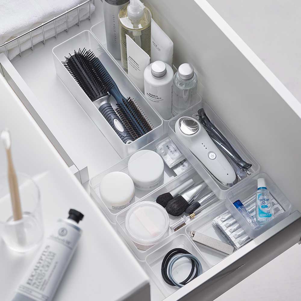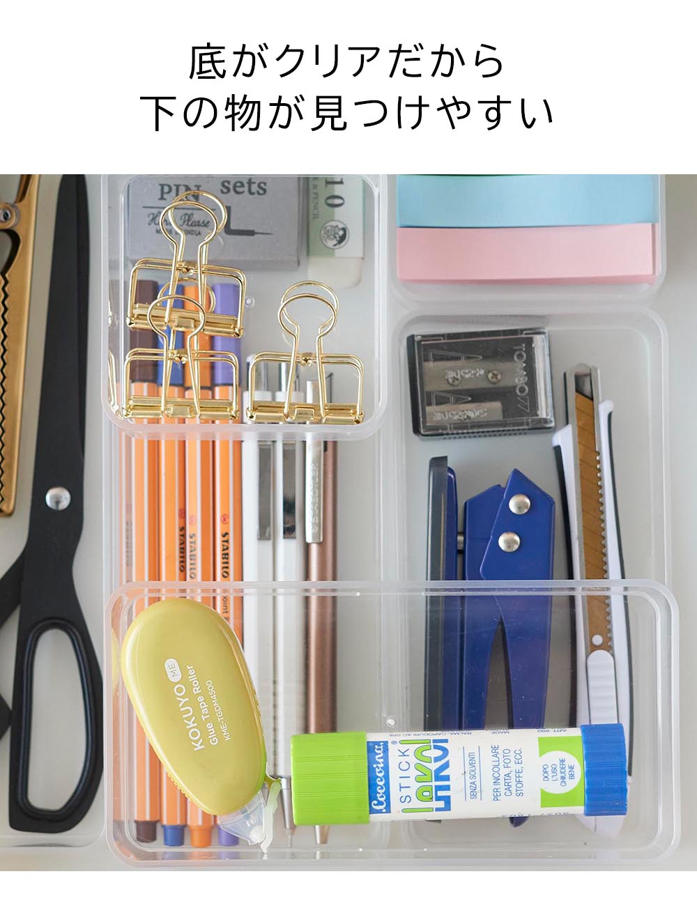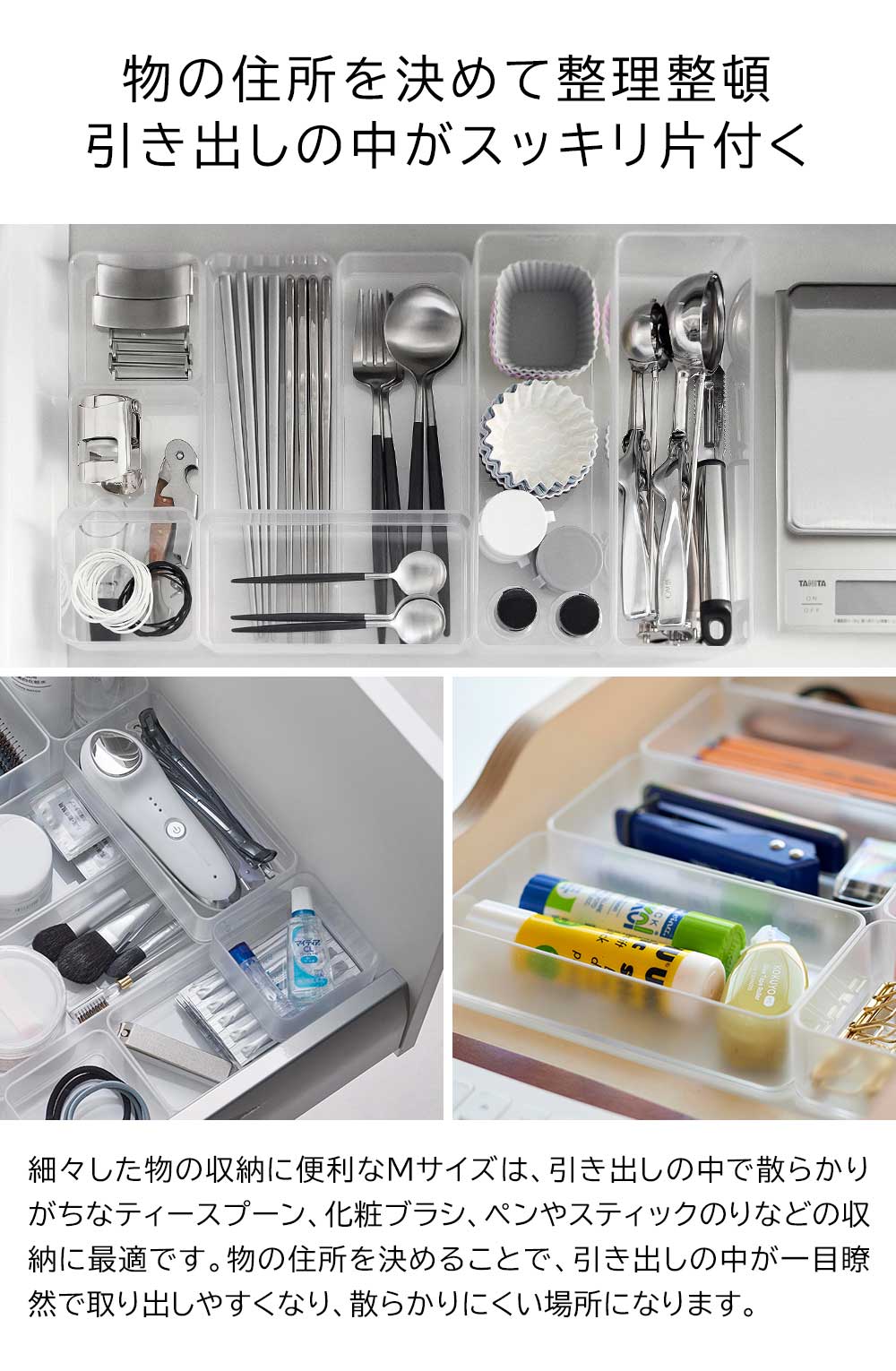 縦横に並べて、上に重ねられるスクエア型収納ケースMサイズ。引き出しの中で散らかりがちなティースプーンやペン、化粧ブラシなどの収納に最適です。縦や横に2個並べても収まりのいいサイズで、ケースをスタッキングすることもできます。ケースを縦に2個並べ、その上に横にしたケースを1個重ねると、スタッキングしたケースをスライドして使用できるので、隙間から物を取り出せて便利です。ケースが透明なので、重ねても下に収納されている物が見つけやすくなっており、引き出しの整理整頓に活躍するアイテムです。