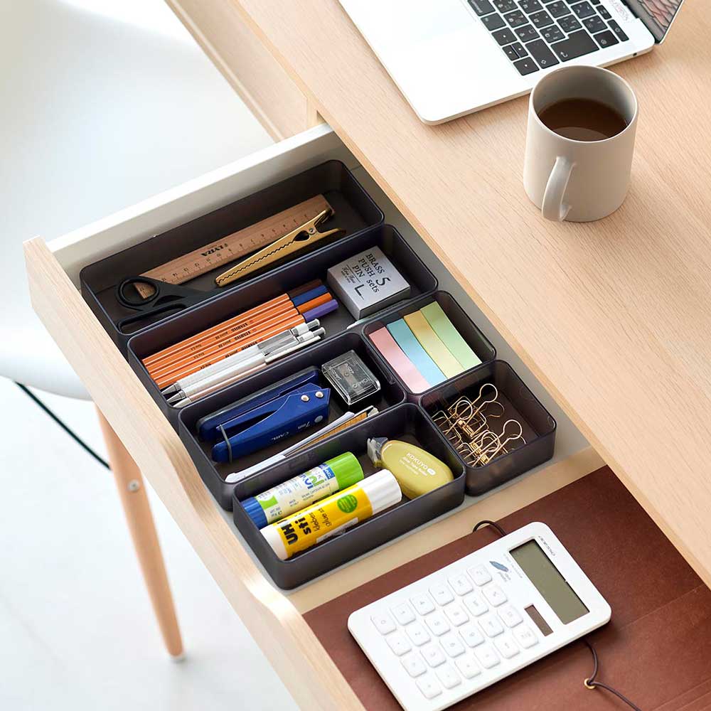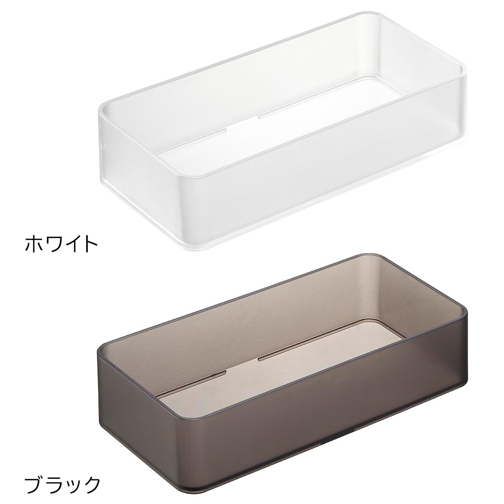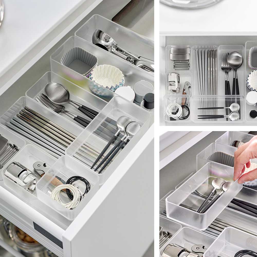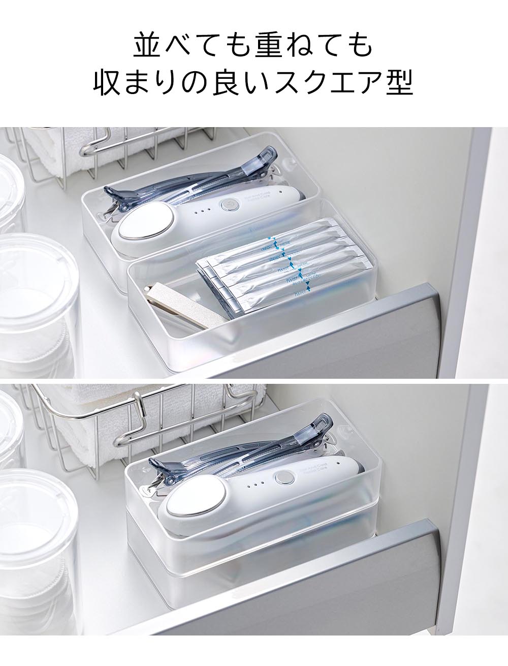 縦横に並べて、上に重ねられるスクエア型収納ケースMサイズ。引き出しの中で散らかりがちなティースプーンやペン、化粧ブラシなどの収納に最適です。縦や横に2個並べても収まりのいいサイズで、ケースをスタッキングすることもできます。ケースを縦に2個並べ、その上に横にしたケースを1個重ねると、スタッキングしたケースをスライドして使用できるので、隙間から物を取り出せて便利です。ケースが透明なので、重ねても下に収納されている物が見つけやすくなっており、引き出しの整理整頓に活躍するアイテムです。