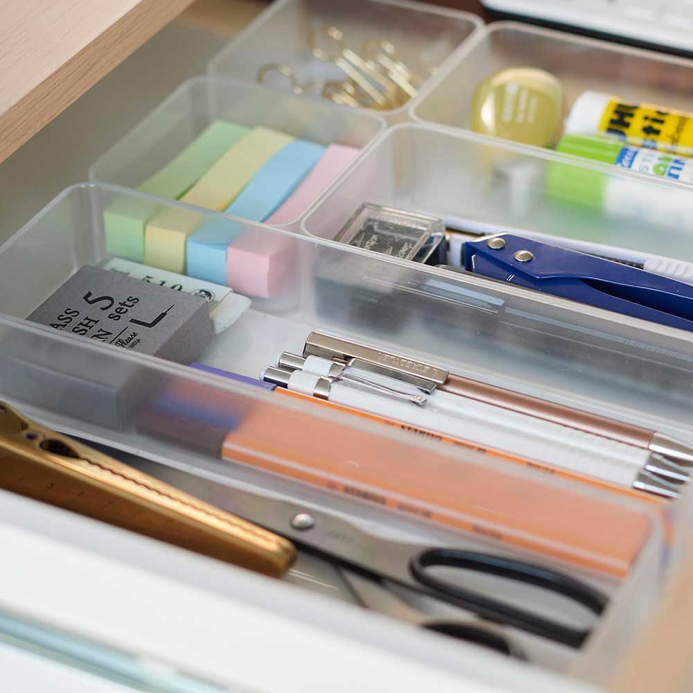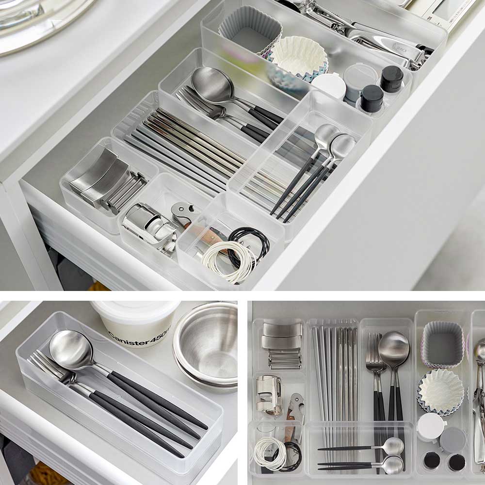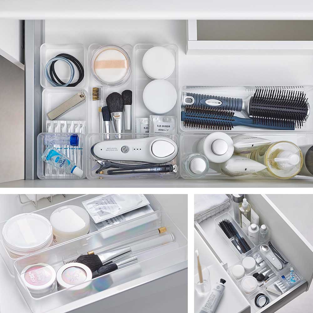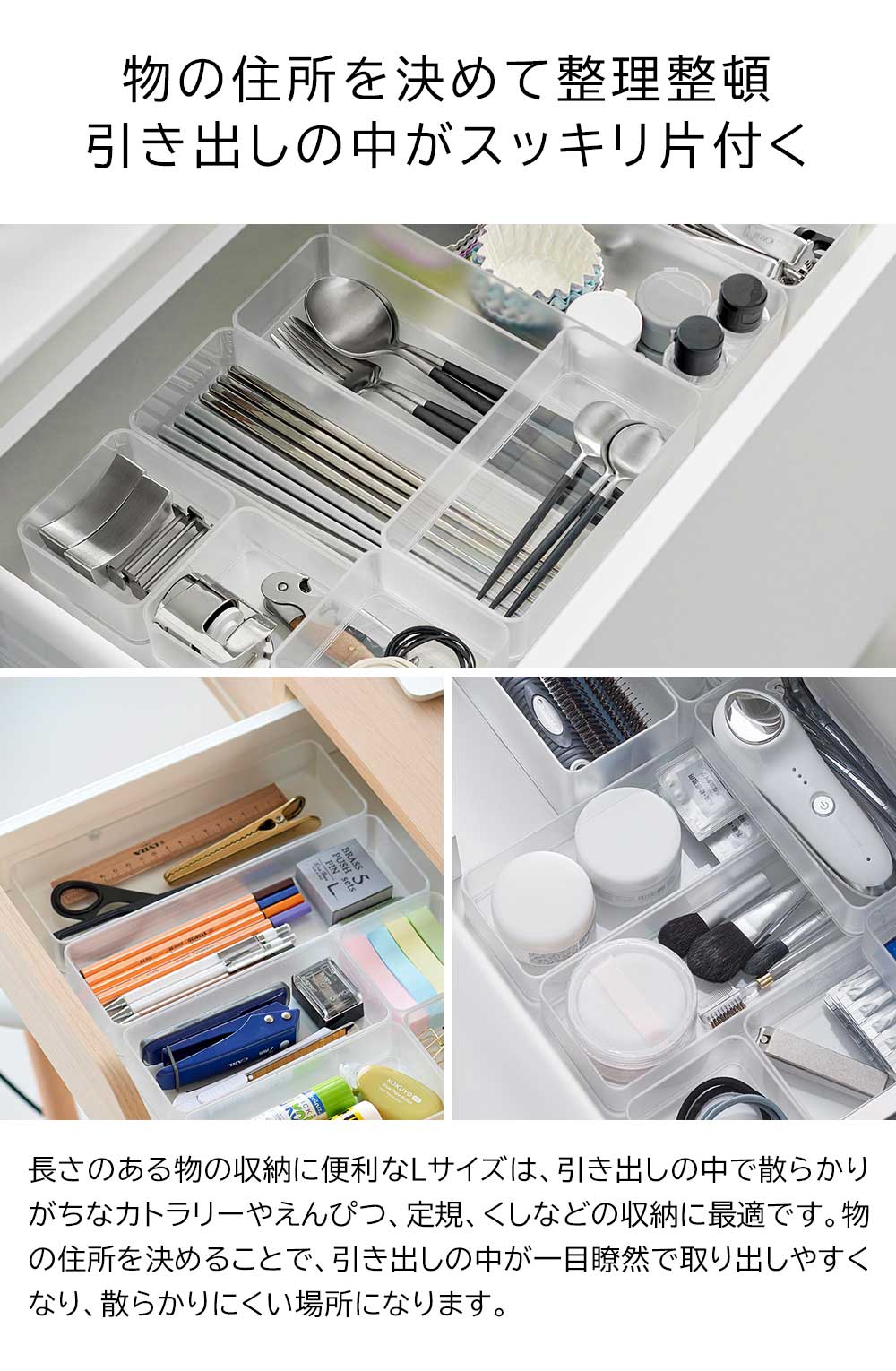 縦横に並べて、上に重ねられるスクエア型収納ケースLサイズ。引き出しの中で散らかりがちなカトラリーやえんぴつ、定規、くしなどの収納に最適です。縦や横に2個並べても収まりの良いサイズで、ケースをスタッキングすることもできます。ケースを縦に3個並べ、その上に横にしたケースを1個重ねると、スタッキングしたケースをスライドして使用できるので、隙間から物を取り出せて便利です。例えば、箸とスプーンを分けて収納したり、家族ごとにケースを分けたりと、引き出しの整理整頓に大活躍のお助けアイテムです。
