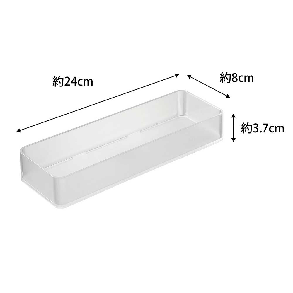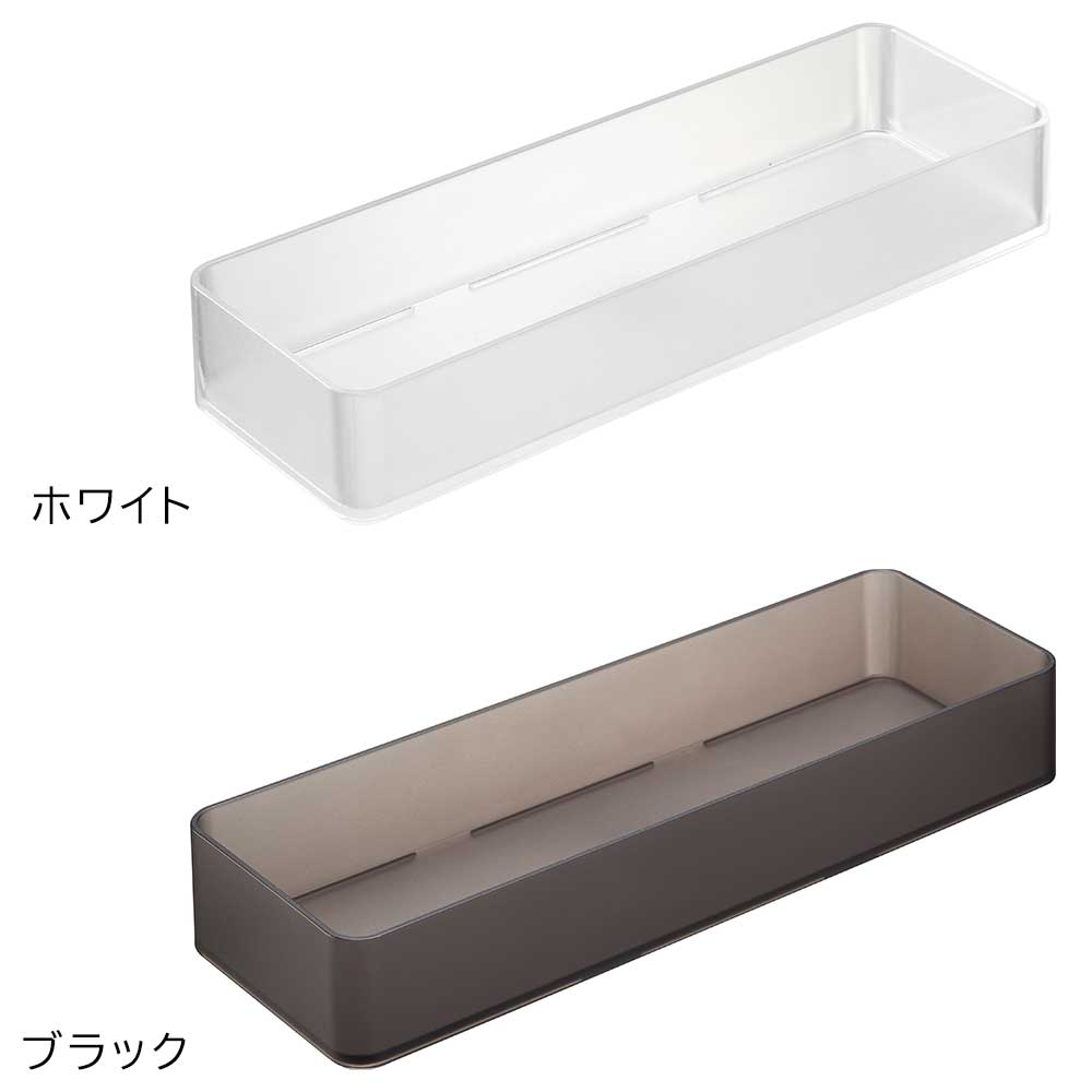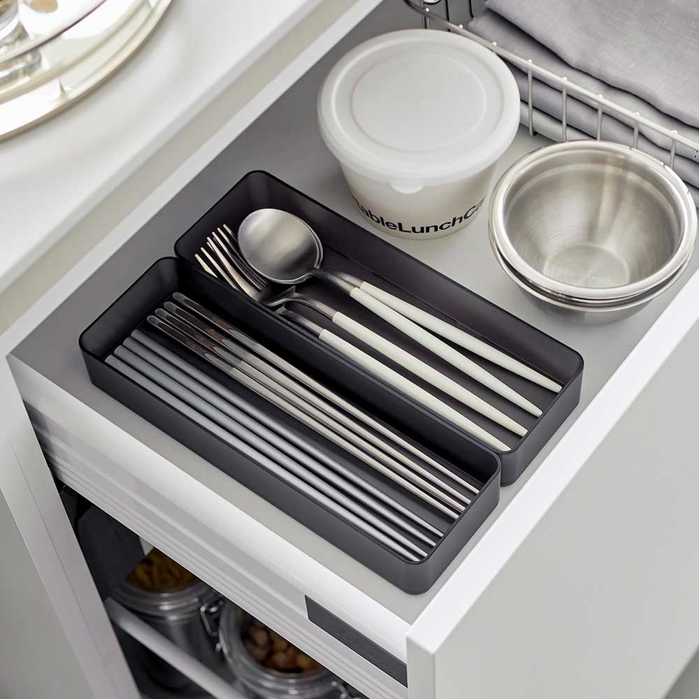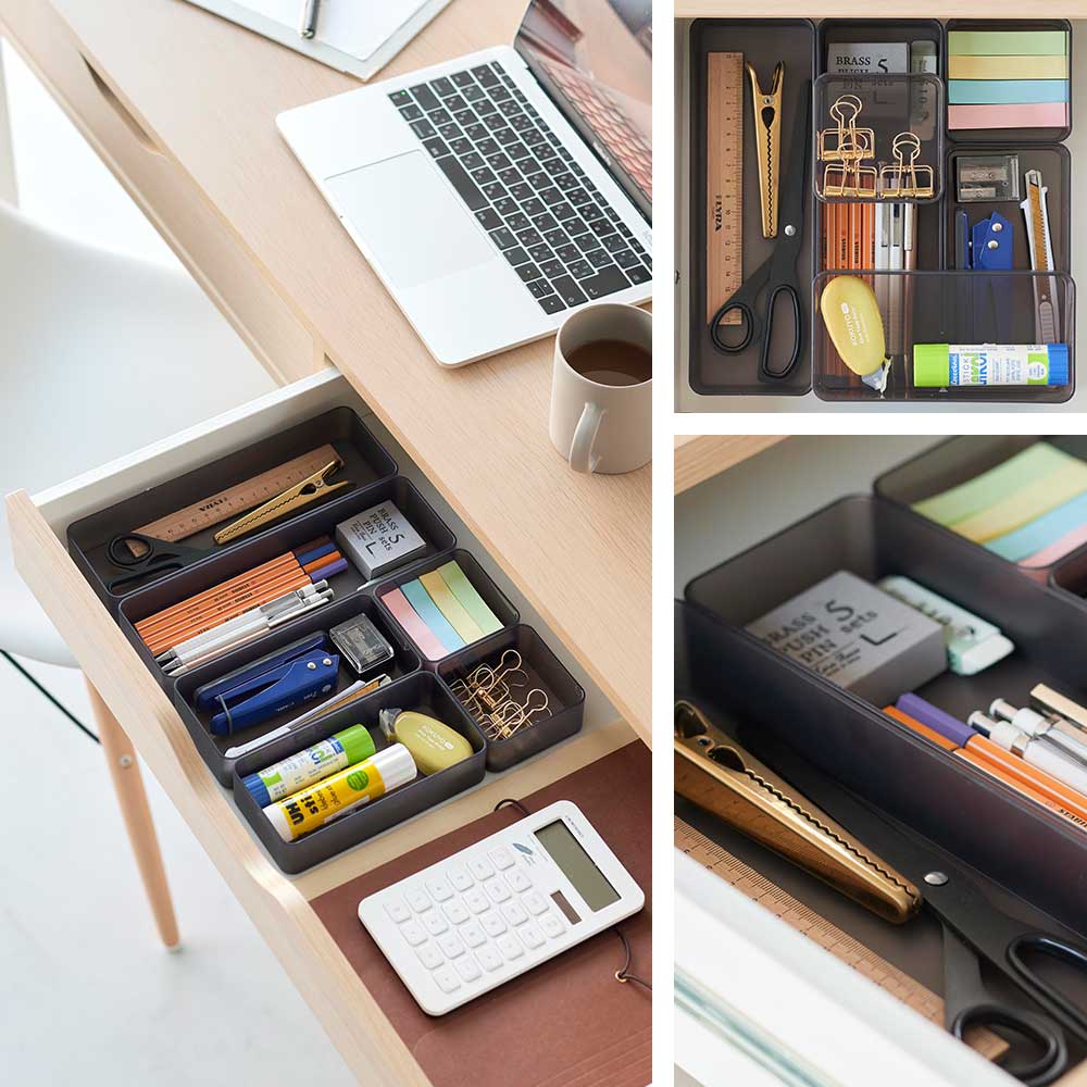 縦横に並べて、上に重ねられるスクエア型収納ケースLサイズ。引き出しの中で散らかりがちなカトラリーやえんぴつ、定規、くしなどの収納に最適です。縦や横に2個並べても収まりの良いサイズで、ケースをスタッキングすることもできます。ケースを縦に3個並べ、その上に横にしたケースを1個重ねると、スタッキングしたケースをスライドして使用できるので、隙間から物を取り出せて便利です。例えば、箸とスプーンを分けて収納したり、家族ごとにケースを分けたりと、引き出しの整理整頓に大活躍のお助けアイテムです。
