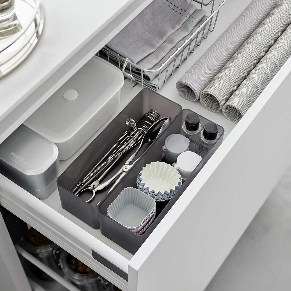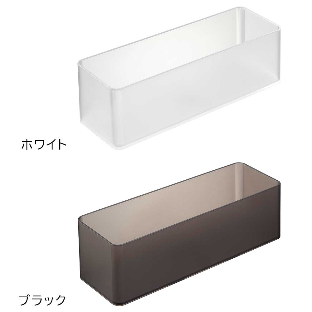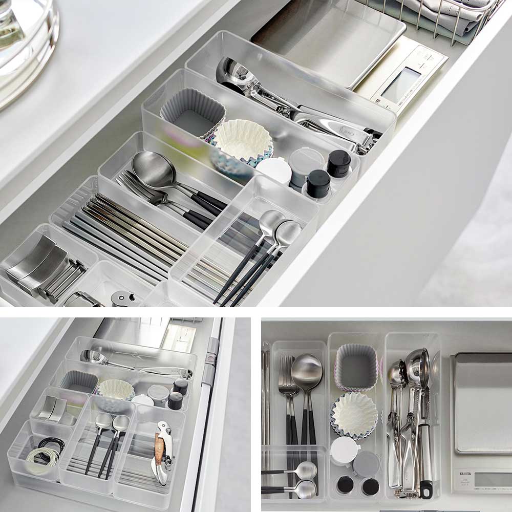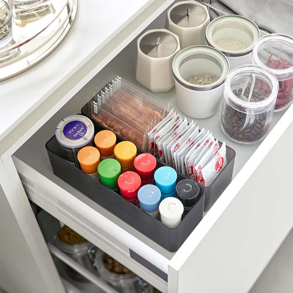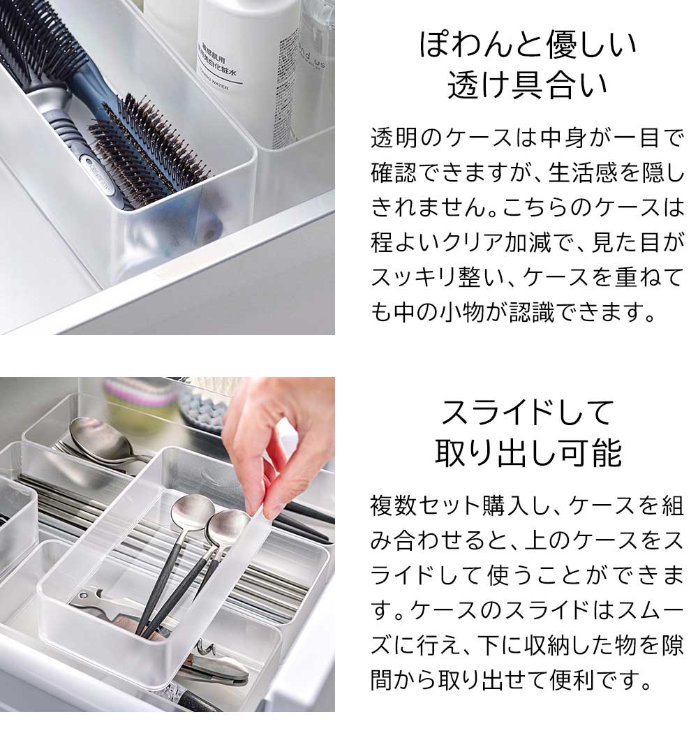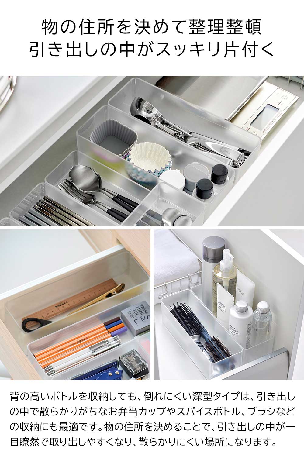縦横に並べて、上に重ねられるスクエア型収納ケース深型。引き出しの中で散らかりがちなお弁当カップやスパイスボトル、ブラシなどの収納に最適です。縦や横に2個並べても収まりの良いサイズで、ケースをスタッキングすることもできます。ケースを縦に3個並べ、その上に横にしたケースを1個重ねると、スタッキングしたケースをスライドして使用できるので、隙間から物を取り出せて便利です。また背の高いボトルを収納しても、倒れにくい深型タイプなので、引き出しの整理整頓に大活躍します。