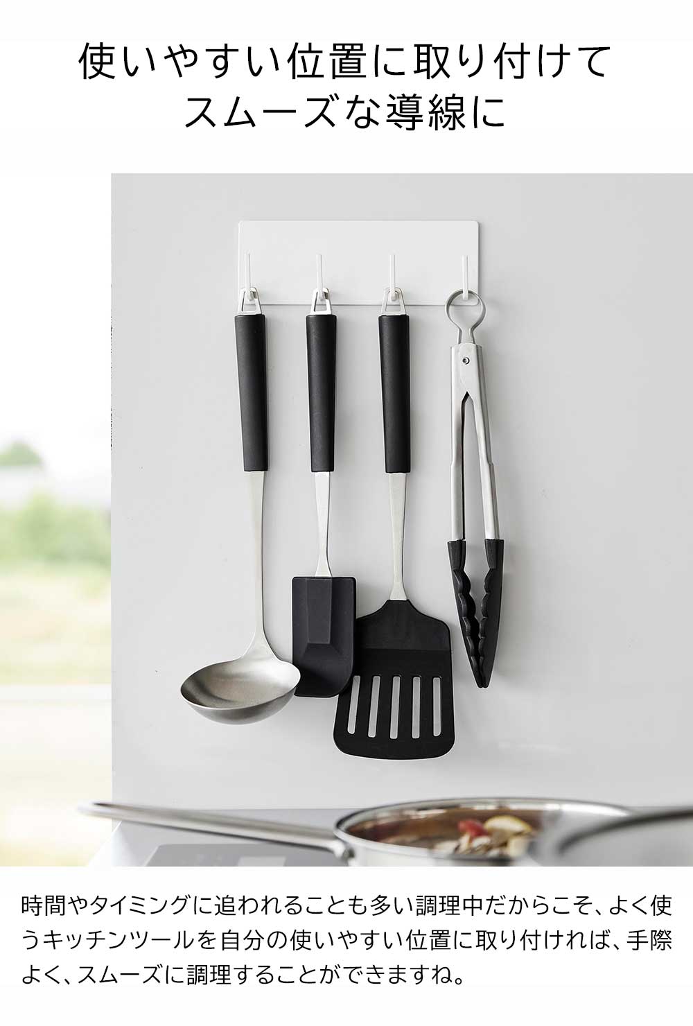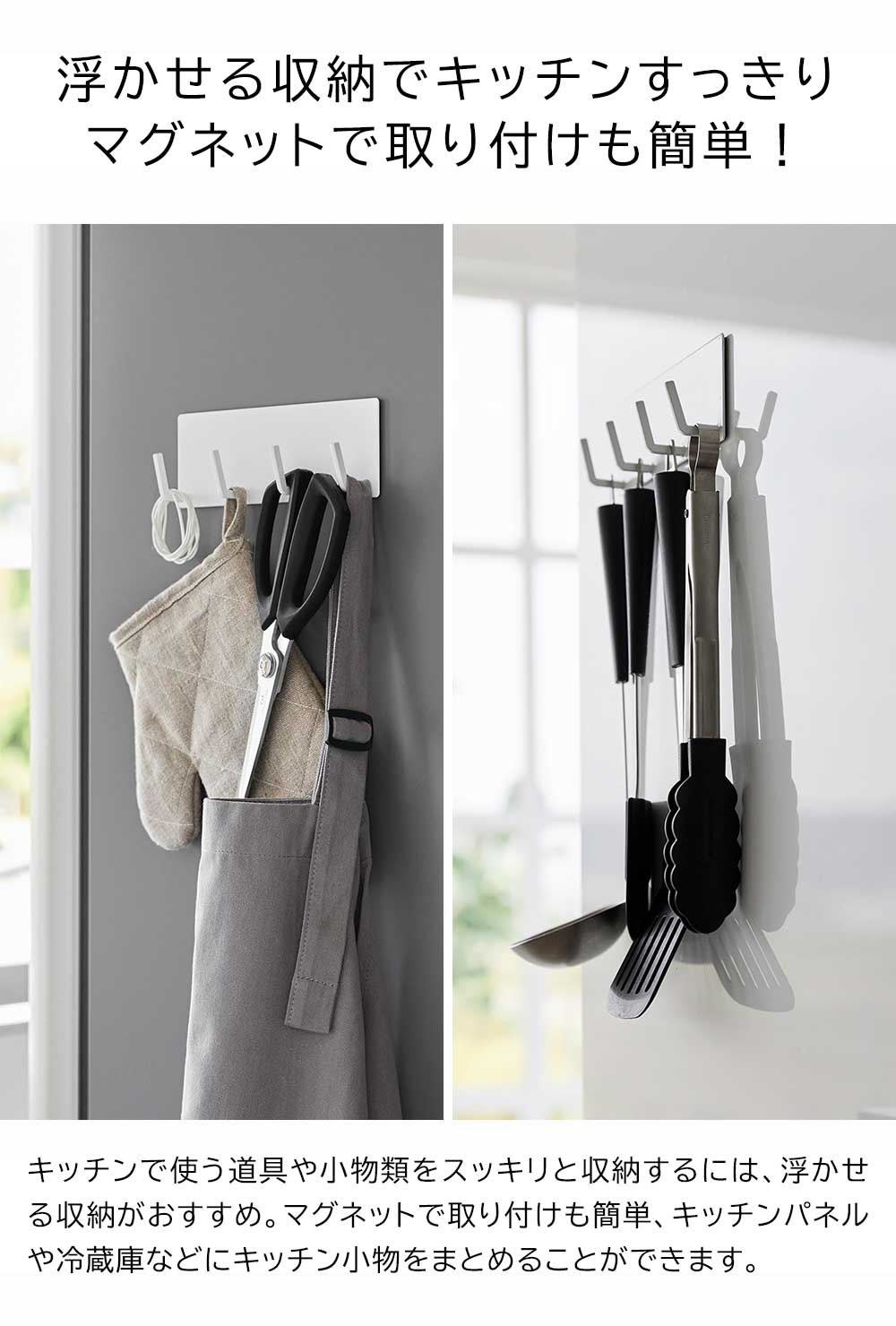 マグネットで浮かせる収納 キッチンは限られたスペースながら、いろんな調理器具や小物など、様々な物が多くなり整理整頓も大変です。毎日使うスペースだからこそ、スッキリと使いやすいキッチンで過ごしたい。そんな時は、キッチンツールフックの出番です。マグネットでキッチンパネルや冷蔵庫横にペタリと取り付けも簡単。好きな位置に取り付けできるので、よく使うキッチンツールなども、自分の使い勝手の良い位置に吊るして収納すれば、調理もスムーズに。また、シンプルなデザインなので冷蔵庫横に掛けてエプロンやミトン、キッチンばさみなども吊るして収納できます。 ![]() ![]() ![]() ![]() ![]() ![]() ![]() ![]() ![]() ![]() |
