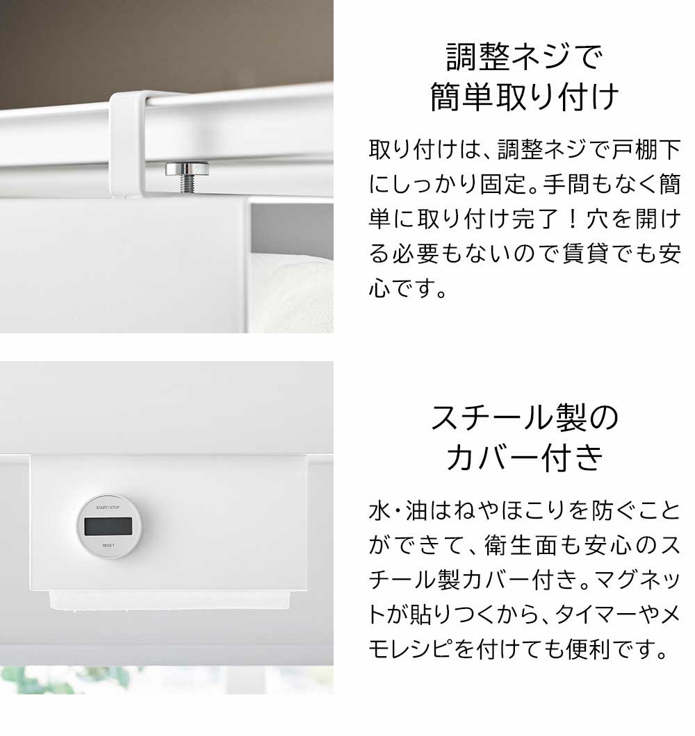 戸棚下に吊り下げて便利 日常でよく使う、ロールタイプのキッチンペーパーの使い勝手をもっと良くしたい!そんな時は、戸棚下の空いてるスペースに吊り下げて使える、カバー付きの戸棚下キッチンペーパーホルダーがおすすめです。カバー付きだから、ホコリ、水や油はねを防いでくれて安心。ロール状のキッチンペーパーで煩わしいペーパーカットも、カバー裏側についたシリコーンストッパーがあることで、片手でも簡単にカットできて便利!ペーパーホルダーの左右どちらからでもキッチンペーパーを差し込めるのでセットや交換も簡単です。 ![]() ![]() ![]() ![]() ![]() ![]() ![]() ![]() ![]() ![]() ![]() ![]() ![]() |