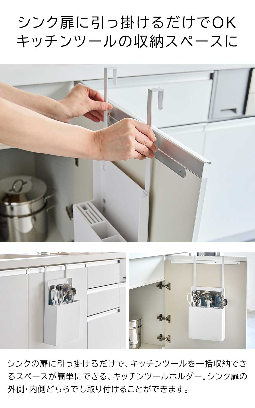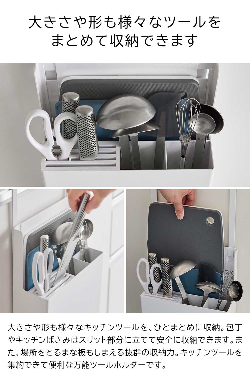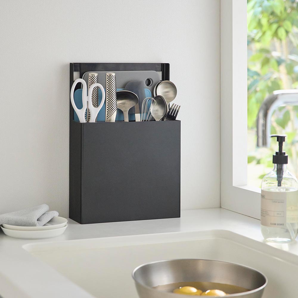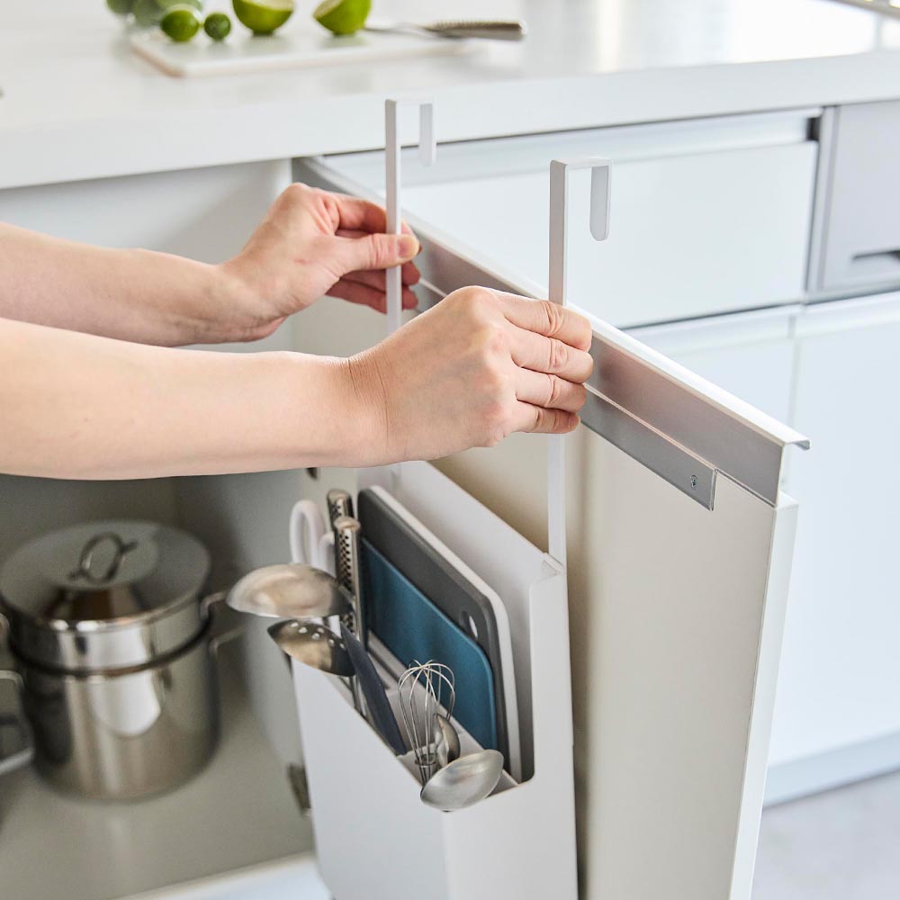 シンク扉に引っ掛けるだけ 様々な形や大きさのキッチンツールを、ひとまとめに集約できる便利なキッチンツールホルダーで、キッチン周りをスッキリと使いやすく整理整頓しましょう!取り付けは簡単、シンク扉に引っ掛けるだけでOK。内扉・外扉、両方で使えます。引っ掛けフックは3段階で長さが調節可能。ご自宅のシンク扉に合わせて調節できます。フックを外しても自立するので、シンク上や引き出しの中でツールスタンドとして使えます。包丁やキッチンばさみなど、刃物はスリット部分に入れて安全に収納。場所をとるまな板もスッキリと収納できる省スペースな設計も嬉しいポイントです。 ![]() ![]() ![]() ![]() ![]() ![]() ![]() ![]() ![]() ![]() ![]() ![]() ![]() |
