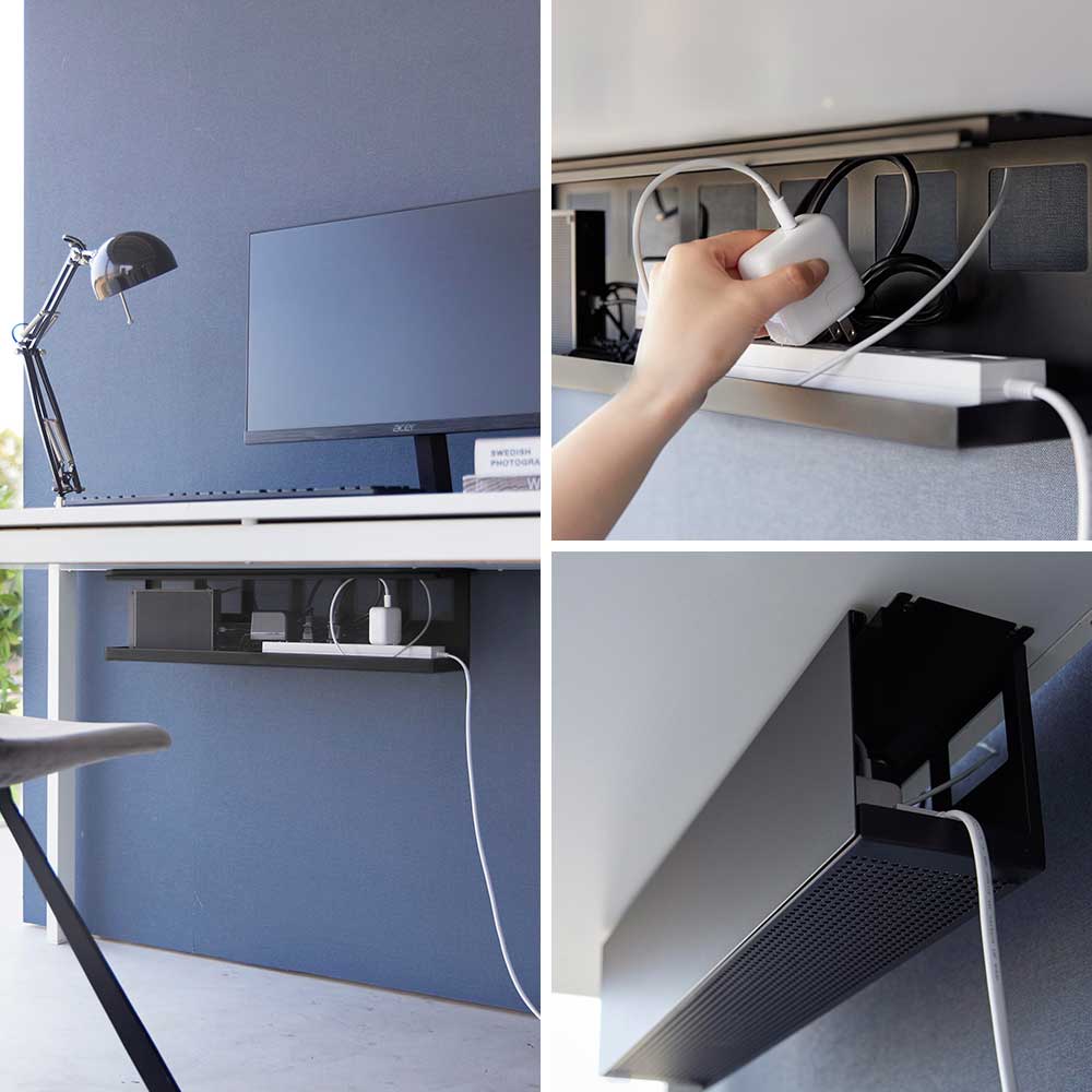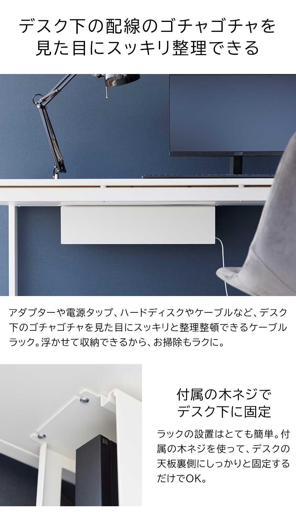電源タップや配線ケーブルを 電源タップやアダプター、配線や充電ケーブルなど、デスク下がゴチャゴチャでなんだかスッキリしない!そんな時は、デスク下の天板裏に浮かせて収納できるケーブルラックが便利です。付属の木ネジでとめるだけで設置完了。あとはラックに収納してカバーを取り付けるだけでOK!前面のカバーは着脱が簡単なので、ケーブルやアダプターを追加、配置を変えたりと、すぐに対応できます。また、ラックの背面には小窓があるので、ゴチャゴチャをかくしつつ、配線をスムーズに。ラックの底面は穴が開いていて熱がこもりにくいのも大事なポイントです。シンプルなデザインなので、床置きで使用してもインテリアにスッとなじみます。ケーブル上部の両端には、充電ケーブル端子を見失わないよう、ケーブルを固定できるスリットもあり便利です。 ![]() ![]() ![]() ![]() ![]() ![]() ![]() ![]() ![]() ![]() ![]() ![]() |