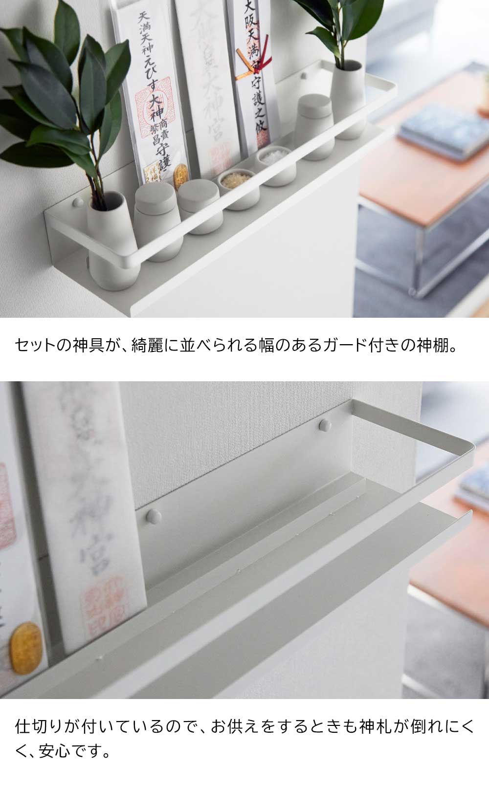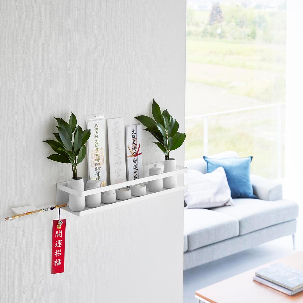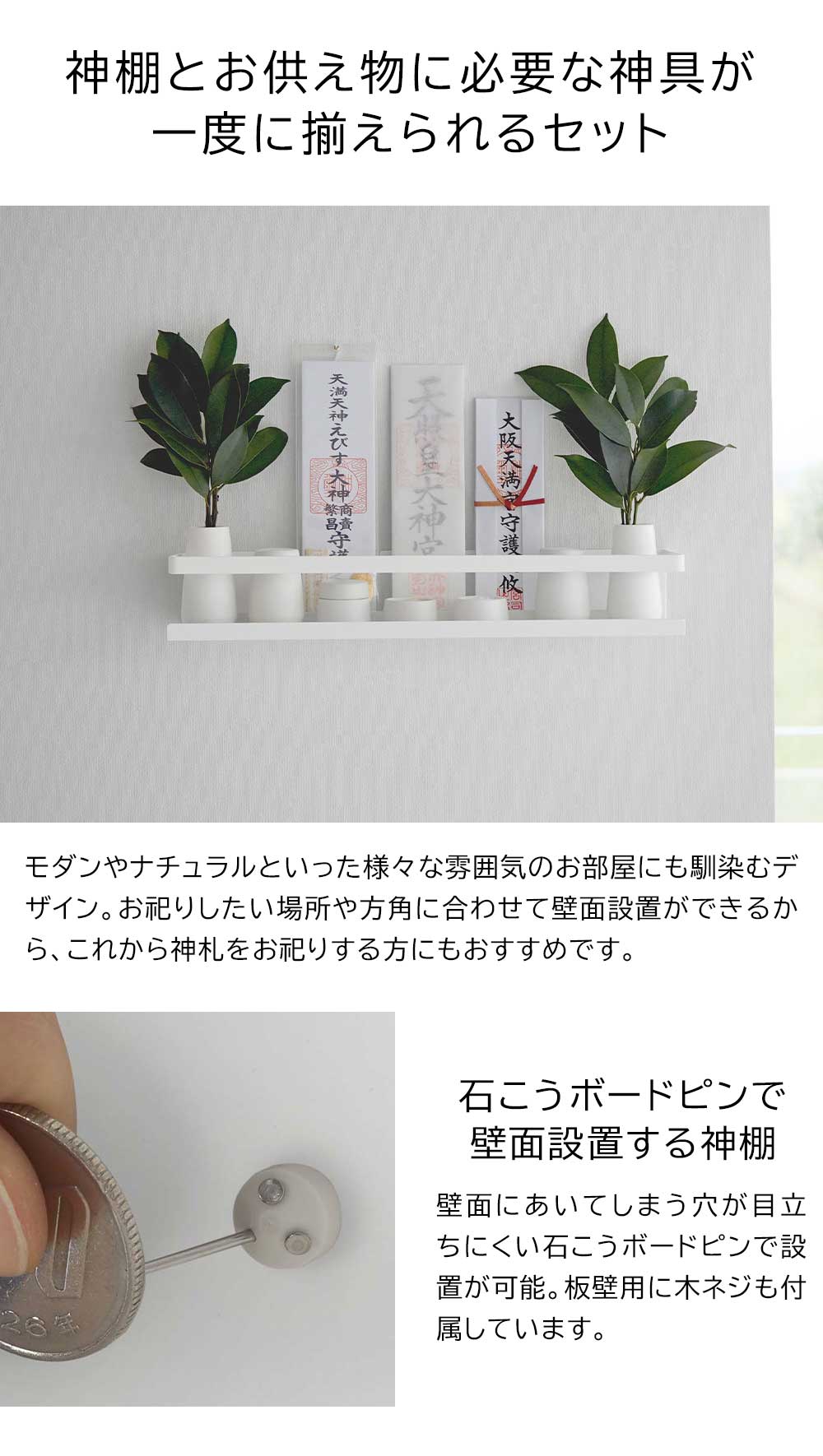 壁面に簡単設置ができる 壁面を有効活用しながら、お好みの場所に気持ちよく神札を祀ることができる、神棚と神具のセットです。お部屋に馴染むスチール製のスタイリッシュなデザイン。神棚には、ガードがあり神具の落下を防げます。また、神札が立つように工夫された仕切りがあり、お供えの際に神札が倒れてしまう心配がありません。神具7点は、上品な雰囲気の陶器製。設置は壁面の穴が最小限に抑えられる石こうボードピンで取り付けるから、賃貸などでも壁面にあいてしまう穴を気にせず取り付けられます。お供え物に必要な神具を一度に揃えられるので、これから神札をお祀りする方にもおすすめです。 ![]() ![]() ![]() ![]() ![]() ![]() ![]() ![]() ![]() |