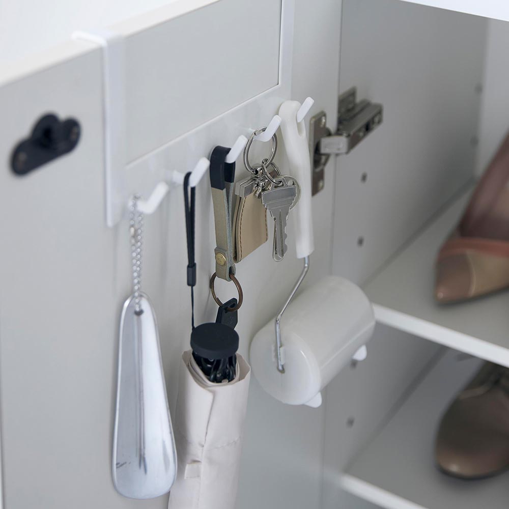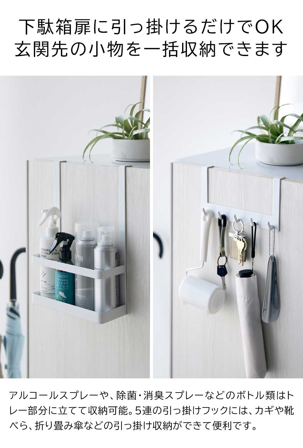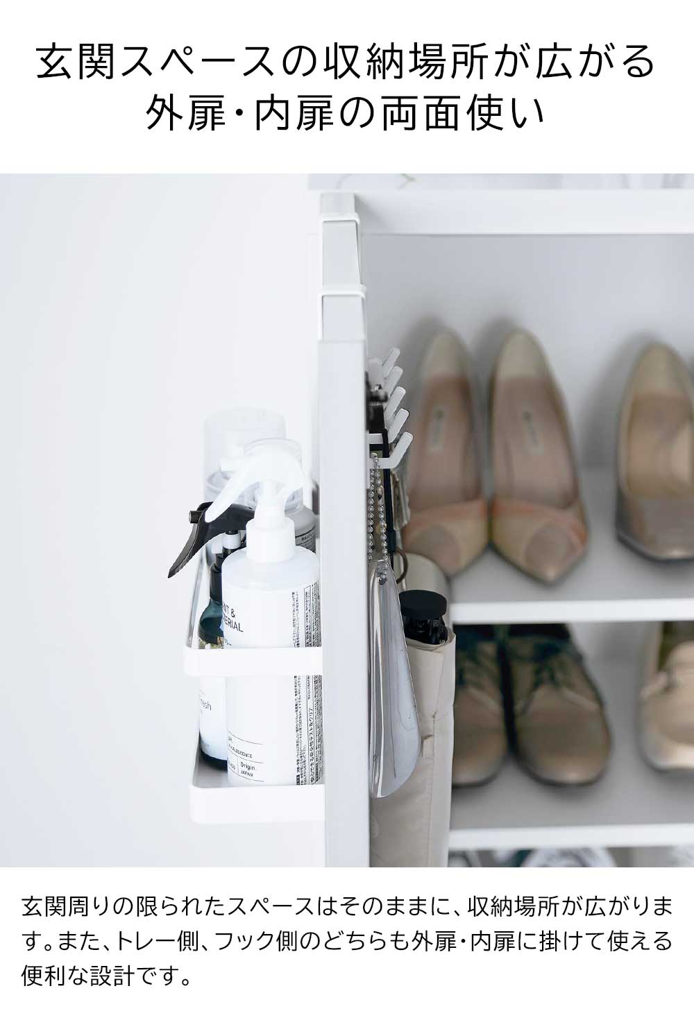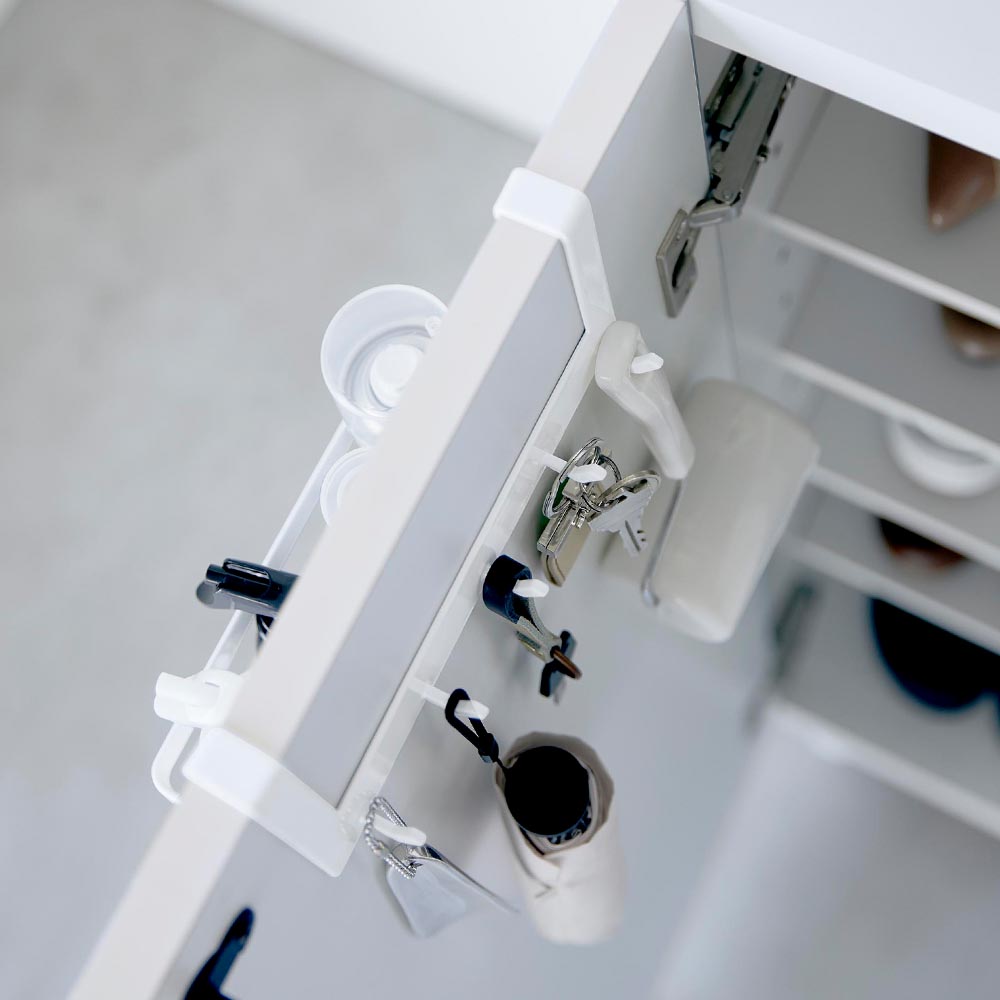 下駄箱扉を両面使って カギや靴べら、アルコールスプレーや除菌消臭スプレーなど、お出かけ前や帰宅後に使う小物が意外とたくさんある玄関先。引っ掛けフック&ツールホルダーは、下駄箱扉の内扉・外扉を両面使って、玄関周りの収納場所を広げてくれる画期的なアイテム。ボトル類は立てて収納できるトレー側に、カギや靴べらなどはフック側に引っ掛け収納と、多様な小物類を一括収納できます。取り付けも簡単、下駄箱の扉に引っ掛けるだけでOK。フック側、トレー側はそれぞれの使い方に合わせて外扉・内扉の両方に設置できるので便利です。 ![]() ![]() ![]() ![]() ![]() ![]() ![]() ![]() ![]() |