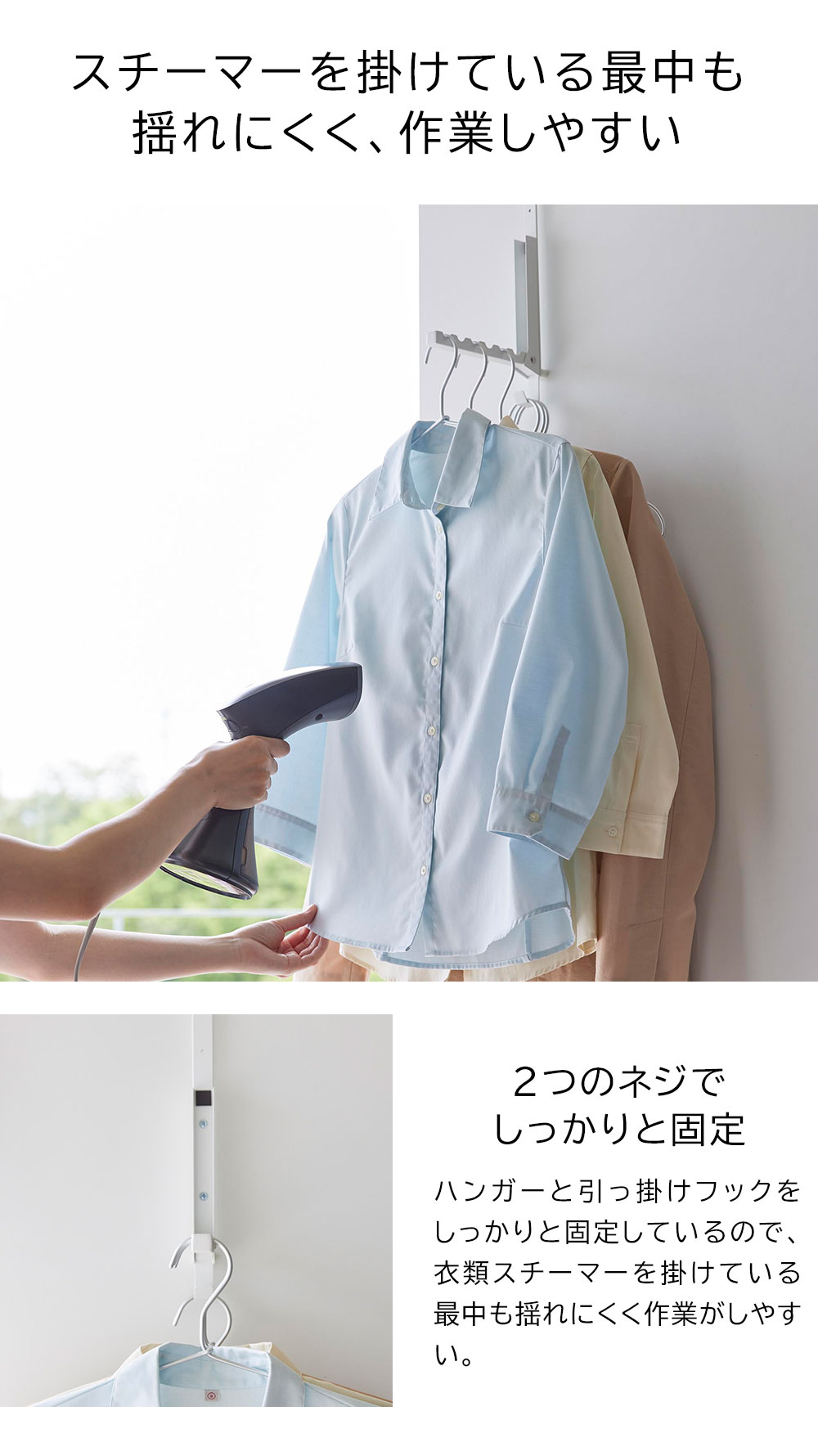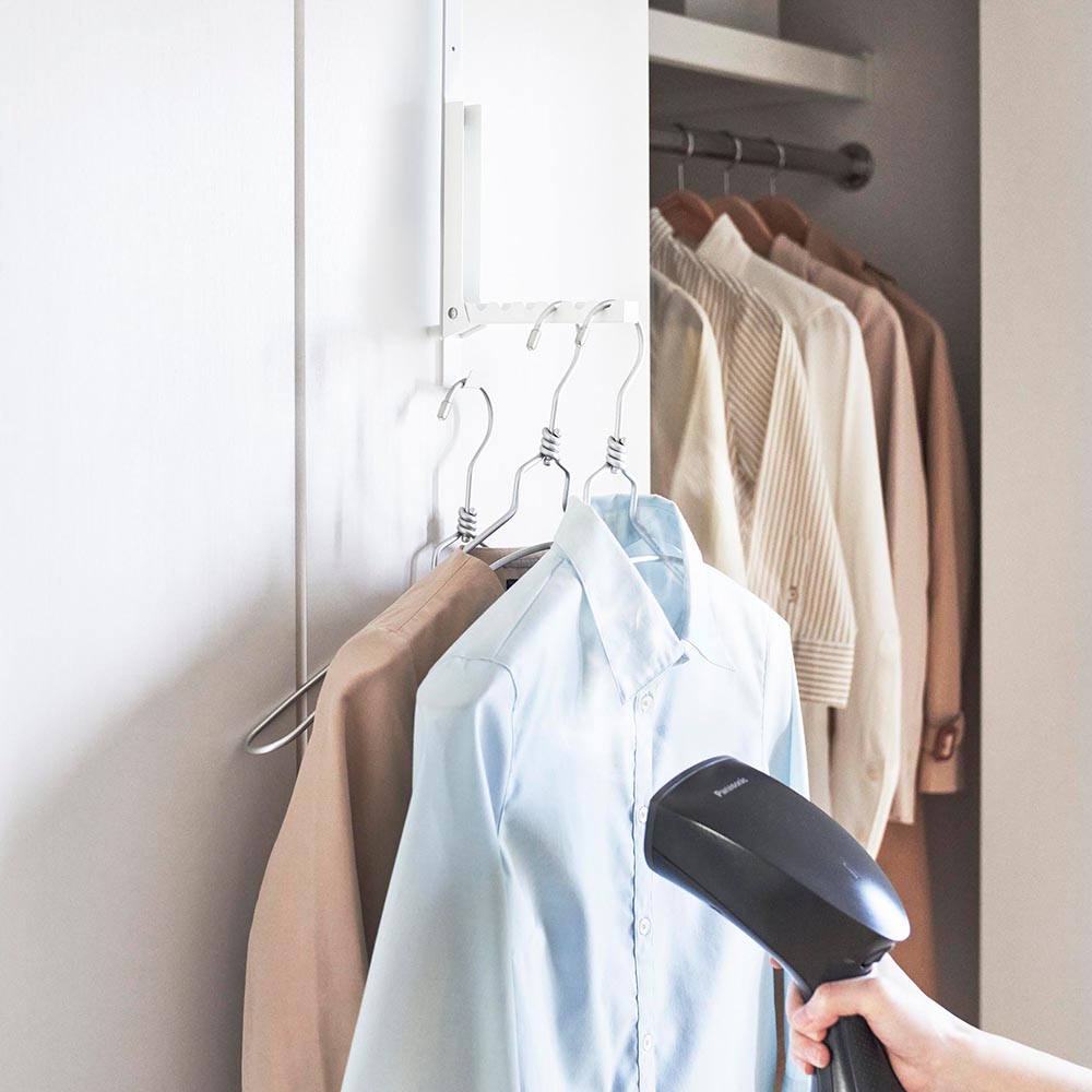 ドアに掛けるだけで設置完了 お出かけ前や後のしわ取りなど、気軽にサッと衣類スチーマーを使う時に便利なドアハンガーです。取り付けは簡単、ドアに引っ掛けるだけ。クローゼットの折れ戸にも掛けられます。ハンガー本体はフックに2つのネジでしっかりと固定され、スチーマーを掛けている最中も揺れにくくなっています。また、ハンガーの高さは4段階で調整できるので、ドアの高さや身長に合わせることができます。ハンガーの下部にあるフックには使っていないハンガーやリネンスプレーなどの引っ掛け収納も可能。ハンガーを使わない時は折り畳んでスリムに収納ができ、場所をとらない便利な設計です。付属の木ネジを使用して壁面に直接取り付けることもできます。 ![]() ![]() ![]() ![]() ![]() ![]() ![]() ![]() ![]() ![]() ![]() |