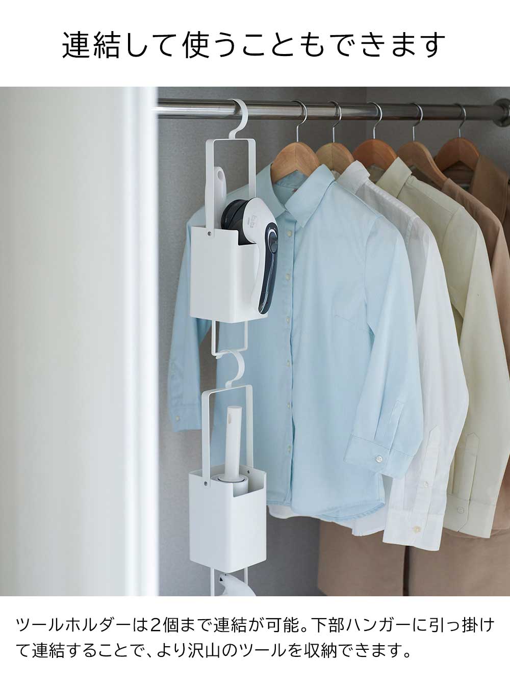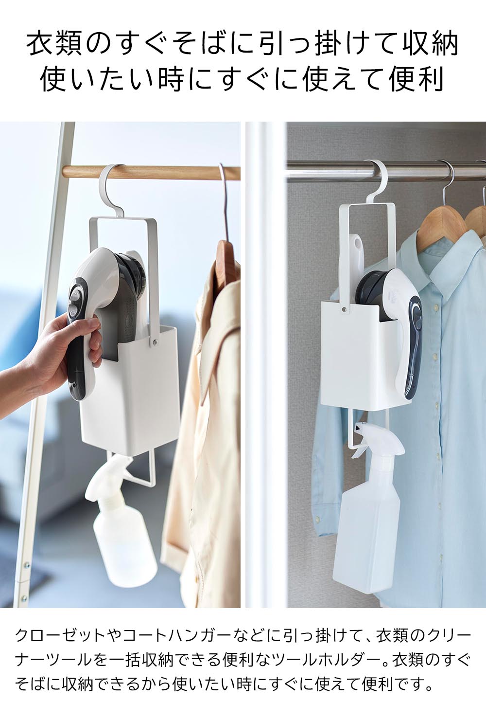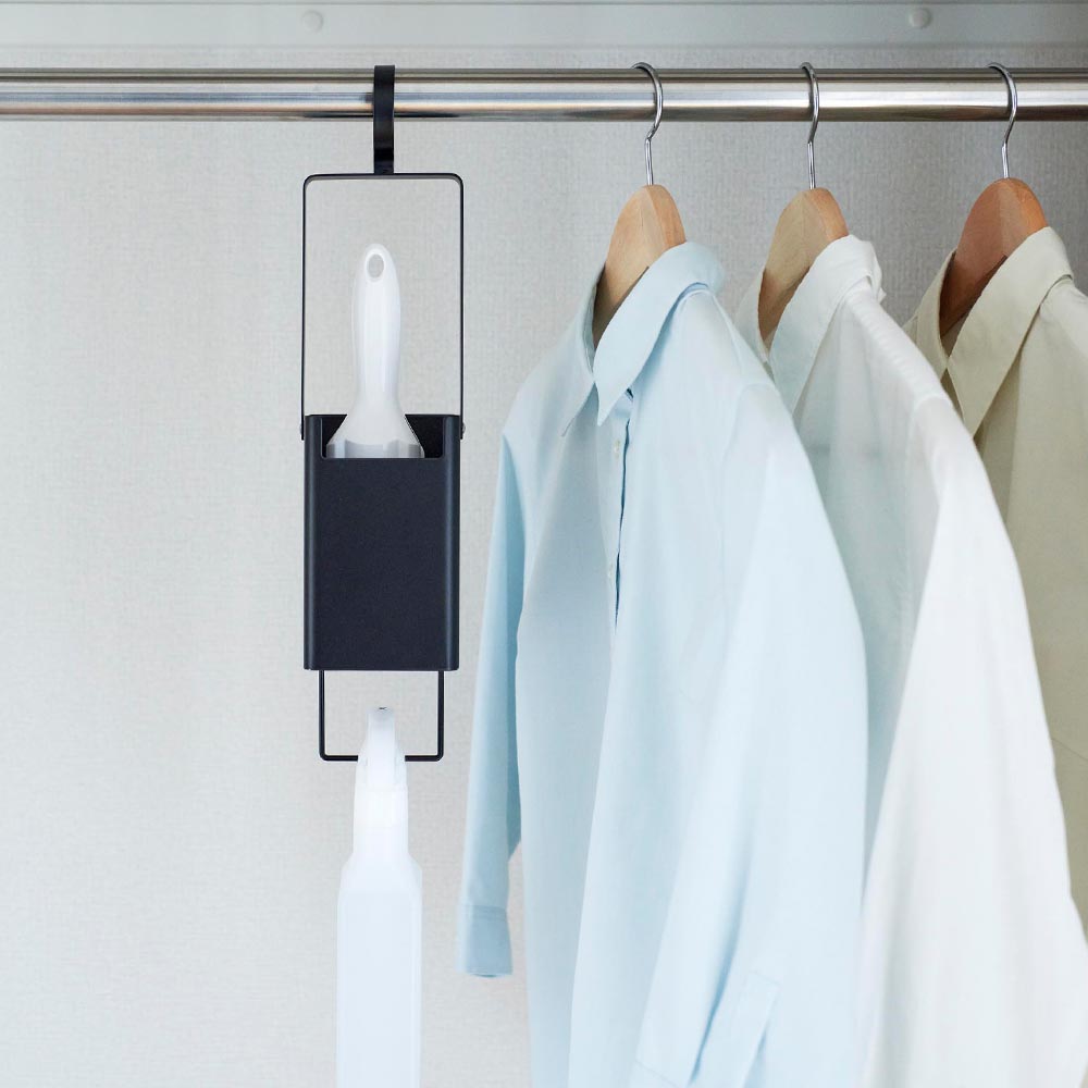 毛玉取りや衣類用ブラシ、粘着テープなどを一括収納できる、衣類用クリーナーツールの収納ホルダーが便利!クローゼットやコートハンガーなどに引っ掛けるだけで、クリーナーツールをスッキリと収納。衣類のすぐそばに収納するから、使いたい時にサッと使えて便利です。また、収納するツールに合わせてサイズを変えられるマグネット固定式の仕切り板付き。仕切り板がある事で、ホルダーの中でツールが倒れるのを防いでくれます。ホルダー下部のハンガーは、消臭スプレーボトルを引っ掛けたり、収納ホルダーを連結して2個使いも可能です。