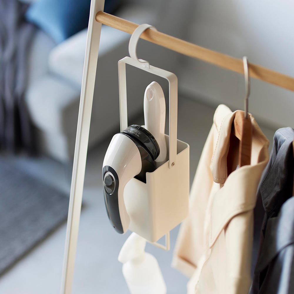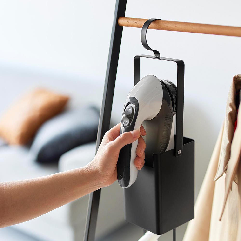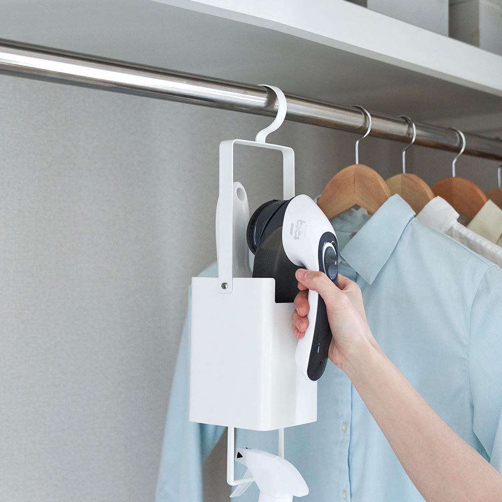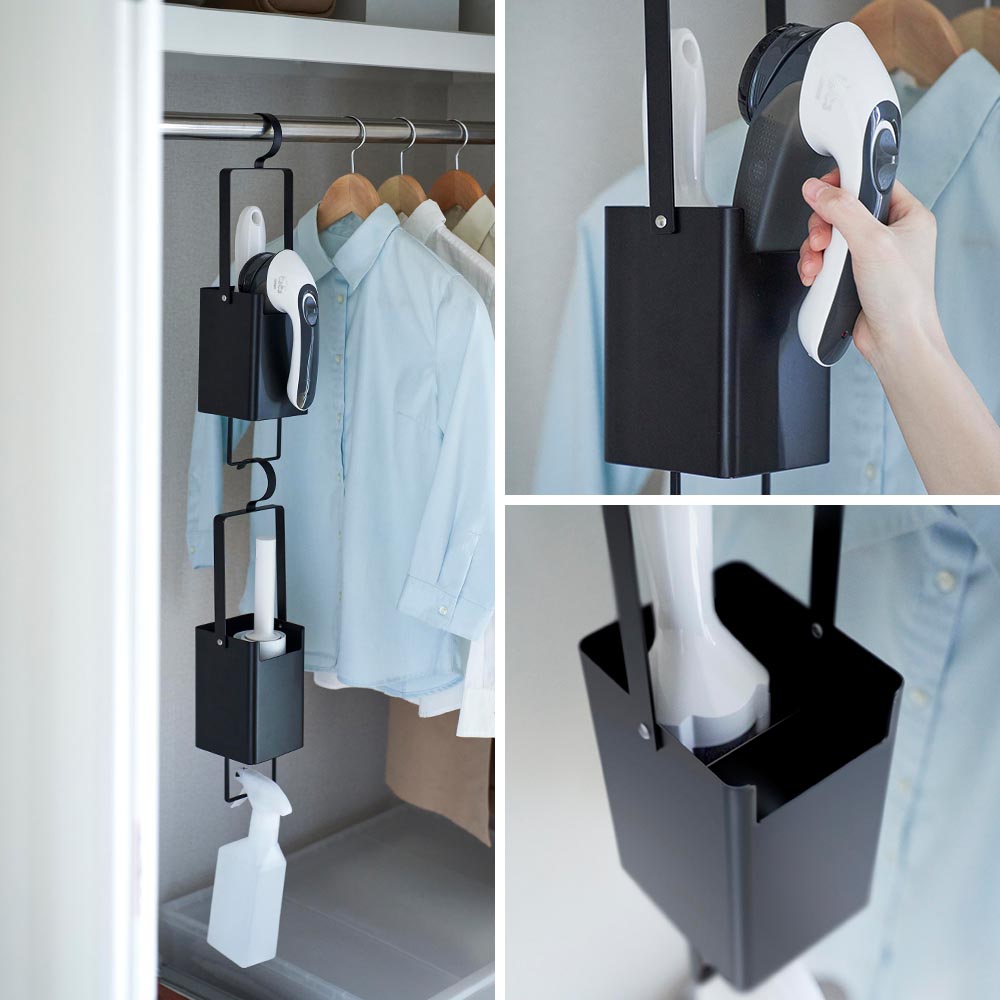 毛玉取りや衣類用ブラシ、粘着テープなどを一括収納できる、衣類用クリーナーツールの収納ホルダーが便利!クローゼットやコートハンガーなどに引っ掛けるだけで、クリーナーツールをスッキリと収納。衣類のすぐそばに収納するから、使いたい時にサッと使えて便利です。また、収納するツールに合わせてサイズを変えられるマグネット固定式の仕切り板付き。仕切り板がある事で、ホルダーの中でツールが倒れるのを防いでくれます。ホルダー下部のハンガーは、消臭スプレーボトルを引っ掛けたり、収納ホルダーを連結して2個使いも可能です。
