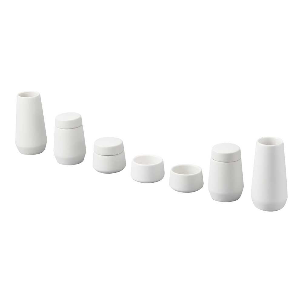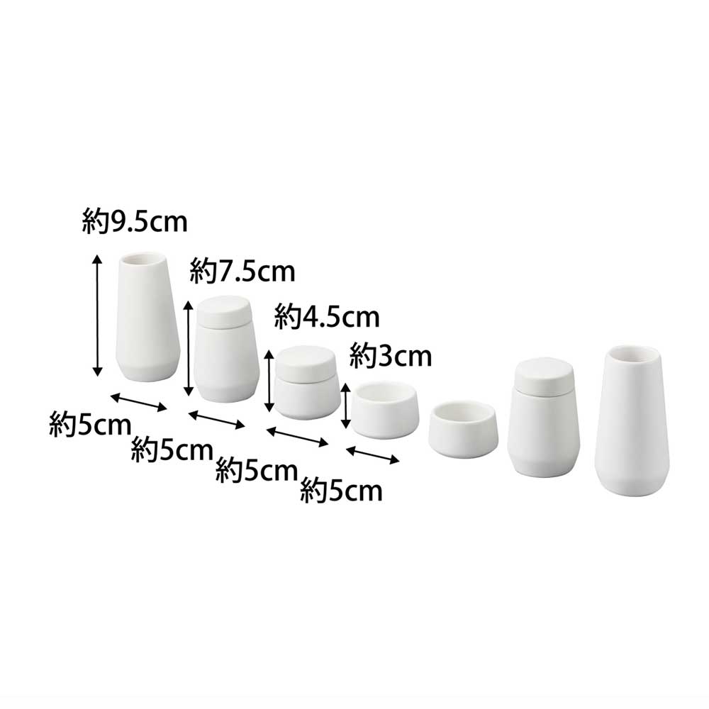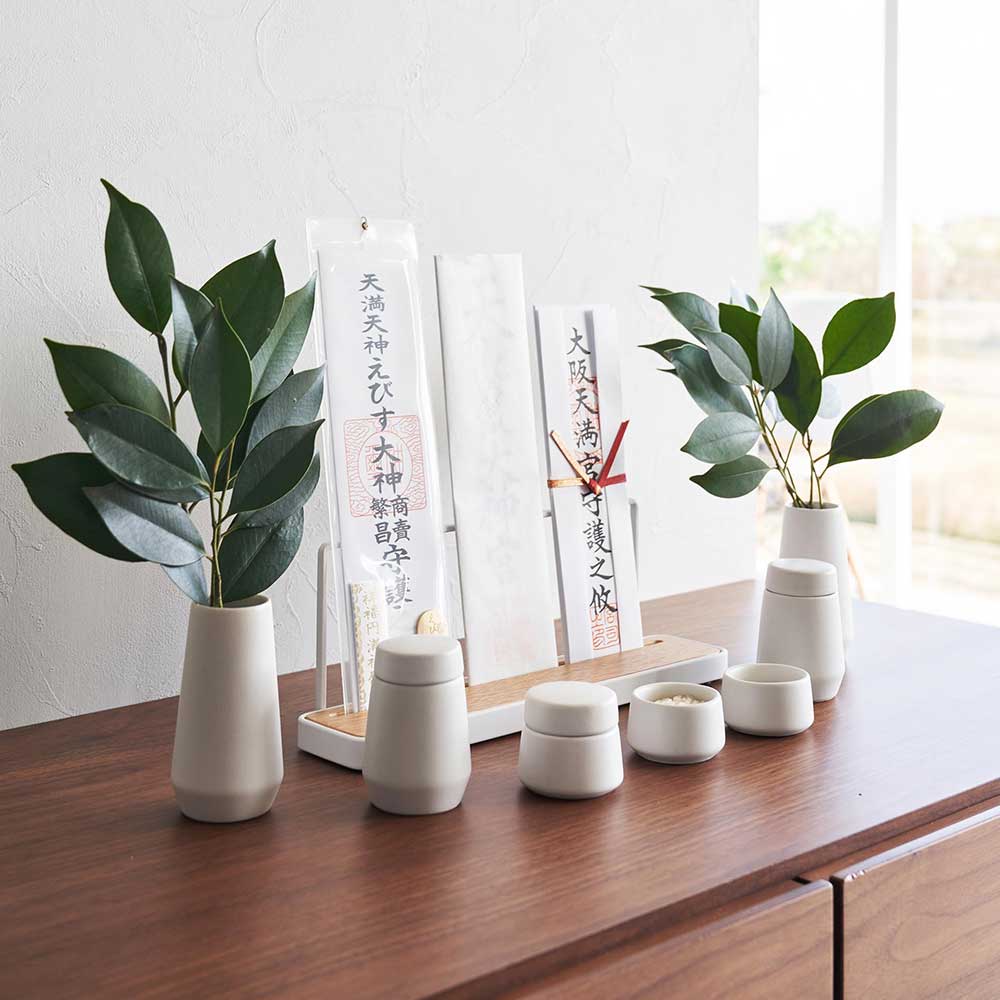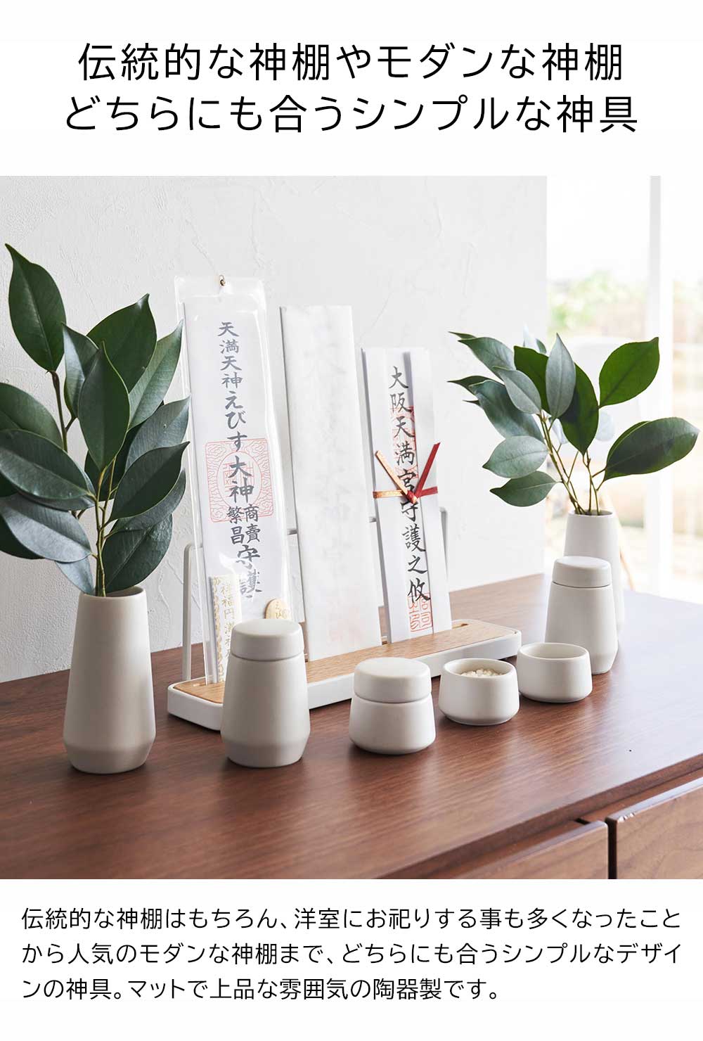 伝統的な神棚はもちろん、洋室にお祀りすることも多くなったことで人気となったモダンな神棚まで、どちらにもよく合う、神具7点セット。マットで上品な雰囲気の陶器製、無駄を一切そぎ落としたシンプルなデザインです。お供え物に必要な神具を一度に揃えられるので、これから神棚をお祀りする方も、神具を新調したい方にもおすすめいたします。