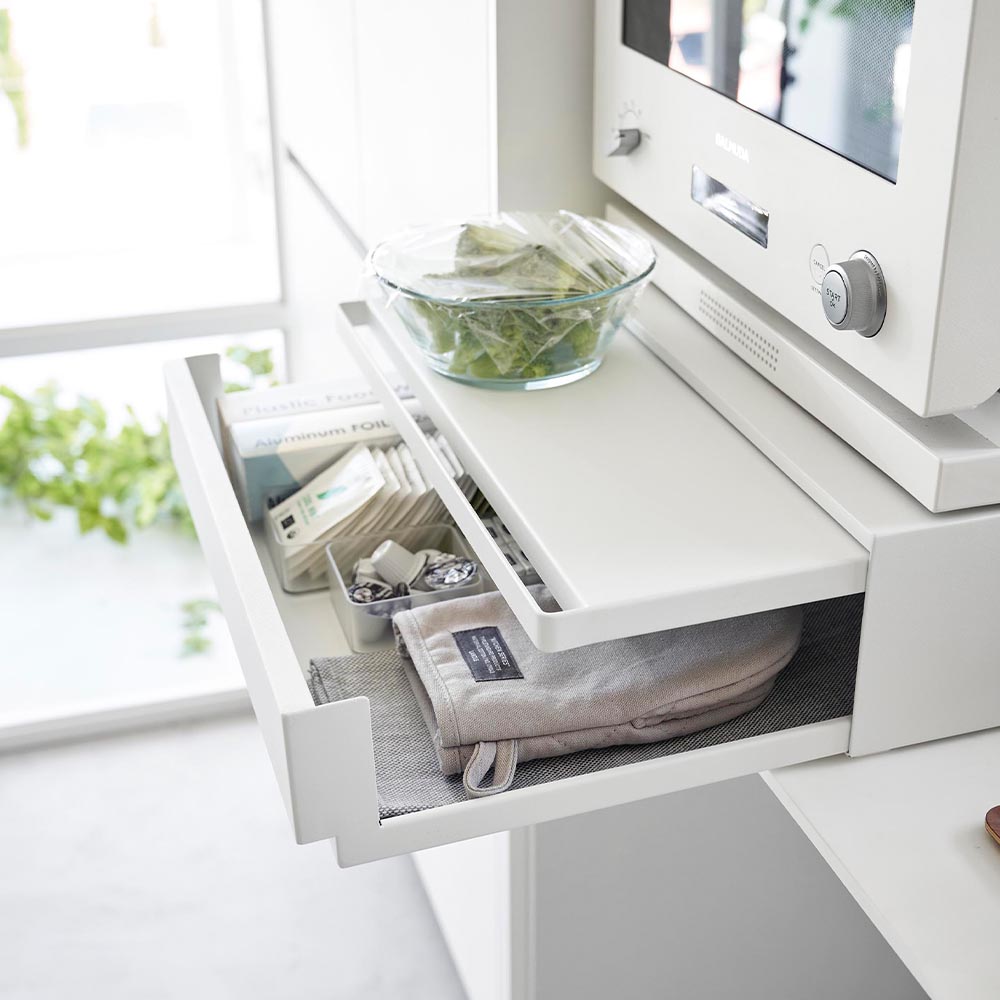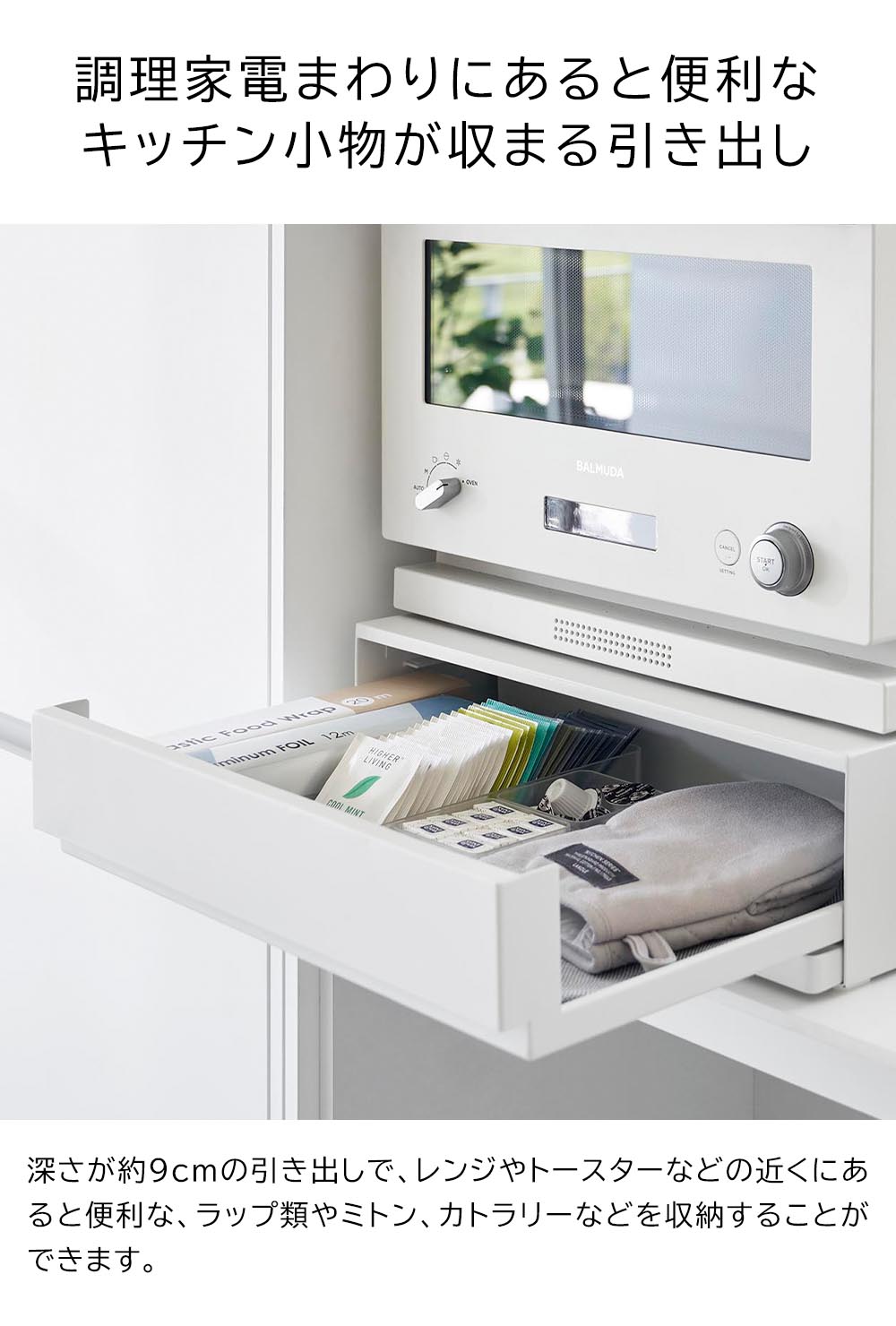 小物を収納できる引き出しと 調理家電まわりで必要なラップ類やミトンなどが収まる収納力抜群の引き出しと、必要な時にだけサッと使えるテーブルの2段式ラックです。上下段の入れ替えが可能なツーウェイ設計だから、お好みに合わせてお使いいただけます。調理家電の下に設置すれば、キッチンの限られたスペースでもスマートに整理整頓ができます。 ![]() ![]() ![]() ![]() ![]() ![]() ![]() ![]() ![]() ![]() |