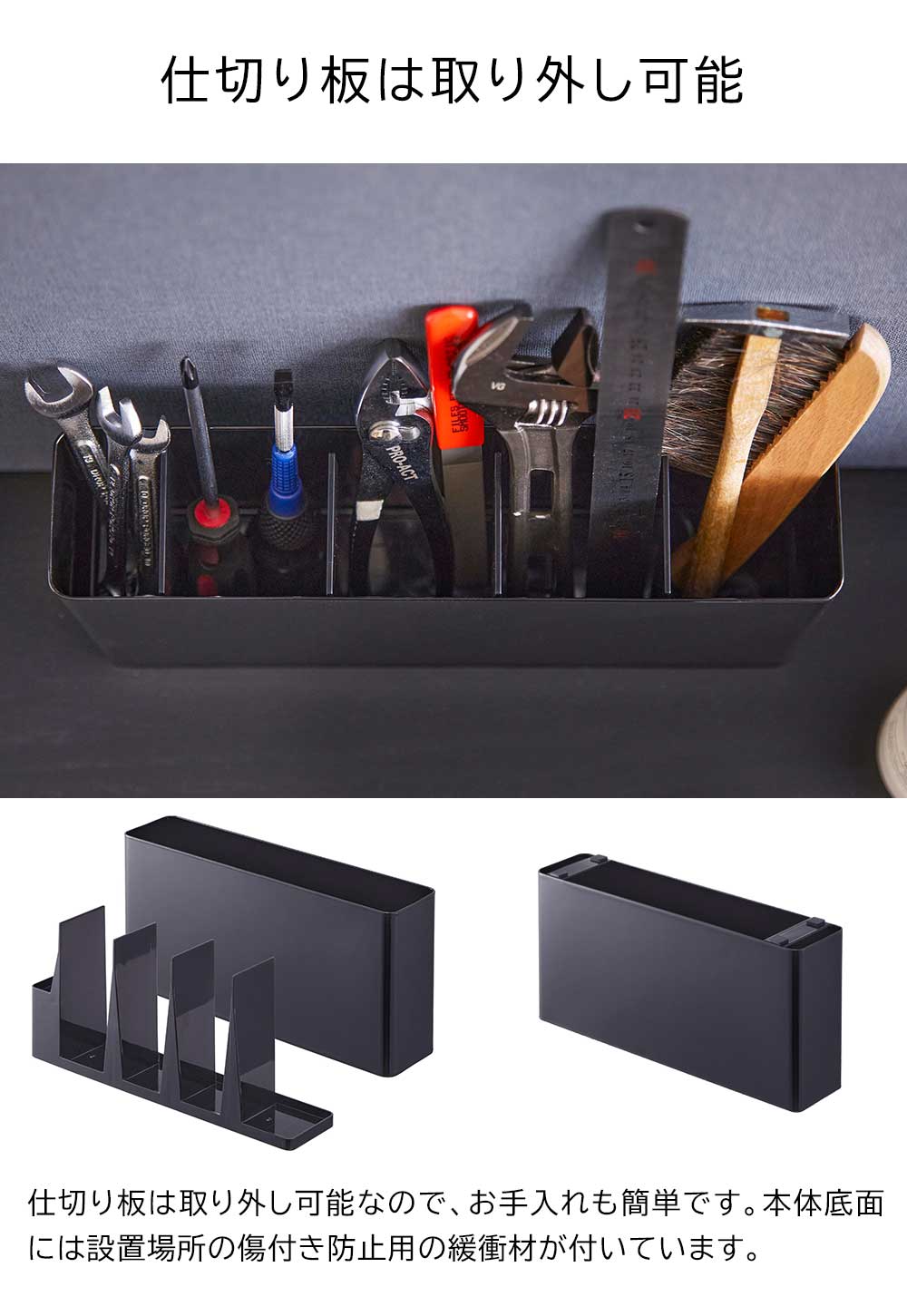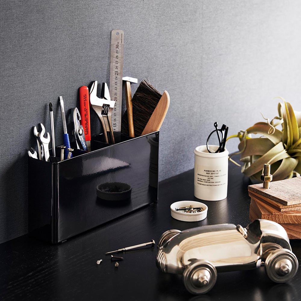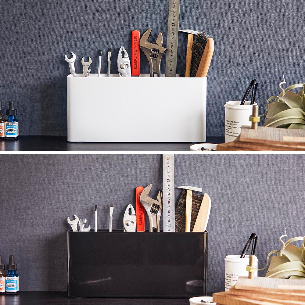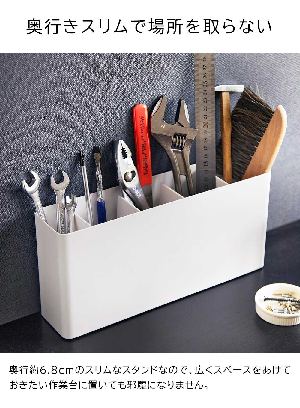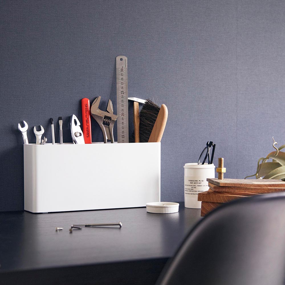 手に取りやすい場所に 趣味のクラフトやDIYなどで使用する沢山の工具類を、立てて分別収納できるスタンドです。奥行きがスリムだから、広くスペースをあけておきたい作業台に置いても邪魔になりません。 スタンドの中には仕切り板がセットされており、5つの枠に分けられています。左端の枠は上げ底になっており、背の低い工具などを取り出しやすい高さで収納できるようになっています。 また、仕切り板(右3枚)の奥にはスリットが入っているので、紙やすりのような薄くて幅広のアイテムなども収納できます。 ![]() ![]() ![]() ![]() ![]() ![]() ![]() ![]() ![]() ![]() ![]() |