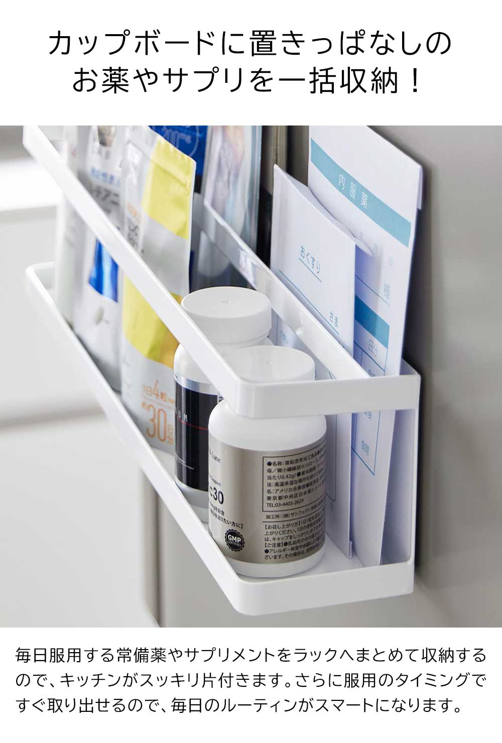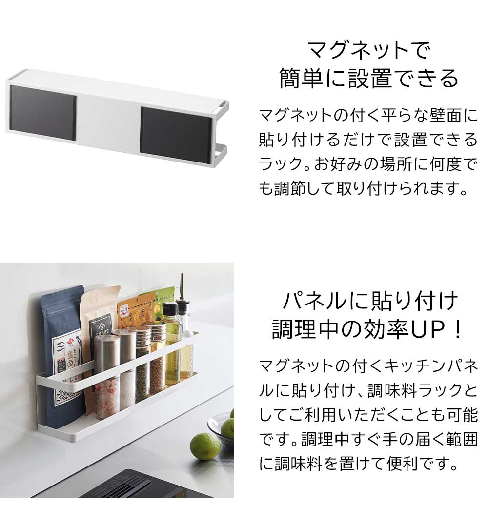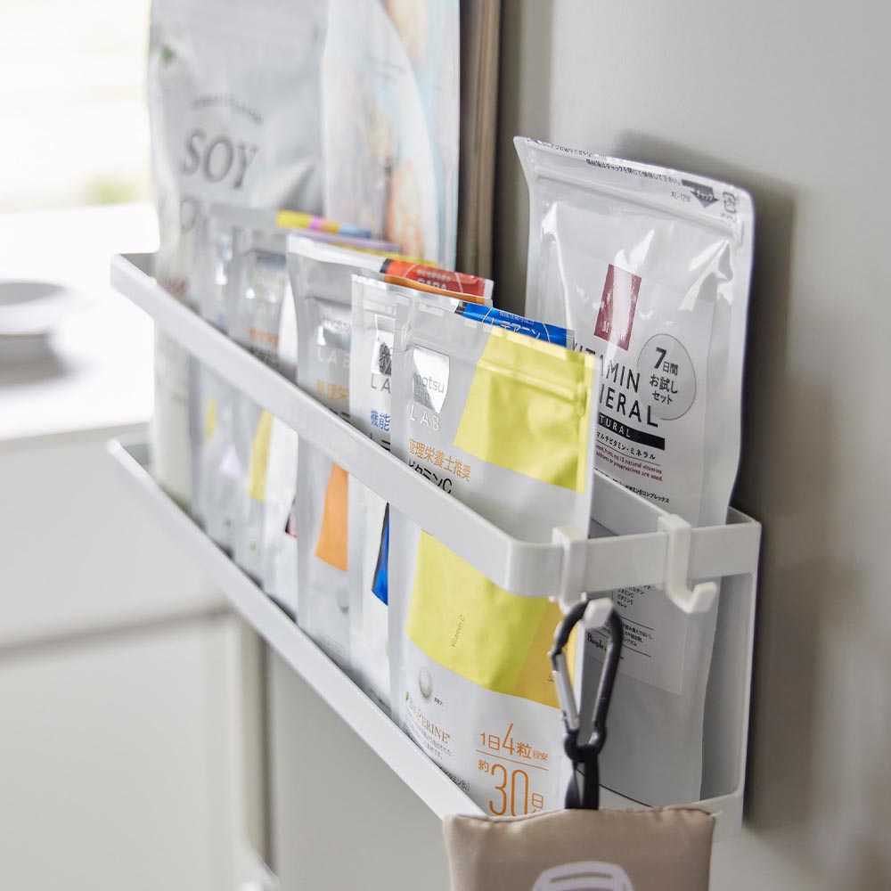 マグネットでペタッ! 毎日使うけれど、キッチンに出しっぱなしにはしたくない常備薬やサプリメントをワンアクションで収納できるラック。マグネットの付く壁面に簡単に貼り付けられます。ラックは奥行8cmとスリムなので、冷蔵庫横のちょっとした隙間を有効活用でき、スパイス、ふりかけ、サプリ、常備薬などをまとめて収納すればキッチンがスッキリ整います。付属のフックに、ミトンやエコバックなどを掛けて収納も可能です。 ![]() ![]() ![]() ![]() ![]() ![]() ![]() ![]() ![]() ![]() |